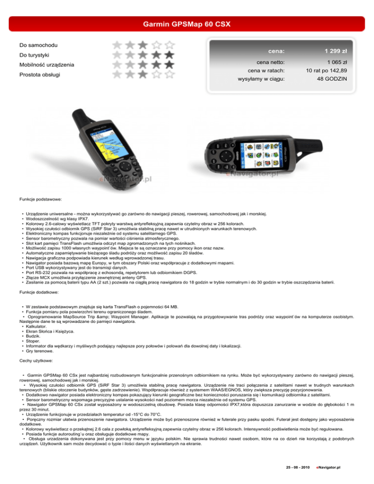 Garmin GPSMap 60 CSX Do samochodu Do turystyki Mobilność urządzenia Prostota obsługi cena: 1 299 zł cena netto: 1 065 zł cena w ratach: 10 rat po 142,89 wysyłamy w ciągu: 48 GODZIN Funkcje podstawowe: • • • • • • • • • • • • • • • Urządzenie uniwersalne - można wykorzystywać go zarówno do nawigacji pieszej, rowerowej, samochodowej jak i morskiej. Wodoszczelność wg klasy IPX7. Kolorowy 2.6-calowy wyświetlacz TFT pokryty warstwą antyrefleksyjną zapewnia czytelny obraz w 256 kolorach. Wysokiej czułości odbiornik GPS (SiRF Star 3) umożliwia stabilną pracę nawet w utrudnionych warunkach terenowych. Elektroniczny kompas funkcjonuje niezależnie od systemu satelitarnego GPS. Sensor barometryczny pozwala na pomiar wartości ciśnienia atmosferycznego. Slot kart pamięci TransFlash umożliwia odczyt map zgromadzonych na tych nośnikach. Możliwość zapisu 1000 własnych waypoint`ów. Miejsca te są oznaczane przy pomocy ikon oraz nazw. Automatyczne zapamiętywanie bieżącego śladu podróży oraz możliwość zapisu 20 śladów. Nawigacja graficzna podpowiada kierunek według wprowadzonej trasu. Nawigator posiada bazową mapę Europy, w tym obszary Polski oraz współpracuje z dodatkowymi mapami. Port USB wykorzystywany jest do transmisji danych. Port RS-232 pozwala na współpracę z echosondą, repetytorem lub odbiornikiem DGPS. Złącze MCX umożliwia przyłączenie zewnętrznej anteny GPS. Zasilanie za pomocą baterii typu AA (2 szt.) pozwala na ciągłą pracę nawigatora do 18 godzin w trybie normalnym i do 30 godzin w trybie oszczędzania baterii. Funkcje dodatkowe: • W zestawie podstawowym znajduje się karta TransFlash o pojemności 64 MB. • Funkcja pomiaru pola powierzchni terenu ograniczonego śladem. • Oprogramowanie MapSource Trip & Waypoint Manager. Aplikacje te pozwalają na przygotowywanie tras podróży oraz waypoint`ów na komputerze osobistym. Następnie dane te są wprowadzane do pamięci nawigatora. • Kalkulator. • Ekran Słońca i Księżyca. • Budzik. • Stoper. • Informator dla wędkarzy i myśliwych podający najlepsze pory połowów i polowań dla dowolnej daty i lokalizacji. • Gry terenowe. Cechy użytkowe: • Garmin GPSMap 60 CSx jest najbardziej rozbudowanym funkcjonalnie przenośnym odbiornikiem na rynku. Może być wykorzystywany zarówno do nawigacji pieszej, rowerowej, samochodowej jak i morskiej. • Wysokiej czułości odbiornik GPS (SiRF Star 3) umożliwia stabilną pracę nawigatora. Urządzenie nie traci połączenia z satelitami nawet w trudnych warunkach terenowych (bliskie otoczenie budynków, gęste zadrzewienie). Współpracuje również z systemem WAAS/EGNOS, który zwiększa precyzję pozycjonowania. • Dodatkowo nawigator posiada elektroniczny kompas pokazujący kierunki geograficzne bez konieczności poruszania się i komunikacji odbiornika z satelitami. • Sensor barometryczny wspomaga precyzyjne ustalanie wysokości nad poziomem morza niezależnie od systemu GPS. • Nawigator GPSMap 60 CSx został wyposażony w wodoszczelną obudowę. Posiada klasę odporności IPX7,która dopuszcza zanurzanie w wodzie do głębokości 1 m przez 30 minut. • Urządzenie funkcjonuje w przedziałach temperatur od -15°C do 70°C. • Poręczny rozmiar ułatwia przenoszenie nawigatora. Urządzenie może być przenoszone również w futerale przy pasku spodni. Futerał jest dostępny jako wyposażenie dodatkowe. • Kolorowy wyświetlacz o przekątnej 2.6 cala z powłoką antyrefleksyjną zapewnia czytelny obraz w 256 kolorach. Intensywność podświetlenia może być regulowana. • Posiada funkcje autorouting`u oraz obsługuje dodatkowe mapy. • Obsługa urzadzenia dokonywana jest przy pomocy menu w języku polskim. Nie sprawia trudności nawet osobom, które na co dzień nie korzystają z podobnych urządzeń. Użytkownik sam może decydować o typie i ilości danych wyświetlanych na ekranie. 25 - 08 - 2010 eNavigator.pl • Garmin GPSMap 60 CSx umożliwia automatyczne bądź ręczne planowanie podróży. Funkcję automatycznego wytyczania trasy przejazdu wprowadzono z myślą o nawigacji samochodowej. Dzięki niej urządzenie samo wybierze trasę przejazdu do żądanego celu biorąc pod uwagę typ pojazdu oraz rodzaj połączenia (najszybsze, najkrótsze). Do wykorzystania tej funkcji wymagane są szczegółowe mapy dostępne opcjonalnie na kartach pamięci TransFlash. Oprócz tego użytkownik może samodzielnie zaplanować trasę podróży poprzez wskazanie sekwencji punktów pośrednich (waypoint'ów), z których ma się składać trasa. Waypoint`y to charakterystyczne miejsca w terenie, które mogą być zapisywane podczas podróży bądź wprowadzane do pamięci wewnętrznej wg współrzędnych geograficznych. Istnieje możliwość zapisu 1000 punktów i oznaczanie ich za pomocą kolorowych ikon i opisów tekstowych. Urządzenie może przechowywać 50 zapisanych tras. • Nawigacja prowadzona jest w sposób graficzny i przebiega wg wybranej trasy. Strzałka kompasu pokazuje prawidłowy kierunek ruchu. Zejście z kursu sygnalizowane jest alarmem dźwiękowym. • Funkcja rekalkulacji trasy pozwala na ponowne, w pełni automatyczne zaplanowanie nowej trasy do punktu celu, w sytuacji, gdy podróżny zboczy z wytyczonej drogi. • Bieżąca podróż (ślad) jest automatycznie rejestrowana i pokazywana na ekranie. • Urządzenie dysponuje funkcją TracBack, dzięki której możliwy jest powrót do punktu rozpoczęcia wyprawy. W pamięci może być zapisywanych 20 śladów (po 500 pkt. każdy). • Komputer podróży na bieżąco podaje prędkość ruchu, czas podróży oraz przebyty dystans. O aktualnym położeniu informują wyświetlane na ekranie współrzędne geograficzne oraz wysokość nad poziomem morza. • Port USB wykorzystywany jest do wymiany danych z komputerem osobistym. Umożliwia transmisję zapisanych w urządzeniu śladów, tras i waypointów oraz wprowadzanie do pamię