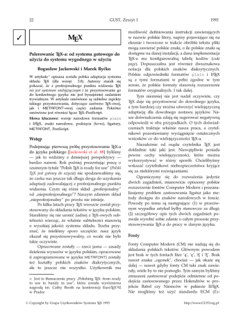 22 GUST, Zeszyt 1 MEX Polerowanie TEX-a: od systemu gotowego do użycia do systemu wygodnego w użyciu Bogusław Jackowski i Marek Ryćko W artykule ∗ opisana została polska adaptacja systemu składu TEX (dla wersji 3.0). Autorzy starali się pokazać, że z profesjonalnego punktu widzenia TEX nie jest systemem wielojęzycznym i że przystosowanie go do konkretnego języka nie jest bynajmniej zadaniem trywialnym. W artykule omówione są subtelne aspekty takiego przystosowania, dotyczące zarówno TEX-owej, jak i METAFONT-owej części zadania. Pokrótce omówione jest również łącze TEX–PostScript. Słowa kluczowe: wersje narodowe formatów plain i LATEX, znaki narodowe, podcięcia (kerns), ligatury, METAFONT, PostScript. Wstęp Podejmując pierwszą próbę przystosowania TEX-a do języka polskiego [Jackowski et al. 88] byliśmy — jak to widzimy z dzisiejszej perspektywy — bardzo naiwni. Rok poźniej prezentując pracę o szumnym tytule “Polish TEX is ready for use” (Polski TEX jest gotowy do użycia) nie spodziewaliśmy się, że czeka nas jeszcze tak długa droga do uzyskania adaptacji zadowalającej z profesjonalnego punktu widzenia. Czym się różni skład „profesjonalny” od „nieprofesjonalnego”? Naszym zdaniem skład „nieprofesjonalny” po prostu nie istnieje. Po kilku latach pracy TEX wreszcie został przystosowany do składania tekstów w języku polskim. Staraliśmy się nie uronić żadnej z TEX-owych subtelności wierząc, że właśnie subtelności stanowią o wysokiej jakości systemu składu. Trzeba przyznać, że mieliśmy sporo szczęścia: nasz język okazał się przystosowywalny, co wcale nie było takie oczywiste. Opracowane zostały — rzecz jasna — zasady dzielenia wyrazów w języku polskim, opracowane (i zaprogramowane w języku METAFONT) zostały też kształty polskich znaków diakrytycznych, ale to jeszcze nie wszystko. Użytkownik ma ∗: Jest to tłumaczenie pracy „Polishing TEX: from ready to use to handy in use”, która została wyróżniona nagrodą im. Cathy Booth na konferencji EuroTEX’92 w Pradze © Copyright by Grupa Użytkowników Systemu TEX 1993 1993 możliwość definiowania instrukcji zawierających w nazwie polskie litery, napisy pojawiające się na ekranie i tworzone w trakcie obróbki tekstu pliki mogą zawierać polskie znaki, o ile polskie znaki są dostępne na danej instalacji, a dana implementacja TEX-a ma konfigurowalną tabelę kodów (code page). Dopuszczalna jest również dwuznakowa notacja dla polskich znaków diakrytycznych. Polskie odpowiedniki formatów plain i LATEX są z tymi formatami w pełni zgodne w tym sensie, że polskie formaty stanowią rozszerzenie formatów oryginalnych. I tak dalej. Tym niemniej nie jest nadal oczywiste, czy TEX daje się przystosować do dowolnego języka, a tym bardziej czy można utworzyć wielojęzyczną adaptację dla dowolnego zestawu języków. Nasze doświadczenia zdają się sugerować negatywną odpowiedź w obu przypadkach. O tych doświadczeniach traktuje właśnie nasza praca, a czytelnikowi pozostawiamy wyciągnięcie ostatecznych wniosków co do wielojęzyczności TEX-a. Niezależnie od osądu czytelnika TEX jest dokładnie taki jaki jest. Niewątpliwie posiada pewne cechy wielojęzyczności, które można wykorzystywać w różny sposób. Chcielibyśmy wskazać czytelnikowi niebezpieczeństwa kryjące się za niektórymi rozwiązaniami. Ograniczymy się do rozważenia jedynie dwóch zagadnień, mianowicie opiszemy polskie rozszerzenie fontów Computer Modern i przeanalizujemy problem zastosowania ligatur jako metody dostępu do znaków narodowych w foncie. Powody po temu są następujące: (1) w przeciwnym wypadku artykuł byłby stanowczo za długi; (2) szczegółowy opis tych dwóch zagadnień pozwala wyrobić sobie zdanie o całym procesie przystosowywania TEX-a do pracy w danym języku. Fonty Fonty Computer Modern (CM) nie nadają się do składania polskich tekstów. Głównym powodem jest brak w tych fontach liter ‘ą’, ‘ę’, ‘Ą’ i ‘Ę’. Brak nawet znaku „ogonek”, chociaż — jak okaże się dalej — nawet gdyby fonty CM taki znak zawierały, wiele by to nie pomogło. Tym samym byliśmy zmuszeni zastosować podejście odmienne od podejścia zastosowanego przez Holendrów w projekcie Babel czy Niemców w pakiecie ILATEX. Nie mogliśmy też użyć standardu ECM (Exhttp://www.GUST.org.pl 1993 GUST, Zeszyt 1 23 tended Computer Modern) zaakceptowanego podczas 5-ej Europejskiej Konferencji TEX-owej (Cork, Irlandia, 3–15 września 1990), gdyż prace nad tym standardem wciąż pozostają niezakończone. Przykładowo, nie został opublikowany zestaw niezbędnych podcięć i ligatur, a kształty znaków są niedopracowane. Ponadto TEX-owy format plain nie nadaje się do pracy z fontami ECM. Być może zabrakło nam odwagi, a na pewno motywacji, by pisać od początku „plainopodobny” format dla fontów ECM. Mniejszym złem wydawało się nam rozszerzenie tabeli znaków fontów CM o polskie znaki diakrytyczne. Przedrostek CM w nazwach fontów zastąpiliśmy przedrostkiem PL, gdyż zgodnie z decyzją Knutha przedrostek CM jest zastrzeżony dla fontów oryginalnych. Fonty tekstowe rodziny PL zawierają osiemnaście polskich liter: ‘ą’, ‘ć’, ‘ę’, ‘ł’, ‘ń’, ‘ó’, ‘ś’, ‘ź’, ‘ż’, ‘Ą’, ‘Ć’, ‘Ę’, ‘Ł’, ‘Ń’, ‘Ó’, ‘Ś’, ‘Ź’, ‘Ż’ oraz dodatkowe cudzysłowy: ‘„’ (polski cudzysłów otwierający), ‘«’ (francuski cudzysłów otwierający), i ‘»’ (francuski cudzysłów zamykający). Jednakże nie dołączyliśmy tych znaków do fontu PLTEX10. Jego odpowiednik, font CMTEX10 odzwierciedla układ klawiatury, na której pracował Knuth (p. [Knuth86b], str. 568). Wydaje się zupełnie nieprawdopodobne, że klawiatura ta zawierała polskie znaki. Tym samym fonty CMTEX10 i PLTEX10 są identyczne. Układ dolnej połówki fontów PL (znaki o kodac
