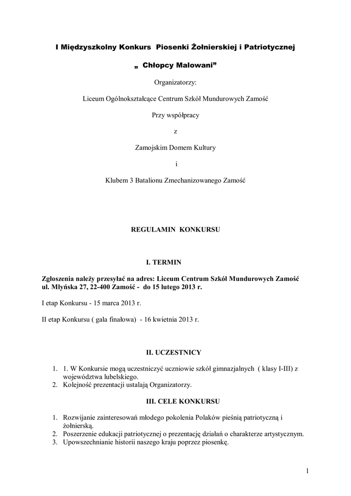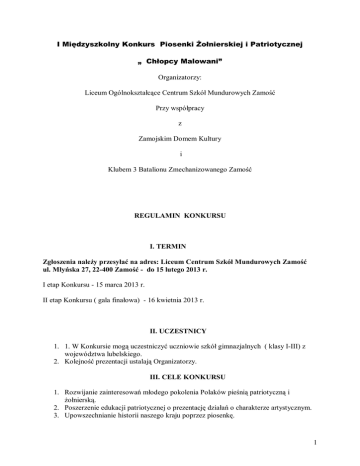 I Międzyszkolny Konkurs Piosenki Żołnierskiej i Patriotycznej „ Chłopcy Malowani” Organizatorzy: Liceum Ogólnokształcące Centrum Szkół Mundurowych Zamość Przy współpracy z Zamojskim Domem Kultury i Klubem 3 Batalionu Zmechanizowanego Zamość REGULAMIN KONKURSU I. TERMIN Zgłoszenia należy przesyłać na adres: Liceum Centrum Szkół Mundurowych Zamość ul. Młyńska 27, 22-400 Zamość - do 15 lutego 2013 r. I etap Konkursu - 15 marca 2013 r. II etap Konkursu ( gala finałowa) - 16 kwietnia 2013 r. II. UCZESTNICY 1. 1. W Konkursie mogą uczestniczyć uczniowie szkół gimnazjalnych ( klasy I-III) z województwa lubelskiego. 2. Kolejność prezentacji ustalają Organizatorzy. III. CELE KONKURSU 1. Rozwijanie zainteresowań młodego pokolenia Polaków pieśnią patriotyczną i żołnierską. 2. Poszerzenie edukacji patriotycznej o prezentację działań o charakterze artystycznym. 3. Upowszechnianie historii naszego kraju poprzez piosenkę. 1 4. 5. 6. 7. Stworzenie uczniom możliwości zdrowego współzawodnictwa. Wymiana doświadczeń pedagogicznych i integracja środowisk szkolnych. Rozwijanie wrażliwości artystycznej. Wzbogacenie doświadczeń scenicznych młodych wykonawców i konfrontowanie ich osiągnięć z rówieśnikami. IV. TEMATYKA 1. Uczestnicy prezentują utwór o tematyce patriotycznej lub żołnierskiej. 2. Możliwe jest wykorzystanie istniejącego lub zaprezentowanie autorskiego utworu. V. FORMA SCENICZNA 1. Uczestnikami Konkursu mogą być soliści i zespoły instrumentalno-wokalne. 2. Dopuszczalna forma prezentacji: utwór wykonywany a capella, utwór z akompaniamentem: własny lub półplayback. 3. Dopuszcza się układy choreograficzne. VI. KRYTERIA OCENIANIA 1. 2. 3. 4. 5. Zaangażowanie uczestników. Oprawa muzyczna. Sposób interpretacji utworu. Poziom artystyczny. Dobór repertuaru i sposób jego wykonania. VII. JURY 1. 2. 3. 4. 5. Jury i jego przewodniczącego powołuje Organizator. Zadaniem Jury jest przesłuchanie i ocena występów artystycznych. Jury dokonuje oceny zgodnie z ustalonymi kryteriami. Obrady Jury są tajne. Decyzje Jury są ostateczne i nieodwołalne. VIII. NAGRODY 1. Laureaci I, II i III miejsca oraz wyróżnieni otrzymają puchary, dyplomy i nagrody rzeczowe, a wszyscy uczestnicy – dyplomy udziału w koncercie konkursowym. 2. Opiekunowie zespołów i solistów otrzymają podziękowanie za przygotowanie uczestników. 3. Nagrody zostały ufundowane przez sponsorów Konkursu oraz Organizatora 2 IX. SPRAWY ORGANIZACYJNE 1. Warunkiem uczestnictwa w Konkursie jest nadesłanie w terminie do 15 lutego 2013 roku wypełnionej Karty Zgłoszenia wraz z podkładem muzycznym ( płyta CD) na adres szkoły. ( Istnieje możliwość późniejszego przesłania przesłania płyty) 2. I etap Konkursu odbywa się w siedzibie Organizatora: ( ul. Młyńska 27, 22-400 Zamość ) 3. Pytania należy kierować na numer szkoły -84.6278760 4. Organizator zastrzega sobie prawo do rejestracji koncertu konkursowego i wykorzystania nagrań oraz zdjęć do publikacji i powielania. 5. Czas trwania prezentacji – do 15 minut 6. Grupa występująca może liczyć do 15 osób. 7. Każda z grup może zaprezentować jeden utwór. 8. Organizator zapewnia: - scenę - nagłośnienie - miejsce do przygotowania dla artystów - poczęstunek po występie - opiekunów X. POSTANOWIENIA KOŃCOWE 1. Postanowienia niniejszego Regulaminu są wyłączną podstawa do przeprowadzenia Konkursu. 2. Przyjazd i powrót uczestników odbywa się na koszt własny. 3. Zespoły powinny mieć odpowiednią liczbę opiekunów, by zagwarantować porządek i bezpieczeństwo. 4. Nadesłanie wypełnionej i podpisanej Karty Zgłoszenia jest równoznaczne z akceptacją postanowień niniejszego Regulaminu. 5. Grupa nie może żądać zapłaty za uczestnictwo w Konkursie, transmisje radiowe i telewizyjne, nagrania filmowe oraz zdjęcia. 6. Każda z prezentujących się grup powinna mieć przy sobie kopię wykorzystywanego podkłady muzycznego. 3 XI. PATRONI KONKURSU Patronat honorowy nad Konkursem objął: Poseł do Parlamentu Europejskiego – Arkadiusz Bratkowski Poseł na Sejm RP – Sławomir Zawiślak Lubelski Kurator Oświaty – Krzysztof Babisz Starosta Powiatu Zamojskiego – Henryk Matej Wójt Gminy Zamość – Ryszard Gliwiński Dowódca 3 Batalionu Zmechanizowanego w Zamościu - ppłk Tadeusz Nastarowicz Światowy Związek Żołnierzy Armii Krajowej Patronat medialny sprawują: Gazeta Zamojska Radio Eska Telewizja Kablowa TVK Zamość Kronika Tygodnia Echa Roztocza Portal E-Zamosc.pl Portal Zamość On Line 4 5
