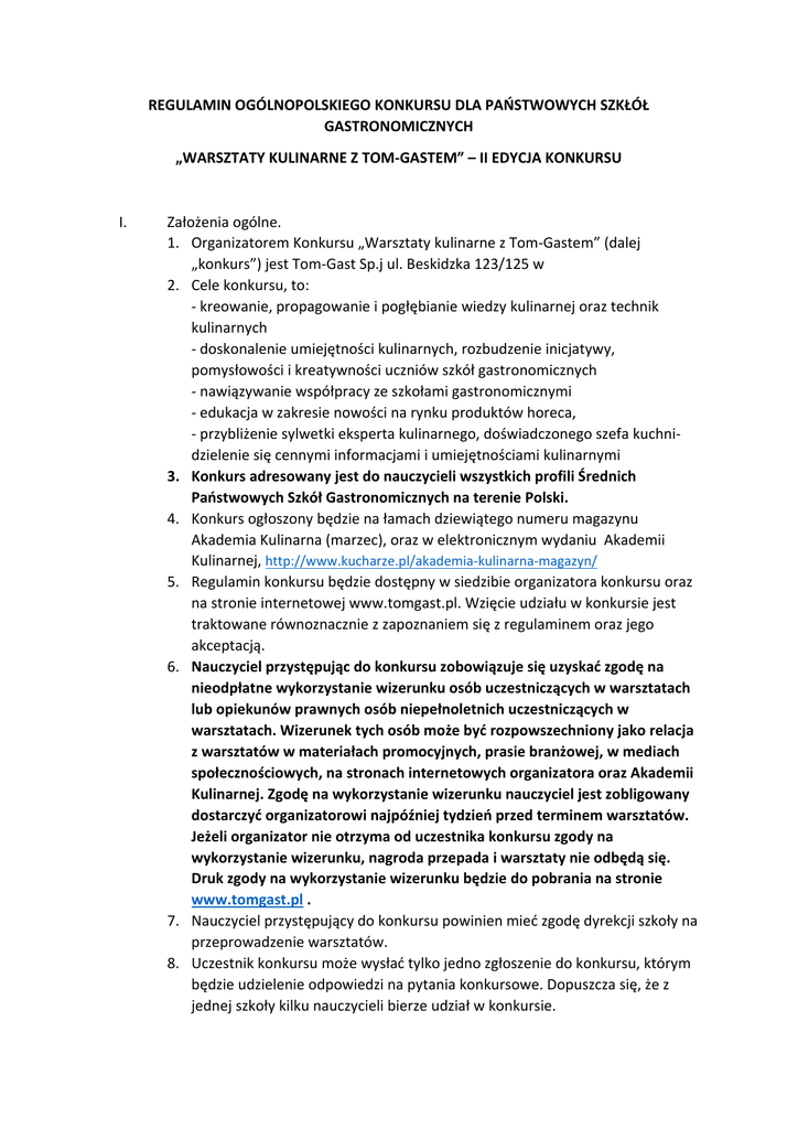 REGULAMIN OGÓLNOPOLSKIEGO KONKURSU DLA PAŃSTWOWYCH SZKŁÓŁ GASTRONOMICZNYCH „WARSZTATY KULINARNE Z TOM‐GASTEM” – II EDYCJA KONKURSU I. Założenia ogólne. 1. Organizatorem Konkursu „Warsztaty kulinarne z Tom‐Gastem” (dalej „konkurs”) jest Tom‐Gast Sp.j ul. Beskidzka 123/125 w 2. Cele konkursu, to: ‐ kreowanie, propagowanie i pogłębianie wiedzy kulinarnej oraz technik kulinarnych ‐ doskonalenie umiejętności kulinarnych, rozbudzenie inicjatywy, pomysłowości i kreatywności uczniów szkół gastronomicznych ‐ nawiązywanie współpracy ze szkołami gastronomicznymi ‐ edukacja w zakresie nowości na rynku produktów horeca, ‐ przybliżenie sylwetki eksperta kulinarnego, doświadczonego szefa kuchni‐ dzielenie się cennymi informacjami i umiejętnościami kulinarnymi 3. Konkurs adresowany jest do nauczycieli wszystkich profili Średnich Państwowych Szkół Gastronomicznych na terenie Polski. 4. Konkurs ogłoszony będzie na łamach dziewiątego numeru magazynu Akademia Kulinarna (marzec), oraz w elektronicznym wydaniu Akademii Kulinarnej, http://www.kucharze.pl/akademia‐kulinarna‐magazyn/ 5. Regulamin konkursu będzie dostępny w siedzibie organizatora konkursu oraz na stronie internetowej www.tomgast.pl. Wzięcie udziału w konkursie jest traktowane równoznacznie z zapoznaniem się z regulaminem oraz jego akceptacją. 6. Nauczyciel przystępując do konkursu zobowiązuje się uzyskać zgodę na nieodpłatne wykorzystanie wizerunku osób uczestniczących w warsztatach lub opiekunów prawnych osób niepełnoletnich uczestniczących w warsztatach. Wizerunek tych osób może być rozpowszechniony jako relacja z warsztatów w materiałach promocyjnych, prasie branżowej, w mediach społecznościowych, na stronach internetowych organizatora oraz Akademii Kulinarnej. Zgodę na wykorzystanie wizerunku nauczyciel jest zobligowany dostarczyć organizatorowi najpóźniej tydzień przed terminem warsztatów. Jeżeli organizator nie otrzyma od uczestnika konkursu zgody na wykorzystanie wizerunku, nagroda przepada i warsztaty nie odbędą się. Druk zgody na wykorzystanie wizerunku będzie do pobrania na stronie www.tomgast.pl . 7. Nauczyciel przystępujący do konkursu powinien mieć zgodę dyrekcji szkoły na przeprowadzenie warsztatów. 8. Uczestnik konkursu może wysłać tylko jedno zgłoszenie do konkursu, którym będzie udzielenie odpowiedzi na pytania konkursowe. Dopuszcza się, że z jednej szkoły kilku nauczycieli bierze udział w konkursie. II. III. 9. Termin zorganizowania warsztatu w danej szkole, będzie ustalany z uczestnikiem konkursu po ogłoszeniu wyników, nie najpóźniej niż 14 dni po ogłoszeniu wyników. Zasady konkursu 1. Nagrodami w konkursie jest 6 warsztatów kulinarnych prowadzonych przez doświadczonego chefa kuchni oraz doradcy kulinarnego Roberta Głydę. 2. Warsztaty zorganizowane będą najpóźniej do 31 maja 2016. Jeśli uczestnik konkursu nie będzie do tego czasu w stanie zorganizować terminu oraz grupy uczniów, to warsztaty przepadają. Warsztaty prowadzone będą przez Roberta Głydę w szkołach, w których zwycięży dany nauczyciel przystępujący do konkursu. Warsztaty trwać będą 3 godziny lekcyjne. Warsztaty dedykowane będą uczniom danej szkoły, której nauczyciel został zwycięzcą konkursu. W warsztatach może uczestniczyć grupa maksymalnie 30 uczniów. Nauczyciel, który zostanie zwycięzcą konkursu, typuje w uzgodnieniu z Dyrekcją Szkoły grupę uczniów, która uczestniczyć będzie w warsztatach 3. Aby przystąpić do konkursu, należy odpowiedzieć na pytania publikowane na stronie redakcyjnej Akademii Kulinarnej, dedykowanej konkursowi – wydanie nr 5 (październik). 3. Odpowiedzi na wszystkie pytania należy przesłać na adres poczty elektronicznej [email protected] 4. Spośród osób, które prześlą wszystkie prawidłowe odpowiedzi wybranych zostanie 6 osób, które najszybciej przesłały poprawne odpowiedzi. Decyduje poprawność odpowiedzi oraz kolejność nadesłanych odpowiedzi. 5. Formuła warsztatów. Część merytoryczna – wiedza podstawowa, nowości produktowe na rynku horeca, prezentacja ciekawostek dot. oferty. Część praktyczna – uczestnicy spotkania (ochotnicy) uczą się, doskonalą techniki kulinarne. Zakończenie – podsumowanie spotkania, quiz z nagrodami. 6. Wyniki konkursu będą ogłoszone na łamach dziesiątego numeru magazynu Akademia Kulinarna (kwiecień), oraz w elektronicznym wydaniu Akademii Kulinarnej, stronie internetowej www.tomgast.pl Postanowienie końcowe Organizator konkursu zastrzega sobie prawo do publikacji nazw szkół, logotypu szkoły, danych osobowych zwycięzców (imię, nazwisko, profil nauczycielski) i nauczycieli uczestniczących w warsztatach oraz wykorzystywania zdjęć wykonywanych podczas warsztatów. Organizator zastrzega sobie prawo decyzji o zmianie terminów dotyczących konkursu.