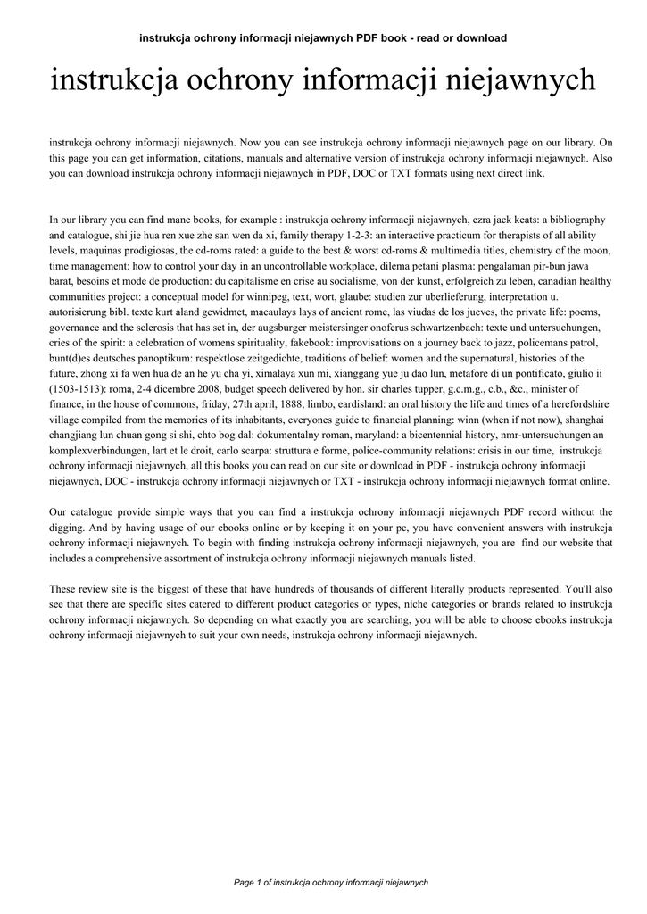 instrukcja ochrony informacji niejawnych PDF book - read or download instrukcja ochrony informacji niejawnych instrukcja ochrony informacji niejawnych. Now you can see instrukcja ochrony informacji niejawnych page on our library. On this page you can get information, citations, manuals and alternative version of instrukcja ochrony informacji niejawnych. Also you can download instrukcja ochrony informacji niejawnych in PDF, DOC or TXT formats using next direct link. In our library you can find mane books, for example : instrukcja ochrony informacji niejawnych, ezra jack keats: a bibliography and catalogue, shi jie hua ren xue zhe san wen da xi, family therapy 1-2-3: an interactive practicum for therapists of all ability levels, maquinas prodigiosas, the cd-roms rated: a guide to the best & worst cd-roms & multimedia titles, chemistry of the moon, time management: how to control your day in an uncontrollable workplace, dilema petani plasma: pengalaman pir-bun jawa barat, besoins et mode de production: du capitalisme en crise au socialisme, von der kunst, erfolgreich zu leben, canadian healthy communities project: a conceptual model for winnipeg, text, wort, glaube: studien zur uberlieferung, interpretation u. autorisierung bibl. texte kurt aland gewidmet, macaulays lays of ancient rome, las viudas de los jueves, the private life: poems, governance and the sclerosis that has set in, der augsburger meistersinger onoferus schwartzenbach: texte und untersuchungen, cries of the spirit: a celebration of womens spirituality, fakebook: improvisations on a journey back to jazz, policemans patrol, bunt(d)es deutsches panoptikum: respektlose zeitgedichte, traditions of belief: women and the supernatural, histories of the future, zhong xi fa wen hua de an he yu cha yi, ximalaya xun mi, xianggang yue ju dao lun, metafore di un pontificato, giulio ii (1503-1513): roma, 2-4 dicembre 2008, budget speech delivered by hon. sir charles tupper, g.c.m.g., c.b., &c., minister of finance, in the house of commons, friday, 27th april, 1888, limbo, eardisland: an oral history the life and times of a herefordshire village compiled from the memories of its inhabitants, everyones guide to financial planning: winn (when if not now), shanghai changjiang lun chuan gong si shi, chto bog dal: dokumentalny roman, maryland: a bicentennial history, nmr-untersuchungen an komplexverbindungen, lart et le droit, carlo scarpa: struttura e forme, police-community relations: crisis in our time, instrukcja ochrony informacji niejawnych, all this books you can read on our site or download in PDF - instrukcja ochrony informacji niejawnych, DOC - instrukcja ochrony informacji niejawnych or TXT - instrukcja ochrony informacji niejawnych format online. Our catalogue provide simple ways that you can find a instrukcja ochrony informacji niejawnych PDF record without the digging. And by having usage of our ebooks online or by keeping it on your pc, you have convenient answers with instrukcja ochrony informacji niejawnych. To begin with finding instrukcja ochrony informacji niejawnych, you are find our website that includes a comprehensive assortment of instrukcja ochrony informacji niejawnych manuals listed. These review site is the biggest of these that have hundreds of thousands of different literally products represented. You'll also see that there are specific sites catered to different product categories or types, niche categories or brands related to instrukcja ochrony informacji niejawnych. So depending on what exactly you are searching, you will be able to choose ebooks instrukcja ochrony informacji niejawnych to suit your own needs, instrukcja ochrony informacji niejawnych. Page 1 of instrukcja ochrony informacji niejawnych