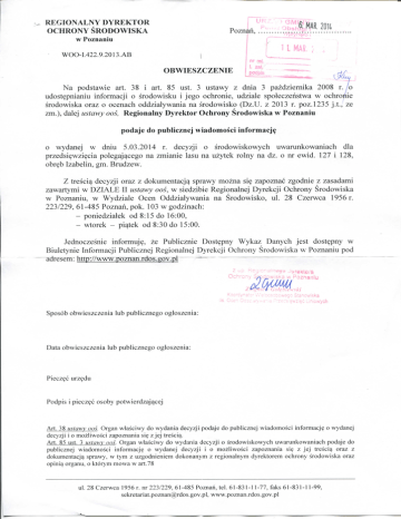 REGIONALNY DYREKTOR OCHRONY SRODOWISKA w Poznaniu 11 MAR. ; WOO-I.422.9.2013.AB OBWIESZCZENIE , nr tjsj. _ I. zaf,-^ podpis Na podstawie art. 38 i art. 85 ust. 3 ustawy z dnia 3 pazdziemika 2008 r. /o udost^pnianiu informacji o srodowisku i jego ochronie, udziale spoleczenstwa w ochronie srodowiska oraz o ocenach oddzialywania na srodowisko (Dz.U. z 2013 r. poz.1235 j.t., ze zm.), dalej ustawy oos, Regionalny Dyrektor Ochrony Srodowiska w Poznaniu podaje do publicznej wiadomosci informacji o wydanej w dniu 5.03.2014 r. decyzji o srodowiskowych uwarunkowaniach dla przedsi^wzi^cia polegaj^cego na zmianie lasu na uzytek rolny na dz. o nr ewid. 127 i 128, obr^b Izabelin, gm. Brudzew. Z tresci^ decyzji oraz z dokumentacja sprawy mozna si^ zapoznac zgodnie z zasadami zawartymi w D Z I A L E II ustawy oos, w siedzibie Regionalnej Dyrekcji Ochrony Srodowiska w Poznaniu, w Wydziale Ocen Oddzialywania na Srodowisko, ul. 28 Czerwca 1956 r. 223/229, 61-485 Poznah, pok. 103 w godzinach: - poniedzialek od 8:15 do 16:00, - wtorek - pi^tek od 8:30 do 15:00. Jednoczesnie informuj^, ze Publicznie Dost^pny Wykaz Danych jest dost^pny w Biuletynie Informacji Publicznej Regionalnej Dyrekcji Ochrony Srodowiska w Poznaniu pod adresem: http:/Avww.poznan.rdos.gov.pl ~~ Z u p . Regionalnese J y f f e , « 6 r a Ochrony S/c — A ' s k a w Poznanlij Koordyrats' v."e c<;sD:cA'eGO Staicwska Sposob obwieszczenia lub publicznego ogloszenia: Data obwieszczenia lub publicznego ogloszenia: Piecz^c urz^du Podpis i piecz^c osoby potwierdzaj^cej Art. 38 iistcnvy oos. Organ wtasciwy do wydania decyzji podaje do publicznej wiadomosci informacji o wydanej decyzji i o mozliwosci zapoznania si^ z jej trescia. Art. 85 ust. 3 ustawy oos. Organ wlasciwy do wydania decyzji o srodowiskowych uwarunkowaniacli podaje do publicznej wiadomosci informacj? o wydanej decyzji i o mozliwosci zapoznania si? z jej tresci^ oraz z dokumentacja sprawy, w tym z uzgodnieniem dokonanym z regionalnym dyrektorem ochrony srodowiska oraz opiniq organu, o ktorym mowa w art.78 ul. 28 Czerwca 1956 r. nr 223/229, 61-485 Poznan, tel. 61 -831 -11 -77, faks 61 -831 -11 -99, [email protected], www.poznan.rdos.gov.pl