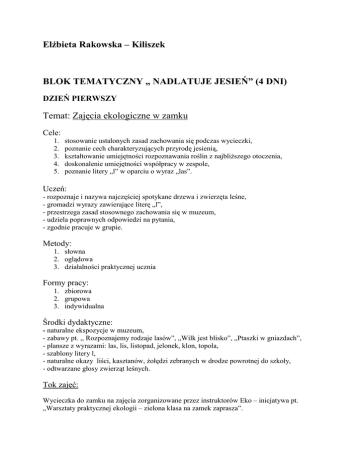 ElŜbieta Rakowska – Kiliszek BLOK TEMATYCZNY „ NADLATUJE JESIEŃ” (4 DNI) DZIEŃ PIERWSZY Temat: Zajęcia ekologiczne w zamku Cele: 1. 2. 3. 4. 5. stosowanie ustalonych zasad zachowania się podczas wycieczki, poznanie cech charakteryzujących przyrodę jesienią, kształtowanie umiejętności rozpoznawania roślin z najbliŜszego otoczenia, doskonalenie umiejętności współpracy w zespole, poznanie litery „l” w oparciu o wyraz „las”. Uczeń: - rozpoznaje i nazywa najczęściej spotykane drzewa i zwierzęta leśne, - gromadzi wyrazy zawierające literę „l”, - przestrzega zasad stosownego zachowania się w muzeum, - udziela poprawnych odpowiedzi na pytania, - zgodnie pracuje w grupie. Metody: 1. słowna 2. oglądowa 3. działalności praktycznej ucznia Formy pracy: 1. zbiorowa 2. grupowa 3. indywidualna Środki dydaktyczne: - naturalne ekspozycje w muzeum, - zabawy pt. ,, Rozpoznajemy rodzaje lasów”, „Wilk jest blisko”, „Ptaszki w gniazdach”, - plansze z wyrazami: las, lis, listopad, jelonek, klon, topola, - szablony litery l, - naturalne okazy liści, kasztanów, Ŝołędzi zebranych w drodze powrotnej do szkoły, - odtwarzane głosy zwierząt leśnych. Tok zajęć: Wycieczka do zamku na zajęcia zorganizowane przez instruktorów Eko – inicjatywa pt. „Warsztaty praktycznej ekologii – zielona klasa na zamek zaprasza”. 1. Przywitanie instruktorów prowadzących zajęcia z dziećmi, omówienie celu spotkania w muzeum. Dzieci zostają podzielone na dwie grupy. KaŜda grupa pod opieką przewodnika rozpoczyna zwiedzanie „leśnego świata przyrody”. 2. Zapoznanie z rodzajami lasów- iglaste i liściaste. Dzieci rozpoznają nazwy drzew w oparciu o naturalne okazy, oglądają korę drzew, liście. Zabawa „ Rozpoznajemy rodzaje lasów” (Zabawa polega na pokazywaniu przez instruktora liścia np. dębu, dziecko odgaduje czy jest to liść z drzewa liściastego, czy iglastego. Instruktor kilkakrotnie zadaje pytania, pokazując za kaŜdym razem inny liść.) 3. Omówienie wystawy – „Zwierzęta leśne” Dzieci wymieniają jakie zwierzęta Ŝyją w lesie. Słuchają i odgadują głosy zwierząt. 4. Wprowadzenie litery L, l na przykładzie wyrazu „listek” Dzieci wyszukują litery „l” w wyrazach zawieszonych na tablicy, otaczają literę w pętlę. Głośno odczytują wyrazy: las. lis, listopad, jelonek, topola, klon. Zabawa ruchowa „Wilk jest blisko” ( Zabawa polega na tym Ŝe – dzieci swobodnie tańczą przy muzyce. Nauczyciel wyznacza jedno dziecko, które będzie wilkiem. Wilk bawi się razem z dziećmi. Podczas swobodnej zabawy jego zadaniem jest dyskretne dotknięcie drugiego dziecka, które równieŜ zostaje wilkiem. W ten sposób wśród dzieci krąŜą juŜ dwa wilki. Gdy nauczyciel wyłączy muzykę, dwa wilki łapią dzieci, które znajdują się najbliŜej nich. Złapane dzieci stają się drzewami – stają nieruchomo. Zabawa powtarza się i trwa do dotąd, aŜ zostanie mała grupka dzieci, którym udało się uchronić przed wilkami.) 5. Poznanie znaku graficznego litery „L,l”. 6. Zabawa w pisanie liter (Dzieci piszą poznaną literę palcem po podłodze, na plecach kolegi, palcem prawej ręki na lewym przedramieniu i odwrotnie. Podczas pisania wodzą za palcem oczami.) 8. Wyklejanie kształtu litery L na kartkach (wyklejanie wełną na kartkach szablonu litery L) 9. RozróŜnianie ptaków Ŝyjących w Polsce. Dzieci nazywają ptaki, rozpoznają głosy ptaków. Nazywają ptaki odlatujące na zimę do ciepłych krajów. Zabawa ruchowa „Ptaszki w gniazdach” (Dzieci ustawiają się trójkami. Dwoje uczniów trzyma się za ręce, tworząc gniazdko, w środku stoi trzecie dziecko – ptaszek. Co najmniej jeden ptaszek nie ma gniazdka. Na hasło prowadzącego: ptaszki do gniazd – znajdują sobie dowolne gniazdko. Dzieci, które znajdą gniazdka, siadają na podłodze, a wybrane przez nauczyciela gniazdko zamienia się w ptaszka. Zabawa trwa dotąd, aŜ zostanie jeden ptaszek i jedno gniazdko.) 10. Podsumowanie i zakończenie zajęć. Dzieci odpowiadały na pytanie „O co prosi las?” KaŜde dziecko stara się podać przykład jednej prośby, np. - Nie łam gałęzi! - Nie zrywaj niepotrzebnie owoców i kwiatów! – Zbieraj tylko te okazy przyrodnicze, które leŜą na ziemi! – Nie śmieć! – Nie płosz zwierząt!.- Nie hałasuj!. 11. W drodze powrotnej do szkoły (w parku) dzieci zbierają dary jesieni (kasztany, Ŝołędzie, liście, jarzębinę) i zanoszą do klasy. DZIEŃ DRUGI Temat: Jesienne zadania Cele: 1. 2. 3. 4. 5. rozwijanie zainteresowań najbliŜszą przyrodą, dostrzeganie zmian zachodzących w przyrodzie jesienią, doskonalenie umiejętności współpracy w zespole, ćwiczenia w kształtnym pisaniu litery – l, wdraŜanie do skupienia uwagi podczas wykonywania zadań. Uczeń: - rozpoznaje i nazywa najczęściej spotykane drzewa i zwierzęta leśne, - łączy w zbiory dary jesieni, - poprawnie i starannie pisze literę „l”, - poprawnie łączy poznaną literę w sylaby, - udziela poprawnych odpowiedzi na pytania, - pracuje w skupieniu. Metody: 4. słowna 5. oglądowa 6. działalności praktycznej ucznia Formy pracy: 6. zbiorowa 7. grupowa 8. indywidualna Środki dydaktyczne: - plansze z wyrazami: las, lis, listopad, jelonek, klon, topola, - autorskie karty pracy ( szablony litery l), - naturalne okazy liści, kasztanów. śołędzi. Tok zajęć: Zgromadzenie przyniesionych darów jesieni, wykonanie klasowego kącika przyrody „Jesienne skarby”. Wielozdaniowe wypowiedzi dzieci na temat zmian zachodzących w przyrodzie jesienią na podstawie przeŜyć i doświadczeń z wycieczki. Pisanie litery L, l . Pisanie sylab i wyrazów z poznanymi literami. Porównywanie liczebności zbiorów bez przeliczania ich elementów. Nauka piosenki pt. „Jesienna piosenka”. 1.Zagadki o jesieni: Złotoczerwone i rude spadają gwiazdki jesieni. Płyną w spokojnym powietrzu, potem siadają na ziemi. (liście) 