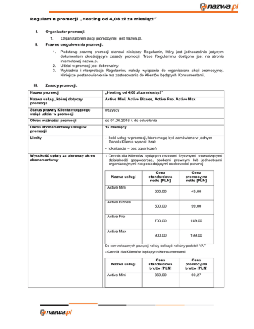 Regulamin promocji „Hosting od 4,08 zł za miesiąc!” I. Organizator promocji. 1. II. Prawne uregulowania promocji. 1. 2. 3. III. Organizatorem akcji promocyjnej jest nazwa.pl. Podstawę prawną promocji stanowi niniejszy Regulamin, który jest jednocześnie jedynym dokumentem określającym zasady promocji. Treść Regulaminu dostępna jest na stronie internetowej nazwa.pl. Udział w promocji jest dobrowolny. Wykładnia i interpretacja Regulaminu należy wyłącznie do organizatora akcji promocyjnej. Niniejsze postanowienie nie ma zastosowania do Klientów będących Konsumentami. Zasady promocji. Nazwa promocji „Hosting od 4,08 zł za miesiąc!” Nazwa usługi, której dotyczy promocja Active Mini, Active Biznes, Active Pro, Active Max Status prawny Klienta mogącego wziąć udział w promocji wszyscy Okres ważności promocji od 01.06.2016 r. do odwołania Okres abonamentowy usługi w promocji 12 miesięcy Limity - ilość usług w promocji, które mogą być zamówione w jednym Panelu Klienta wynosi: brak - lokalizacja – bez ograniczeń Wysokość opłaty za pierwszy okres abonamentowy - Cennik dla Klientów będących osobami fizycznymi prowadzącymi działalność gospodarczą, osobami prawnymi lub jednostkami organizacyjnymi nie posiadającymi osobowości prawnej Nazwa usługi Cena standardowa netto [PLN] Cena promocyjna netto [PLN] 300,00 49,00 500,00 99,00 700,00 149,00 900,00 199,00 Active Mini Active Biznes Active Pro Active Max Do cen wskazanych powyżej należy doliczyć należny podatek VAT - Cennik dla Klientów będących Konsumentami: Nazwa usługi Active Mini Cena standardowa brutto [PLN] Cena promocyjna brutto [PLN] 369,00 60,27 Regulamin promocji „Hosting od 4,08 zł za miesiąc!” Active Biznes 615,00 121,77 861,00 183,27 Active Pro Active Max 1107,00 244,77 Uwagi IV. brak Pozostałe. 1. 2. 3. 4. Do umów pomiędzy Klientem, a nazwa.pl zastosowanie ma prawo polskie. Wszelkie spory mogące wyniknąć z umów pomiędzy Klientem a nazwa.pl, dotyczących świadczenia usług przez nazwa.pl, którym nie uda się zapobiec w drodze postępowania reklamacyjnego, rozstrzygane będą przez sąd powszechny, właściwy dla siedziby nazwa.pl. Powyższe wskazanie właściwości sądu nie ma zastosowania do Klientów będących Konsumentami. Miejscem świadczenia usługi jest siedziba nazwa.pl. W sprawach, które nie zostały uregulowane w niniejszym Regulaminie mają zastosowanie postanowienia Ogólnych Warunków Umów. Datą decydującą o udziale w promocji jest data zamówienia usługi za pośrednictwem strony internetowej nazwa.pl. Regulamin w wersji z dnia 01.06.2016 r.