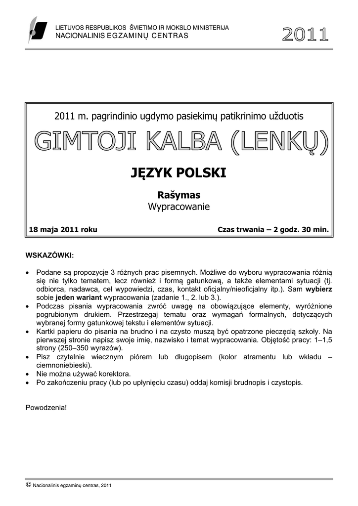 LIETUVOS RESPUBLIKOS ÐVIETIMO IR MOKSLO MINISTERIJA NACIONALINIS EGZAMINØ CENTRAS 2011 m. pagrindinio ugdymo pasiekimų patikrinimo užduotis JĘZYK POLSKI Rašymas Wypracowanie 18 maja 2011 roku Czas trwania – 2 godz. 30 min. WSKAZÓWKI: Podane są propozycje 3 różnych prac pisemnych. Możliwe do wyboru wypracowania różnią się nie tylko tematem, lecz również i formą gatunkową, a także elementami sytuacji (tj. odbiorca, nadawca, cel wypowiedzi, czas, kontakt oficjalny/nieoficjalny itp.). Sam wybierz sobie jeden wariant wypracowania (zadanie 1., 2. lub 3.). Podczas pisania wypracowania zwróć uwagę na obowiązujące elementy, wyróżnione pogrubionym drukiem. Przestrzegaj tematu oraz wymagań formalnych, dotyczących wybranej formy gatunkowej tekstu i elementów sytuacji. Kartki papieru do pisania na brudno i na czysto muszą być opatrzone pieczęcią szkoły. Na pierwszej stronie napisz swoje imię, nazwisko i temat wypracowania. Objętość pracy: 1–1,5 strony (250–350 wyrazów). Pisz czytelnie wiecznym piórem lub długopisem (kolor atramentu lub wkładu – ciemnoniebieski). Nie można używać korektora. Po zakończeniu pracy (lub po upłynięciu czasu) oddaj komisji brudnopis i czystopis. Powodzenia! © Nacionalinis egzaminø centras, 2011 2011 m. pagrindinio ugdymo pasiekimø patikrinimas • GIMTOJI KALBA (LENKØ) • Raðymas Zadanie 1. Moja wierna mowo, służyłem tobie. Co noc stawiałem przed tobą miseczki z kolorami, żebyś miała i brzozę i konika polnego i gila, zachowanych w mojej pamięci. Trwało to dużo lat. Byłaś moją ojczyzną bo zabrakło innej (...) Myślałem, że będziesz także pośredniczką pomiędzy mną i dobrymi ludźmi, choćby ich było dwudziestu, dziesięciu, albo nie urodzili się jeszcze. Teraz przyznaję się do zwątpienia. (...) Ale bez ciebie kim jestem. Tylko szkolarzem gdzieś w odległym kraju (...) Filozofem takim jak każdy. (...) Moja wierna mowo, może to jednak ja muszę ciebie ratować. Więc będę dalej stawiać przed tobą miseczki z kolorami jasnymi i czystymi jeżeli to możliwe, bo w nieszczęściu potrzebny jakiś ład czy piękno. Czesław Miłosz, Moja wierna mowo (Berkley, 1968) Na podstawie fragmentu wiersza Czesława Miłosza omów stosunek poety do mowy ojczystej: jakie znaczenie miał dla niego język ojczysty na emigracji i w jaki sposób poeta pielęgnował mowę ojczystą? Zastanów się, jaką rolę odgrywa zachowanie języka ojczystego i dbałość o niego we współczesnym świecie. Napisz rozprawkę na temat: Język ojczysty – naszą duchową ojczyzną Forma gatunkowa – rozprawka Temat – Język ojczysty – naszą duchową ojczyzną Cel – pokazanie na podstawie fragmentu wiersza, jaką rolę odgrywał język ojczysty dla Cz. Miłosza, oraz uzasadnienie, że język ojczysty jest w życiu ludzi istotną wartością. 2 2011 m. pagrindinio ugdymo pasiekimø patikrinimas • GIMTOJI KALBA (LENKØ) • Raðymas Zadanie 2. Wszystko w tym domu było dobre dla uczuć, przychylne i przytulne jak niegdyś objęcia rodziców. Wszystko tu było na swoim miejscu, dobrze postawione i rozumnie strzeżone, wszystko pociągało i wabiło, niczym rozgrzany piec w zimie, a cień wielkiego i rozłożystego drzewa w skwar letni. (S. Żeromski) Napisz rozprawkę, w której rozważysz problem: jaki powinien być dom, by można go było pokochać, by chciało się do niego wracać jak do bezpiecznej przystani. Jakie elementy – ludzie, przedmioty, zwyczaje, uczucia – składają się na oblicze domu? Jak dom kształtuje osobowość człowieka i rzutuje na całe jego dalsze życie? Przytocz przykłady oraz argumenty z życia i z literatury. Forma gatunkowa – rozprawka Temat – Jak dom rodzinny wpływa na kształtowanie osobowości? Cel – rozważenie problemu, jakie powinno być oblicze domu rodzinnego i jak dom rodzinny kształtuje osobowość człowieka – z wykorzystaniem własnych obserwacji i przemyśleń oraz doświadczeń czytelniczych. Zadanie 3. Na temat tego, jaka jest szkoła i jaka powinna być, od zawsze toczą się burzliwe dyskusje wśród uczniów, rodziców i nauczycieli. Wszyscy są zgodni, że szkoła ma przekazywać wiedzę, przygotowywać do życia, ma też wychowywać porządnych ludzi, a jednocześnie powinna być miejscem przyjemnym. Zabierz głos w dyskusji, która toczy się na łamach gazetki szkolnej, i przedstaw, jak Ty widzisz szkołę swoich marzeń: jak można byłoby udoskonalić program nauczania; jaka atmosfera powinna panować w szkole, by chciało się do niej uczęszczać? Na co jeszcze warto byłoby zwrócić uwagę? Przedstawiając swój pomysł, przytocz przykłady oraz argumenty z życia, literatury lub innych źródeł (np. filmu, publicystyki, audycji radiowych i telewizyjnych, wspomnień ludzi starszych i in.). Forma gatunkowa – artykuł (z elementami opisu i argumentacji) Temat – Szkoła moich marzeń Odbiorca – młodzież szkolna i nauczyciele Cel – prezentacja własnych poglądów na temat modelu szkoły i uzasadniona propozycja zmian – z wykorzystaniem swoich spostrzeżeń i przemyśleń oraz doświadczeń społeczno-kulturowych. 3