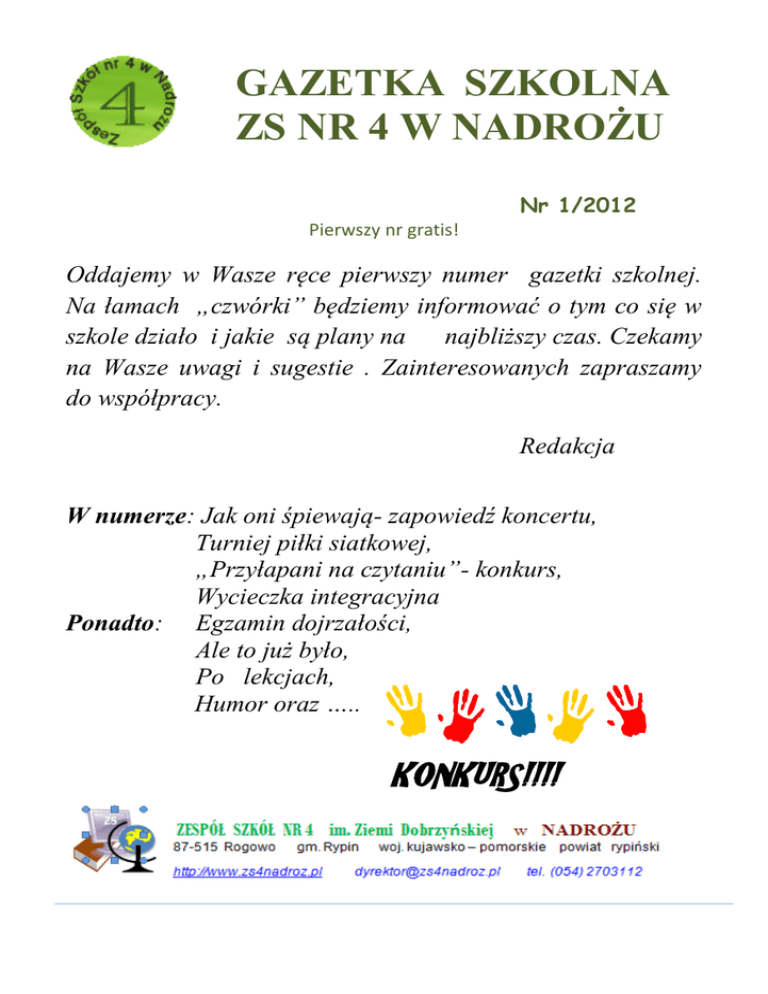 GAZETKA SZKOLNA ZS NR 4 W NADROŻU Nr 1/2012 Pierwszy nr gratis! Oddajemy w Wasze ręce pierwszy numer gazetki szkolnej. Na łamach „czwórki” będziemy informować o tym co się w szkole działo i jakie są plany na najbliższy czas. Czekamy na Wasze uwagi i sugestie . Zainteresowanych zapraszamy do współpracy. Redakcja W numerze: Jak oni śpiewają- zapowiedź koncertu, Turniej piłki siatkowej, „Przyłapani na czytaniu”- konkurs, Wycieczka integracyjna Ponadto: Egzamin dojrzałości, Ale to już było, Po lekcjach, Humor oraz ….. KONKURS!!!! NA CZASIE JAK ONI ŚPIEWAJĄ - O CHÓRZE ASIA RUCIŃSKA Szkolony chór działa od 2009 r. i jest prowadzony pod kierunkiem Pani Jolanty TofilDykowskiej. W swoim dorobku mamy występy podczas uroczystości szkolnych, wiele imprez okolicznościowych i środowiskowych. Podczas prób prezentujemy talenty wokalne, kształtujemy głos, poznajemy pieśni i piosenki o różnej tematyce. Kształtujemy umiejętności wokalne i uczymy się współpracy w grupie. Rozwijamy się słuchowo, prowadzone są zajęcia z emisji głosu, artykulacji, ćwiczenia oddechowe i przepony. Próby szkolnego chóru odbywają się dwa razy w tygodniu. Obecnie przygotowujemy się do koncertu dla środowiska lokalnego pt. „Koncert jesienny na dwa świerszcze”. Podczas koncertu zaprezentujemy ok. 20 piosenek, których tematem przewodnim jest jesień. Zespół szkolny działa od 2007 roku, występuje na uroczystościach i imprezach okolicznościowych. Próby rozwijają nie tylko muzycznie, ale również integrują zespół. Opiekunem zespołu od bieżącego roku jest Pani Aleksandra Grzybowska. NA SPORTOWO Od 5 listopada w naszej szkole odbywa się turniej piłki siatkowej. W szranki stanęły drużyny dziewcząt i chłopców poszczególnych klas. Wyniki rywalizacji opublikujemy w następnym numerze gazetki. PRZYŁAPANI NA CZYTANIU Biblioteka Zespołu Szkół Nr 4 w Nadrożu przyłączyła się do europejskiej inicjatywy „przyłapani na czytaniu”, której głównym celem jest promowanie czytelnictwa za pomocą różnych mediów. Organizując konkurs „Przyłapani na czytaniu” chcieliśmy pokazać, iż czytanie może stanowić świetną rozrywkę i być jedną z atrakcji, którymi wypełnić można swój wolny czas. Laureatki szkolnego konkursu Przyłapani na czytaniu I MIEJSCE – EMILA JASTRZĘBSKA III LO II MIEJSCE MARTRYNA ROBALEWSKA – II TAK III MIEJSCE MONIKA GUNERKO – II TAK WYJAZD INTEGRACYJNY We wtorek 30 października uczniowie klas pierwszych uczestniczyli w wyjeździe integracyjnym do Torunia na projekcję filmu pt.”Jestem Bogiem”. Przejazd ufundowała Rada Rodziców. ALE TO JUŻ BYŁO OTRZĘSINY KLAS PIERWSZYCH W dniu 18. 09. 2012 r. pierwszoklasiści zostali ostatecznie włączeni w poczet uczniów Zespołu Szkół Nr 4 im. Ziemi Dobrzyńskiej w Nadrożu. Imprezę przygotował Samorząd Szkolny pod opieką Danuty Marynowskiej. „Otrzęsiny” były zabawą połączoną z rywalizacją uczniów klas pierwszych .Pierwszą konkurencją był tor przeszkód, następnie uczniom „doczepiano” ogon i malowano twarze. Uczniowie losowali przydział zadań do wykonania. Śpiewano piosenki, reklamowano różne przedmioty użytku szkolnego. Tradycyjnie uczniowie klas pierwszych pili specjalnie przygotowany koktajl mleczny. Ostatnia z konkurencji polegała na udzielaniu odpowiedzi na zabawne pytania dotyczące codziennej pracy szkoły np.: „ Podaj nazwisko przewodniczącego Samorządu Szkolnego, ile kosztuje napój w naszym sklepiku czy …. Jakie numery rejestracyjne posiada auto Dyrektora?” Po zakończeniu wszystkich konkurencji jury zaprezentowało klasyfikację: I miejsce Technikum Pojazdów Samochodowych, II Liceum Ogólnokształcące profil humanistyczno-artystyczny, III miejsce Liceum Ogólnokształcące profil pedagogiczny, IV miejsce ex æquo Technikum Budowlane i Technikum Architektury Krajobrazu. Impreza zakończyła się przy ognisku. DZIEŃ NAUCZYCIELA W piątek 12.10 2012 r. Samorząd Uczniowski przygotował uroczystą akademię z okazji Dnia Edukacji Narodowej. Na uroczystość zostali zaproszeni nauczyciele, pracownicy obsługi i administracji nauczyciele – emeryci oraz cała aspołeczność szkoły. Słowa podziękowania za wykonywaną pracę skierowała do obecnych na sali gimnastycznej Wicestarosta Rypińska Danuta Tyraj. Młodzież w pięknych słowach dziękowała za trud włożony w edukację i wychowanie. Soliści szkolnego chóru zaprezentowali piosenki, niektóre zupełnie w nowych interpretacjach, gdzie głównym tematem była praca nauczyciela. Zgromadzeni wysłuchali recytacji wierszy oraz przedstawili scenki na temat życia szkolnego. Uroczystość przebiegał w wyjątkowej atmosferze. Na twarzach profesorów dostrzec można było wzruszenie i refleksję. LICEUM PEDAGOGICZNE NA WYKŁADACH UMK Młodzież Liceum Ogólnokształcącego o profilu pedagogicznym ,uczestniczyła w wykładzie zorganizowanym przez Zakład Dydaktyki i Fizyki na Uniwersytecie Mikołaja Kopernika w Toruniu. Prezentacja odbyła się w Auli Wydziału Matematyki i Informatyki. Uczniowie uczestniczyli w inauguracji Środowiskowego Seminarium Dydaktyki, podczas której wysłuchali wykładu Pana prof. dr hab. Grzegorza Karwasza, pt.: „Edukacja: (słaby) wiatr z Zachodu”. Młodzież przyjrzała się systemom edukacyjnym w państwach Europy Zachodniej. Zapoznali się z poszczególnymi etapami edukacyjnymi w takich państwach, jak: Szwecja, Niemcy, Francja, Anglia. Ogromną zaletą wykładu była sympatyczna atmosfera i możliwość dyskusji z profesorem Grzegorzem Karwaszem, studentami i osobami doświadczonymi mającymi własne stanowisko na prezentowany temat. Oprócz tego uczniowie mogli zobaczyć Wydział Matematyki i Informatyki, przyjrzeć się zajęciom prowadzonym przez wykładowców oraz rozwinąć własne zainteresowania związane z danym kierunkiem. WIRTUALNY CZY REALNY? Na zaproszenie Zespołu Szkół Nr 4 w Nadrożu 4.10.2012 r. w sali