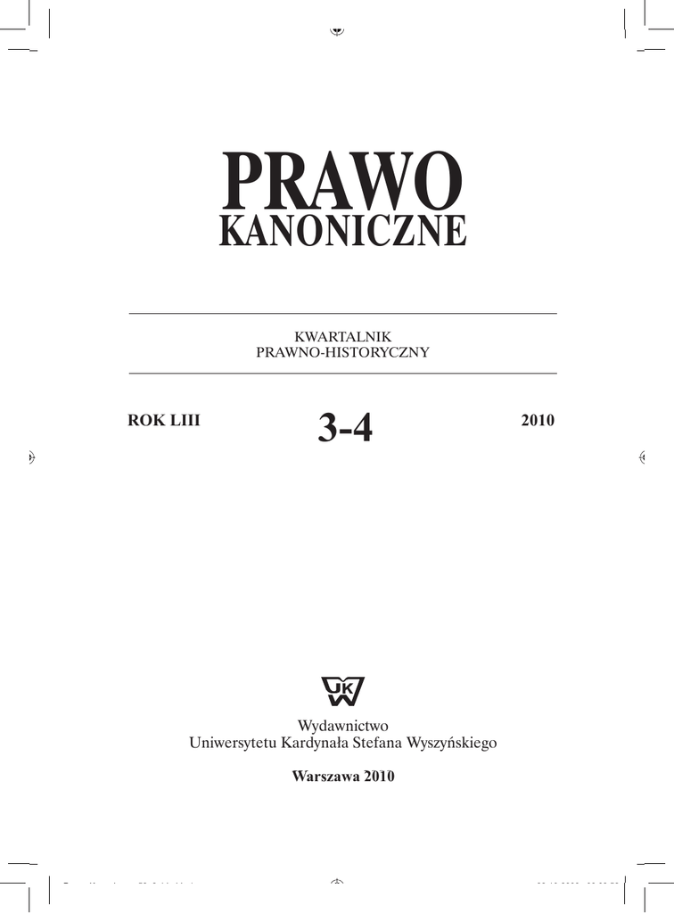 PRAWO KANONICZNE KWARTALNIK PRAWNO-HISTORYCZNY ROK LIII LII ROK 3-4 3-4 2009 2010 Wydawnictwo Uniwersytetu Kardynała Stefana Wyszyńskiego Warszawa 2009 Warszawa 2010 Prawo Kanoniczne_52_3-4.indd 1 28-10-2009 09:03:58 PRAWO KANONICZNE KWARTALNIK IUS CANONICUM FOLIA TRIMESTRIA studiis canonico-historicis dedicata Założyciel i pierwszy redaktor naczelny ks. Marian Alfons Myrcha Redaktor naczelny ks. Józef Wroceński SCJ Zastępca redaktora naczelnego s. Bożena Szewczul WNO Sekretarz Redakcji ks. Marek Stokłosa SCJ Rada Naukowa: ks. M. Fąka, ks. T. Gałkowski CP, ks. W. Góralski, ks. J. Gręźlikowski, ks. J. Kałowski MIC, ks. W. Kiwior OCD, ks. G. Leszczyński, ks. R. Sobański, ks. H. Stawniak SDB, J. Zabłocki Za pozwoleniem Kurii Metropolitalnej Warszawskiej Pozycja dofinansowana ze środków Komitetu Badań Naukowych ISSN-0551-911X Zgłoszenia prenumeraty przyjmuje Wydawnictwo UKSW ul. Dewajtis 5, 01-815 Warszawa, tel./fax 22 561 89 23 Adres redakcji: ul. Dewajtis 5, 01-815 Warszawa e-mail: [email protected] www.wydawnictwo.uksw.edu.pl Druk i oprawa: OFICYNA WYDAWNICZO-POLIGRAFICZNA „ADAM” 02-729 Warszawa, ul. Rolna 191/193, tel. 022-843-37-23, 022-843-08-79; tel./fax 022-843-20-52 e-mail: [email protected] http://www.oficyna-adam.com.pl d oktorat y h o n o r i s c a u s a 1. KS. ABP DR SŁAWOJ LESZEK GŁÓDŹ Uchwała nr 30/ 2009/2010 Rady Wydziału Prawa Kanonicznego Uniwersytetu Kardynała Stefana Wyszyńskiego w Warszawie z dnia 15 grudnia 2009 r. w sprawie wystąpienia z wnioskiem o nadanie tytułu doktora honoris causa Księdzu Arcybiskupowi Doktorowi Sławojowi Leszkowi Głódziowi Metropolicie Gdańskiemu Na podstawie postanowienia 16 ust. 2 ustawy z dnia 27 lipca 2005 r. Prawo o szkolnictwie wyższym (Dz. U. Nr 164, poz. 1365, z późn. zm.) oraz § 7 ust. 2 i 3 Statutu Uniwersytetu Kardynała Stefana Wyszyńskiego w Warszawie, uchwala się, co następuje: §1 Rada Wydziału Prawa Kanonicznego Uniwersytetu Kardynała Stefana Wyszyńskiego w Warszawie w uznaniu wybitnych zasług położonych dla Kościoła powszechnego i Kościoła w Polsce, zwłaszcza dla Ordynariatu Polowego oraz nauki prawa kanonicznego, a także dla Uniwersytetu Kardynała Stefana Wyszyńskiego w Warszawie postanawia wystąpić do Senatu Uniwersytetu Kardynała Stefana Wyszyńskiego w Warszawie z wnioskiem o wszczęcie procedury zmierzającej do nadania tytułu doktora honoris causa Ks. Abp. Generałowi Dyw. Dr. Sławojowi Leszkowi Głódziowi oraz o wyznaczenie dwóch recenzentów. Jako recenzentów proponuje się: 1. Ks. prof. dr hab. Józefa Krukowskiego 2. Ks. prof. dr hab. Jana Dyducha §2 Uchwała wchodzi w życie z dniem podjęcia. ks. prof. Józef Wroceński Dziekan Wydziału 4 doktoraty honoris causa [2] Uchwała Nr 6/2010 Senatu Uniwersytetu Kardynała Stefana Wyszyńskiego w Warszawie z dnia 28 stycznia 2010 r. w sprawie nadania tytułu doktora honoris causa Księdzu Arcybiskupowi dr Sławojowi Leszkowi Głódziowi Na podstawie art. 16 ust. 2 ustawy z dnia 27 lipca 2005 r. – Prawo o szkolnictwie wyższym (Dz.U. Nr 164, poz. 1365, z późn.zm.) oraz § 7 ust. 6 statutu Uniwersytetu Kardynała Stefana Wyszyńskiego w Warszawie – uchwala się, co następuje: §1 Na podstawie wniosku Rady Wydziału Prawa Kanonicznego z dnia 15 grudnia 2009 r., po zapoznaniu się z recenzjami Senat pragnie wyrazić szacunek i uznanie dla działalności Księdza Arcybiskupa Sławoja Leszka Głódzia, który wniósł ogromny wkład w proces przemian społecznych w Polsce oraz przyczynił się do zorganizowania, po długoletniej przerwie, struktur Ordynariatu Polowego Wojska Polskiego. W swojej długoletniej pracy dla Kościoła powszechnego i Kościoła w Polsce zawsze zwraca uwagę na znaczenie Ewangelii i wartości chrześcijańskich w życiu społecznym w wymiarze historycznym i współczesnym. Bogata działalność kościelna i społeczna, doniosłe dokonania w zakresie organizacji życia religijnego polskich żołnierzy i zaangażowanie w sprawy wagi państwowej i Kościoła w Polsce oraz osiągnięcia i zasługi w budowaniu dobra wspólnego w sposób niekwestionowany potwierdzają jego wysoki autorytet w życiu publicznym. W uznaniu zasług Senat postanawia nadać Księdzu Arcybiskupowi Sławojowi Leszkowi Głódziowi tytuł doktora honoris causa Uniwersytetu Kardynała Stefana Wyszyńskiego. §2 Uchwała wchodzi w życie z dniem podjęcia. Ks. prof. dr hab. Ryszard Rumianek Rektor UKSW [3] doktoraty honoris causa 5 SUMMIS AUSPICIIS REI PUBLICAE POLONORUM ET SANCTAE APOSTOLICAE SEDIS NOS HENRICUS SKOROWSKI SCENTIARUM HUMANARUM DOCTOR HABILITATUS, IN FACULTATE SCENTIARUM HISTORICARUM ET SOCIALIUM PROFESSOR ORDINARIUS, HOC TEMPORE RECTOR MAGNIFICUS IOSEPH WROCEŃSKI IURIS CANONICI DOCTOR HABILITATUS, IN FACULTATE IURIS CANONICI PROFESSOR EXTRAORDINARIUS, HOC TEMPORE DECANUS SPECTABILIS ADALBERTUS GÓRALSKI IURIS CANONICI DOCTOR HABILITATUS IN FACULTATE IURIS CANONICI PROFESSOR ORDINARIUS, PROMOTOR RITE CONSTITUTUS SENATUS UNIVERSITATIS STUDIORUM CARDINALIS STEPHANI WYSZYŃSKI VARSOVIAE SITAE AUCTORITATE DIE DUODETRICESIMA MENSIS IANUARII A. D. MMX DECLARATA IN EXCELLENTISSIMUM AC REVERENDISSIMUM DOMINUM DOMINUM ARCHIEPISCOPUM SLAVOIUM LESCONEM GŁÓDŹ METROPOLITAM GEDANENSEM ANTEA PRIMUM POST RENOVATIONEM ANNO DOMINI MCMXCI ORDINARIATUS MILITARIS IN POLONIA USQUE AD ANNUM MMIV EPISCOPUM CASTRENSEM, QUI HOC OFFICIUM EXPLENS ADEPTUS EST GRADUM DUCIS GENERALIS DIVISIONI 6 doktoraty honoris causa [4] PRAEPOSITI☼ PRIUS AD DIGNITATEM ARCHIEPISCOPI AD PERSONAM A VENERABILI SERVO DEI IOANNE PAULO SECUNDO ELEVATUM ☼ POSTEA ANNIS AB MMIV AD MMVIII EPISCOPUM VARSOVIENSEM - PRAGENSEM☼ MAGISTRUM IURIS CANONICI UNIVERSITATIS CATHOLICAE LUBLINENSIS QUINQUE ANTE ANNOS NOMINI IOANNIS PAULI II DICATAE ☼ DOCTOREM ROMANUM IURIS CANONICI IN REBUS ECCLESIARUM CATHOLIC ARUM ORIENTALIUM☼ DIRIGENTEM AB ANNO MCMLXXXI IN SANCTA SEDE APOSTOLICA SECTIONEM RITUS BYZANTINO-UCRAINICI ET SECTIONEM ECCLESIAE IN ALBA RUSSI