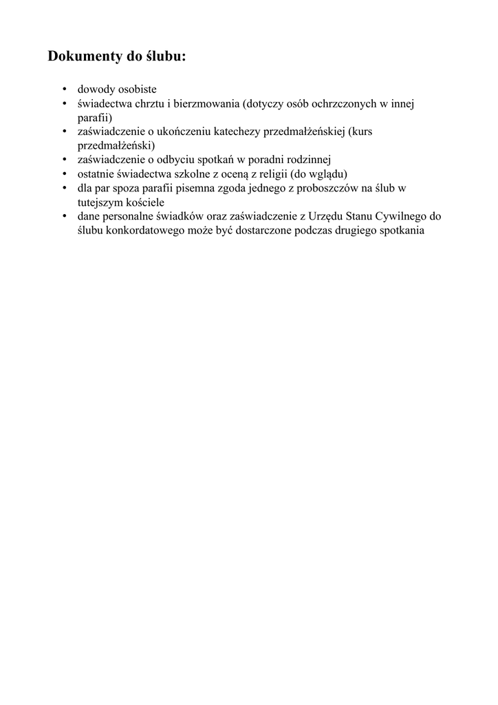 Dokumenty do ślubu: • dowody osobiste • świadectwa chrztu i bierzmowania (dotyczy osób ochrzczonych w innej parafii) • zaświadczenie o ukończeniu katechezy przedmałżeńskiej (kurs przedmałżeński) • zaświadczenie o odbyciu spotkań w poradni rodzinnej • ostatnie świadectwa szkolne z oceną z religii (do wglądu) • dla par spoza parafii pisemna zgoda jednego z proboszczów na ślub w tutejszym kościele • dane personalne świadków oraz zaświadczenie z Urzędu Stanu Cywilnego do ślubu konkordatowego może być dostarczone podczas drugiego spotkania