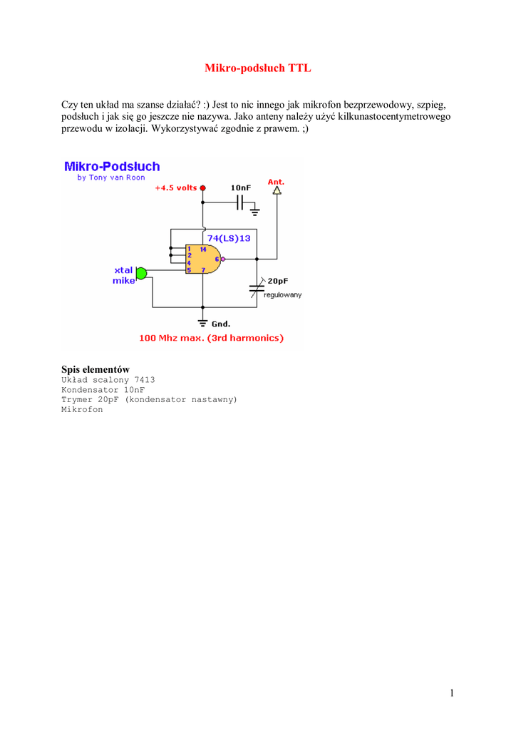 Mikro-podsłuch TTL Czy ten układ ma szanse działać? :) Jest to nic innego jak mikrofon bezprzewodowy, szpieg, podsłuch i jak się go jeszcze nie nazywa. Jako anteny należy użyć kilkunastocentymetrowego przewodu w izolacji. Wykorzystywać zgodnie z prawem. ;) Spis elementów Układ scalony 7413 Kondensator 10nF Trymer 20pF (kondensator nastawny) Mikrofon 1 Prosty konwerter RS232 do TTL Przedstawiony powyżej układ używa dwóch tranzystorów NPN i PNP. Przerywana linia oddziela układ nadajnika i odbiornika. Standard RS232C określa "1" logiczną jako napięcie 3V do -12V, a "0" logiczne jako +3V do +12V. W nadajniki wykorzystano tranzystor PNP BC557. Gdy stan sygnału TxD (po stronie TTL) jest "1" tranzystor Q1 nie przewodzi i TxD (pin 3) dostarcza -9V (najczęściej, zależy od użytego układu do sterowania portem COM) do RxD (pin 2). Jeśli sygnał TxD (po stronie TTL) stanie się równy "0", tranzystor Q1 zacznie przewodzić i napięcie +5V (które odpowiada już standardowi RS232C jako "0" logiczne) zostanie dostarczone do pinu 2 - RxD. Wykorzystując tą metodę należy pamiętać, że sygnał TxD od strony portu COM musi być ustawiony jako "1" aby dostarczał potrzebne napięcie 9V. Układ poniżej przerywanej linii to prosty konwerter, który zamienia sygnał RS232C spowrotem do logiki TTL. Gdy PC wysyła dane do TxD (pin 3), "1" logiczna odpowiada napięciu -9V co powoduje zatkanie tranzystora Q2 i wysłanie to RxD (TTL) napięcia około 5V, natomiast logiczne "0" ustawia tranzystor Q2 w stan przewodzenia i napięcie na RxD spada do blisko 0V. Przedstawiony układ nadaje się do wykorzystania podczas transmisji half-duplex (full-duplex jest niemożliwy ze względu na potrzebę ustawienia pinu TxD podczas odbierania danych przez PC). 2 Transmisja dźwięku w podczerwieni by Manuel Kasper Przedstawione urządzenie potrafi przesyłać dźwięk za pomocą podczerwieni w odległości do jednego metra. Zwiększając wzmocnienie i dokonując pewnych modyfikacji odległość tą można zwiększyć. Nadajnik Nadajnik i odbiornik są prawie takimi samymi układami. Podłączając mikrofon uważaj na polaryzacje gdyż w przypadku złego podłączenia układ nie będzie działać. Próbowałem używać tego układu z zewnętrznymi źródłami dźwięku (takimi jak walkman, PC) ale nie chciało to działać. Odbiornik Prawie każdy foto-tranzystor typu NPN może być w układzie użyty, ale stosując specjalnie czuły na zakres podczerwieni otrzymamy lepszą jakość odbioru. Głośniczek również dowolny, 8 ohm, 0.25W. Po zmontowaniu układu należy go przetestować. W tym celu podłącz baterię 9V do odbiornika i posłuchaj. Powinieneś usłyszeć niewielki szum w głośniku. Następnie podłącz również zasilanie do nadajnika i ustaw diodę nadawczą naprzeciw fototranzystora w 3 odległości ok. 10cm. Powiedz coś do mikrofonu - i sprawdź czy słychać to co mówisz w głośniku. Jeśli nie - sprawdź połączenia. Jeśli nadal nic nie słyszysz sprawdź polaryzcja diody nadawczej i fototranzystora. Jeśli masz wątpliwości zastąp diodę podczerwoną jasną diodą LED i zmniejsz dystans odbiornika od nadajnika do 5cm. Krzyknij coś (byle co, nie musi to być mądre :) to mikrofonu i sprawdź czy zmieniła się jasność świecenia diody. Jeśli nie oznacza to, że masz coś nie tak z nadajnikiem (np. źle podłączony mikrofon). Jeśli dioda zmienia swoją jasność oznacza to, że przyczyna tkwi w odbiorniku. Spis elementów Nadajnik: Rezystory: 220ohm, 1k, 2x4.7k, 3x100k Kondensatory: 100nF, 1uF Tranzystor: BC546 Układ scalony: UA741 Dioda nadawcza podczerwona (InfraRed) Mikrofon elektretowy Odbiornik: Rezystory: 220ohm, 1k, 2x10k, 3x100k Kondensatory: 100nF, 1uF, 47uF Tranzystor: BC546, fototranzystor NPN Układ scalony: UA741 Głośnik: 8ohm 4 Alternatywny przełącznik ON/OFF Układ służy do załączania i wyłączania urządzeń poprzez przekaźnik. Przełączanie jest bardzo "łagodne" nie występują tu (jak w zwykłych przełącznikach mechanicznych) drgania zestyków. Pierwsze wciśnięcie przełącznika S1 powoduje załączenie, a drugie - wyłączenie. Wszystkie nie używane piny układu IC1 należy podłączyć do masy. Zamiast przekaźnika 9woltowego, można użyć np. 5-woltowego wstawiając w szereg z nim niewielki rezystor. Spis elementów Wszystkie rezystory są pół watowe (0.5W) R1 = 10K R2 = 100K R3 = 10K C1 = 0.1uF, Ceramiczny C2 = 1uF/16V, Elektrolityczny D1= 1N4001 Q1 = 2N4401 (ECG lub NTE123AP) IC1 = MC4069, CMOS S1 = Włącznik chwilowy 5 Dwukierunkowy sekwencer diodowy Pod tą fachową nazwą ukrywa się układ do tworzenia prostego efektu świetlnego "Night Rider". Układ składa się z 4 bitowego licznika (4516), która ma możliwość zliczania w górę oraz w dół oraz dwóch dekoderów "1 z 8" (układy 74138). Oscylator złożony z inwertera, rezystora 22k i kondensatora 1uF dostarcza na nóżkę 15 sygnał zegarowy, którego częstotliwość może być regulowana za pomocą potencjometru 500K ohm. Dwa dodatkowe inwertery są użyte jako zatrzask SET/RESET służący do kontroli kierunku zliczania (w górę lub w dół). Upewnij się, że używasz układu 74HC14 a nie 74HCT14, który to może nie pracować poprawnie w tym układzie. Gdy 4516 zliczy najwyższą wartość (1111) niski stan na wyjściu 7 spowoduje ustawienie zatrzasku tak, że na wejście UP/DOWN licznika pojawi się stan niski - licznik zacznie zliczać w dół. Gdy zostanie osiągnięta najniższa wartość (0000) zatrzask jest resetowany (pojawia się stan wysoki), a więc licznik ponownie zacznie zliczać w górę podczas następnego narastające zbocza sygnału zegarowego. Trzy najmłodsze bity licznika (Q0, Q1, Q2) są równolegle połączone z obydwoma dekoderami, a najstarszy bit (Q3) służy do wybrania odpowiedniego dekodera. Układ może służyć również do sterowania oświetleniem większej mocy. Jak zastąpić diody świecące 12 woltowymi żarówkami pok