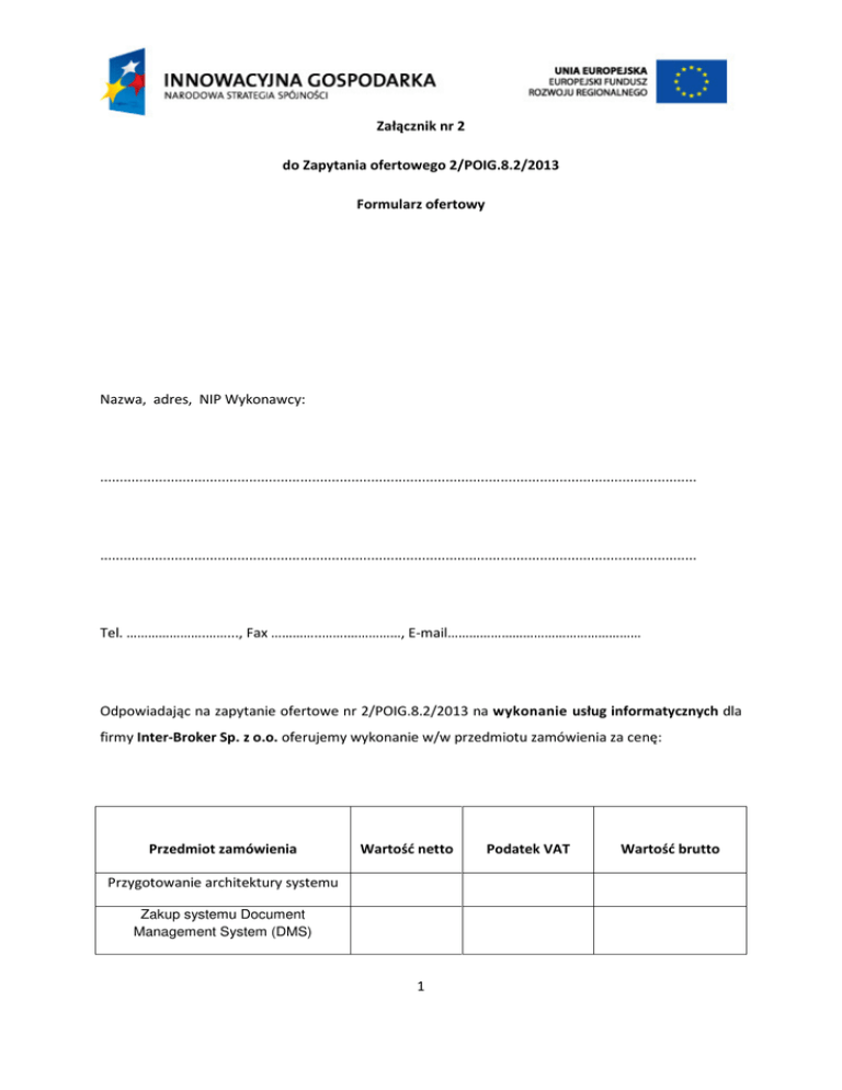 Załącznik nr 2 do Zapytania ofertowego 2/POIG.8.2/2013 Formularz ofertowy Nazwa, adres, NIP Wykonawcy: ........................................................................................................................................................ ........................................................................................................................................................ Tel. ………………….……..., Fax …………..…….……………, E-mail……………………………………………… Odpowiadając na zapytanie ofertowe nr 2/POIG.8.2/2013 na wykonanie usług informatycznych dla firmy Inter-Broker Sp. z o.o. oferujemy wykonanie w/w przedmiotu zamówienia za cenę: Przedmiot zamówienia Wartość netto Przygotowanie architektury systemu Zakup systemu Document Management System (DMS) 1 Podatek VAT Wartość brutto System zarządzania procesami biznesowymi (BPM) System wersjonowania plików (RCS) Baza polis Moduł rozliczania sprzedaży + elektroniczna wymiana danych EDI Baza pojazdów i baza szkód System zarządzania zasobami ludzkimi (HRM) Moduły automatyzujące procesy (współdzielony kalendarz, współdzielona baza kontaktów połączona z telefonem, kilometrówka, delegacje, środki trwałe, poczta korporacyjna, windykacja) Moduł rozliczania składek Wdrożenie podpisu elektronicznego System CRM Baza przetargów Wirtualny Asystent Przetargowy w formule SaaS Moduł raportów Zakup systemu zabezpieczeń , testy bezpieczeństwa, backup danych Zakup dwóch serwerów wraz z zasilaczami nadmiarowymi Razem: 2 Cena roboczogodziny usług dodatkowych wykraczających poza zakres zamówienia Aktualizacje systemu (określona w dniach) Termin gwarancji (określony w latach) Czas reakcji na naprawy (określony w godzinach) Oświadczamy że : • zapoznaliśmy się z treścią zaproszenia, • uważamy się za związanych ofertą przez okres 30 dni od upływu terminu składania ofert, • oddelegujemy do siedziby zamawiającego w czasie trwania projektu jednego pracownika w wymiarze 16 godzin tygodniowo, • posiadamy polisę odpowiedzialności cywilnej kontraktowej z sumą gwarancyjną …………………………….. Załączniki do oferty: • ………………………………………. • ………………………………………. • ………………………………………. • ………………………………………. • ……………………………………… • ……………………………………… • ……………………………………… .......................................... ............................………………………………... ( miejscowość, data) (imię i nazwisko oraz podpis upoważnionego przedstawiciela Oferenta) 3