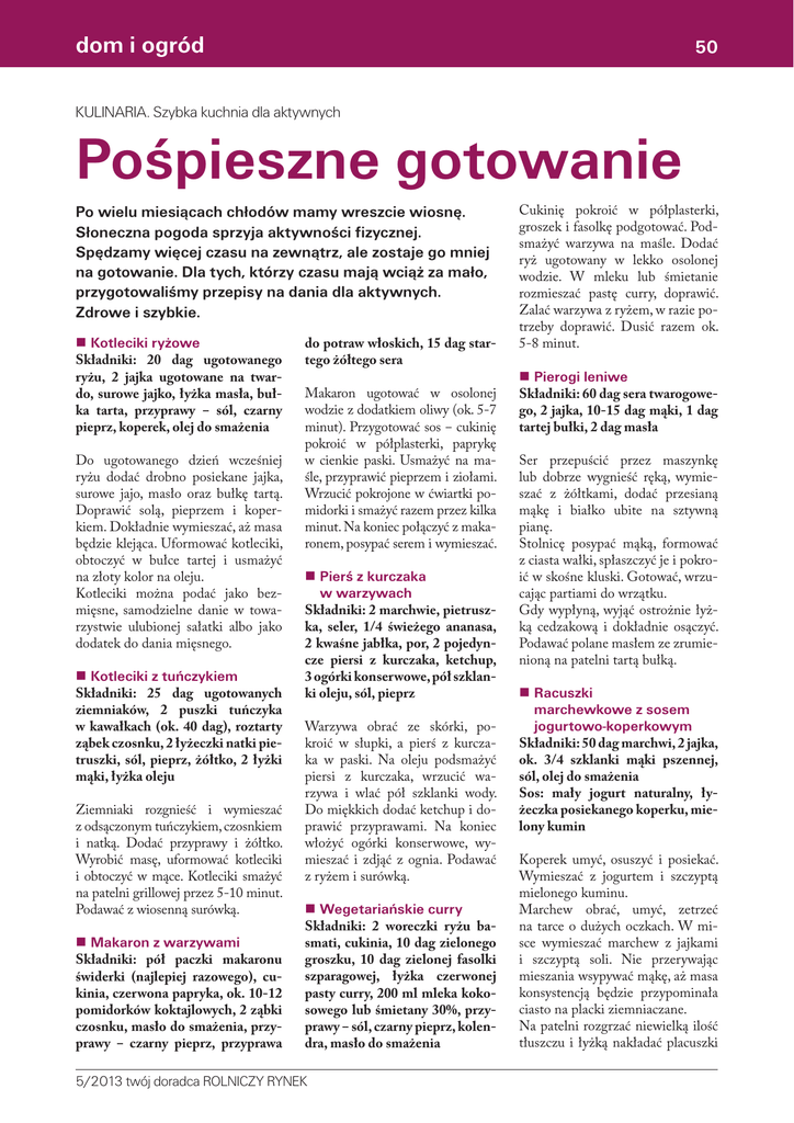 dom i ogród finanse 50 KULINARIA. Szybka kuchnia dla aktywnych Pośpieszne gotowanie Po wielu miesiącach chłodów mamy wreszcie wiosnę. Słoneczna pogoda sprzyja aktywności fizycznej. Spędzamy więcej czasu na zewnątrz, ale zostaje go mniej na gotowanie. Dla tych, którzy czasu mają wciąż za mało, przygotowaliśmy przepisy na dania dla aktywnych. Zdrowe i szybkie. Kotleciki ryżowe Składniki: 20 dag ugotowanego ryżu, 2 jajka ugotowane na twardo, surowe jajko, łyżka masła, bułka tarta, przyprawy ‒ sól, czarny pieprz, koperek, olej do smażenia Do ugotowanego dzień wcześniej ryżu dodać drobno posiekane jajka, surowe jajo, masło oraz bułkę tartą. Doprawić solą, pieprzem i koperkiem. Dokładnie wymieszać, aż masa będzie klejąca. Uformować kotleciki, obtoczyć w bułce tartej i usmażyć na złoty kolor na oleju. Kotleciki można podać jako bezmięsne, samodzielne danie w towarzystwie ulubionej sałatki albo jako dodatek do dania mięsnego. Kotleciki z tuńczykiem Składniki: 25 dag ugotowanych ziemniaków, 2 puszki tuńczyka w kawałkach (ok. 40 dag), roztarty ząbek czosnku, 2 łyżeczki natki pietruszki, sól, pieprz, żółtko, 2 łyżki mąki, łyżka oleju Ziemniaki rozgnieść i wymieszać z odsączonym tuńczykiem, czosnkiem i natką. Dodać przyprawy i żółtko. Wyrobić masę, uformować kotleciki i obtoczyć w mące. Kotleciki smażyć na patelni grillowej przez 5-10 minut. Podawać z wiosenną surówką. Makaron z warzywami Składniki: pół paczki makaronu świderki (najlepiej razowego), cukinia, czerwona papryka, ok. 10-12 pomidorków koktajlowych, 2 ząbki czosnku, masło do smażenia, przyprawy ‒ czarny pieprz, przyprawa do potraw włoskich, 15 dag startego żółtego sera Makaron ugotować w osolonej wodzie z dodatkiem oliwy (ok. 5-7 minut). Przygotować sos ‒ cukinię pokroić w półplasterki, paprykę w cienkie paski. Usmażyć na maśle, przyprawić pieprzem i ziołami. Wrzucić pokrojone w ćwiartki pomidorki i smażyć razem przez kilka minut. Na koniec połączyć z makaronem, posypać serem i wymieszać. Pierś z kurczaka w warzywach Składniki: 2 marchwie, pietruszka, seler, 1/4 świeżego ananasa, 2 kwaśne jabłka, por, 2 pojedyncze piersi z kurczaka, ketchup, 3 ogórki konserwowe, pół szklanki oleju, sól, pieprz Warzywa obrać ze skórki, pokroić w słupki, a pierś z kurczaka w paski. Na oleju podsmażyć piersi z kurczaka, wrzucić warzywa i wlać pół szklanki wody. Do miękkich dodać ketchup i doprawić przyprawami. Na koniec włożyć ogórki konserwowe, wymieszać i zdjąć z ognia. Podawać z ryżem i surówką. Wegetariańskie curry Składniki: 2 woreczki ryżu basmati, cukinia, 10 dag zielonego groszku, 10 dag zielonej fasolki szparagowej, łyżka czerwonej pasty curry, 200 ml mleka kokosowego lub śmietany 30%, przyprawy ‒ sól, czarny pieprz, kolendra, masło do smażenia 5/2013 twój doradca ROLNICZY RYNEK Cukinię pokroić w półplasterki, groszek i fasolkę podgotować. Podsmażyć warzywa na maśle. Dodać ryż ugotowany w lekko osolonej wodzie. W mleku lub śmietanie rozmieszać pastę curry, doprawić. Zalać warzywa z ryżem, w razie potrzeby doprawić. Dusić razem ok. 5-8 minut. Pierogi leniwe Składniki: 60 dag sera twarogowego, 2 jajka, 10-15 dag mąki, 1 dag tartej bułki, 2 dag masła Ser przepuścić przez maszynkę lub dobrze wygnieść ręką, wymieszać z żółtkami, dodać przesianą mąkę i białko ubite na sztywną pianę. Stolnicę posypać mąką, formować z ciasta wałki, spłaszczyć je i pokroić w skośne kluski. Gotować, wrzucając partiami do wrzątku. Gdy wypłyną, wyjąć ostrożnie łyżką cedzakową i dokładnie osączyć. Podawać polane masłem ze zrumienioną na patelni tartą bułką. Racuszki marchewkowe z sosem jogurtowo-koperkowym Składniki: 50 dag marchwi, 2 jajka, ok. 3/4 szklanki mąki pszennej, sól, olej do smażenia Sos: mały jogurt naturalny, łyżeczka posiekanego koperku, mielony kumin Koperek umyć, osuszyć i posiekać. Wymieszać z jogurtem i szczyptą mielonego kuminu. Marchew obrać, umyć, zetrzeć na tarce o dużych oczkach. W misce wymieszać marchew z jajkami i szczyptą soli. Nie przerywając mieszania wsypywać mąkę, aż masa konsystencją będzie przypominała ciasto na placki ziemniaczane. Na patelni rozgrzać niewielką ilość tłuszczu i łyżką nakładać placuszki dom i ogród średniej wielkości. Smażyć je z obu stron na złoty kolor, zdjąć z patelni i odsączyć z nadmiaru tłuszczu. Podawać z sosem koperkowym. Jajka w koszulkach w sosie szczypiorkowym Składniki: 6 jaj, 5 szklanek wody, sól, pół łyżeczki kwasku cytrynowego Sos: łyżka masła, łyżka mąki, 1,5 szklanki wywaru z warzyw lub rosołu, mała cebula, pół szklanki śmietany, 2-3 łyżki drobno posiekanego szczypiorku, sól Z masła i mąki przygotować białą zasmażkę, rozprowadzić częścią wywaru lub rosołem, a następnie połączyć z resztą wywaru. Szczypiorek oczyścić i umyć. Cebulę obrać, opłukać. Szczypiorek i cebulę drobno posiekać. Do wywaru dodać pokrojony szczypiorek, śmietanę, doprawić solą, zagotować. W płaskim rondelku zagotować wodę z solą i kwaskiem. Na powierzchnię wrzącej wody, blisko brzegu naczynia wbić kolejno umyte jaja, przykryć, odstawić i pozostawić na 4 minuty. Następnie wybrać jaja łyżką cedzakową, tak aby nie pozostała na nich woda, ułożyć na półmisku i zalać gorącym sosem. Podawać z ziemniakami puree oraz surówką z warzyw sezonowych lub zieloną sałatą. 51 Omlet biszkoptowy Składniki (dla 4 osób): 8 jaj, 4 łyżki mąki, masło do smażenia Jaja umyć, oddzielić żółtka od białek, z białka ubić pianę. Wlać do niej żółtka i wsypywać powoli mąkę, delikatnie mieszając łopatką. Jednolitą masę przełożyć ostrożnie na patelnię z roztopionym tłuszczem, smażyć powoli. Gdy omlet się zetnie, wstawić do gorącego piekarnika na 5-10 minut. Wyjąć lekko r