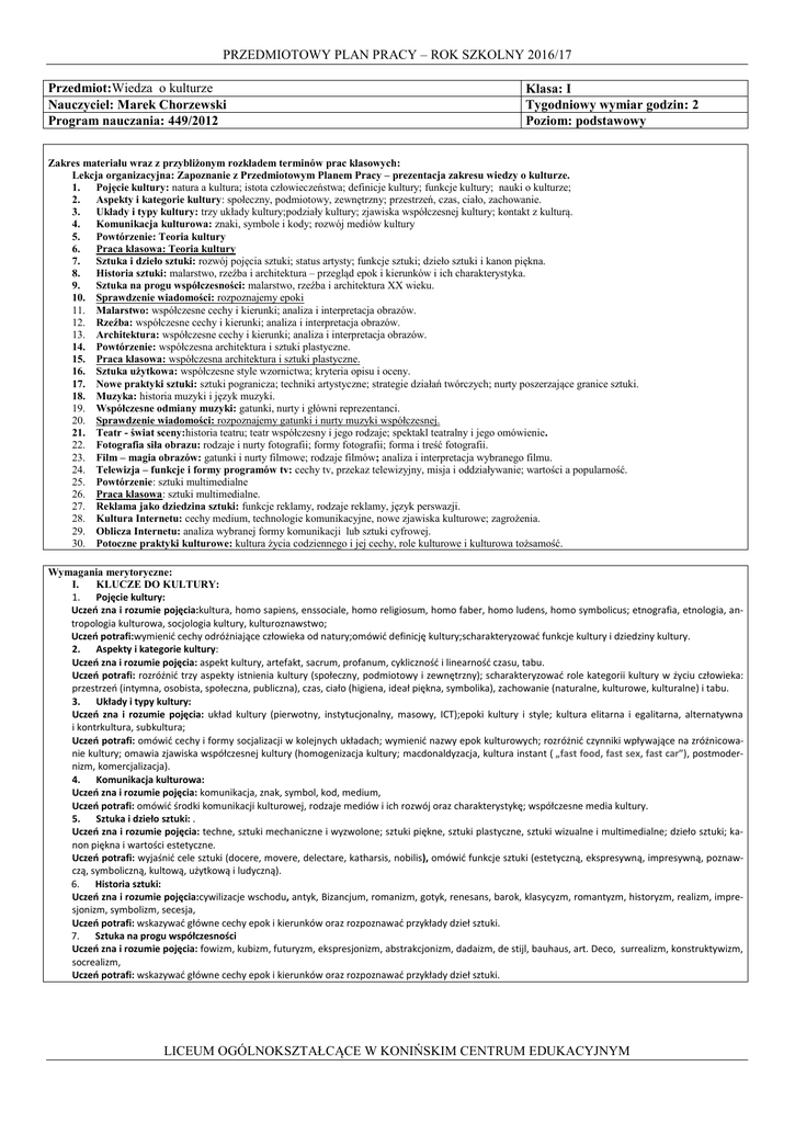PRZEDMIOTOWY PLAN PRACY – ROK SZKOLNY 2016/17 Przedmiot:Wiedza o kulturze Nauczyciel: Marek Chorzewski Program nauczania: 449/2012 Klasa: I Tygodniowy wymiar godzin: 2 Poziom: podstawowy Zakres materiału wraz z przybliżonym rozkładem terminów prac klasowych: Lekcja organizacyjna: Zapoznanie z Przedmiotowym Planem Pracy – prezentacja zakresu wiedzy o kulturze. 1. Pojęcie kultury: natura a kultura; istota człowieczeństwa; definicje kultury; funkcje kultury; nauki o kulturze; 2. Aspekty i kategorie kultury: społeczny, podmiotowy, zewnętrzny; przestrzeń, czas, ciało, zachowanie. 3. Układy i typy kultury: trzy układy kultury;podziały kultury; zjawiska współczesnej kultury; kontakt z kulturą. 4. Komunikacja kulturowa: znaki, symbole i kody; rozwój mediów kultury 5. Powtórzenie: Teoria kultury 6. Praca klasowa: Teoria kultury 7. Sztuka i dzieło sztuki: rozwój pojęcia sztuki; status artysty; funkcje sztuki; dzieło sztuki i kanon piękna. 8. Historia sztuki: malarstwo, rzeźba i architektura – przegląd epok i kierunków i ich charakterystyka. 9. Sztuka na progu współczesności: malarstwo, rzeźba i architektura XX wieku. 10. Sprawdzenie wiadomości: rozpoznajemy epoki 11. Malarstwo: współczesne cechy i kierunki; analiza i interpretacja obrazów. 12. Rzeźba: współczesne cechy i kierunki; analiza i interpretacja obrazów. 13. Architektura: współczesne cechy i kierunki; analiza i interpretacja obrazów. 14. Powtórzenie: współczesna architektura i sztuki plastyczne. 15. Praca klasowa: współczesna architektura i sztuki plastyczne. 16. Sztuka użytkowa: współczesne style wzornictwa; kryteria opisu i oceny. 17. Nowe praktyki sztuki: sztuki pogranicza; techniki artystyczne; strategie działań twórczych; nurty poszerzające granice sztuki. 18. Muzyka: historia muzyki i język muzyki. 19. Współczesne odmiany muzyki: gatunki, nurty i główni reprezentanci. 20. Sprawdzenie wiadomości: rozpoznajemy gatunki i nurty muzyki współczesnej. 21. Teatr - świat sceny:historia teatru; teatr współczesny i jego rodzaje; spektakl teatralny i jego omówienie. 22. Fotografia siła obrazu: rodzaje i nurty fotografii; formy fotografii; forma i treść fotografii. 23. Film – magia obrazów: gatunki i nurty filmowe; rodzaje filmów; analiza i interpretacja wybranego filmu. 24. Telewizja – funkcje i formy programów tv: cechy tv, przekaz telewizyjny, misja i oddziaływanie; wartości a popularność. 25. Powtórzenie: sztuki multimedialne 26. Praca klasowa: sztuki multimedialne. 27. Reklama jako dziedzina sztuki: funkcje reklamy, rodzaje reklamy, język perswazji. 28. Kultura Internetu: cechy medium, technologie komunikacyjne, nowe zjawiska kulturowe; zagrożenia. 29. Oblicza Internetu: analiza wybranej formy komunikacji lub sztuki cyfrowej. 30. Potoczne praktyki kulturowe: kultura życia codziennego i jej cechy, role kulturowe i kulturowa tożsamość. Wymagania merytoryczne: I. KLUCZE DO KULTURY: 1. Pojęcie kultury: Uczeń zna i rozumie pojęcia:kultura, homo sapiens, enssociale, homo religiosum, homo faber, homo ludens, homo symbolicus; etnografia, etnologia, antropologia kulturowa, socjologia kultury, kulturoznawstwo; Uczeń potrafi:wymienić cechy odróżniające człowieka od natury;omówić definicję kultury;scharakteryzować funkcje kultury i dziedziny kultury. 2. Aspekty i kategorie kultury: Uczeń zna i rozumie pojęcia: aspekt kultury, artefakt, sacrum, profanum, cykliczność i linearność czasu, tabu. Uczeń potrafi: rozróżnić trzy aspekty istnienia kultury (społeczny, podmiotowy i zewnętrzny); scharakteryzować role kategorii kultury w życiu człowieka: przestrzeń (intymna, osobista, społeczna, publiczna), czas, ciało (higiena, ideał piękna, symbolika), zachowanie (naturalne, kulturowe, kulturalne) i tabu. 3. Układy i typy kultury: Uczeń zna i rozumie pojęcia: układ kultury (pierwotny, instytucjonalny, masowy, ICT);epoki kultury i style; kultura elitarna i egalitarna, alternatywna i kontrkultura, subkultura; Uczeń potrafi: omówić cechy i formy socjalizacji w kolejnych układach; wymienić nazwy epok kulturowych; rozróżnić czynniki wpływające na zróżnicowanie kultury; omawia zjawiska współczesnej kultury (homogenizacja kultury; macdonaldyzacja, kultura instant ( „fast food, fast sex, fast car”), postmodernizm, komercjalizacja). 4. Komunikacja kulturowa: Uczeń zna i rozumie pojęcia: komunikacja, znak, symbol, kod, medium, Uczeń potrafi: omówić środki komunikacji kulturowej, rodzaje mediów i ich rozwój oraz charakterystykę; współczesne media kultury. 5. Sztuka i dzieło sztuki: . Uczeń zna i rozumie pojęcia: techne, sztuki mechaniczne i wyzwolone; sztuki piękne, sztuki plastyczne, sztuki wizualne i multimedialne; dzieło sztuki; kanon piękna i wartości estetyczne. Uczeń potrafi: wyjaśnić cele sztuki (docere, movere, delectare, katharsis, nobilis), omówić funkcje sztuki (estetyczną, ekspresywną, impresywną, poznawczą, symboliczną, kultową, użytkową i ludyczną). 6. Historia sztuki: Uczeń zna i rozumie pojęcia:cywilizacje wschodu, antyk, Bizancjum, romanizm, gotyk, renesans, barok, klasycyzm, romantyzm, historyzm, realizm, impresjonizm, symbolizm, secesja, Uczeń potrafi: wskazywać główne cechy epok i kierunków oraz rozpoznawać przykłady dzieł sztuki. 7. Sztuka na progu współczesności Uczeń zna i rozumie pojęcia: fowizm, kubizm, futuryzm, ekspresjonizm, abstrakcjonizm, dadaizm, de stijl, bauhaus, art. Deco, surrealizm, konstruktywizm, socrealizm, Uczeń potrafi: wskazywać główne cechy epok i kierunków oraz rozpoznawać przykłady dzieł sztuki. LICEUM OGÓLNOKSZTAŁCĄCE W KONIŃSKIM CENTRUM EDUKACYJNYM PRZEDMIOTOWY PLAN PRACY – ROK SZKOLNY 2016/17 II. WSPÓŁCZESNA KULTURA I SZTUKA 1. Malarstwo: Uczeń zna i rozumie pojęcia: ekspresjonizm abstrakcyjny, (informel, taszyzm); pop-art.; minimalizm; hiperrealizm; neoekspresjonizm, postmodernizm; streetart; transawangarda; język m