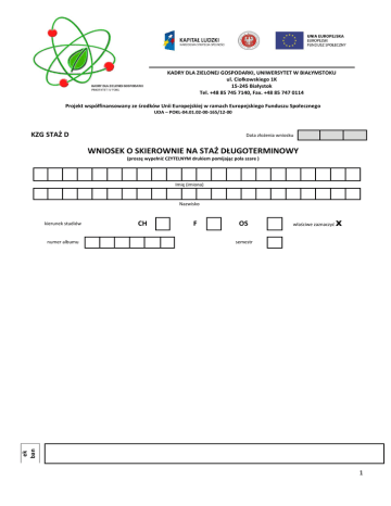 KADRY DLA ZIELONEJ GOSPODARKI, UNIWERSYTET W BIAŁYMSTOKU ul. Ciołkowskiego 1K 15-245 Białystok Tel. +48 85 745 7140, Fax. +48 85 747 0114 Projekt współfinansowany ze środków Unii Europejskiej w ramach Europejskiego Funduszu Społecznego UDA – POKL-04.01.02-00-165/12-00 KZG STAŻ D Data złożenia wniosku WNIOSEK O SKIEROWNIE NA STAŻ DŁUGOTERMINOWY (proszę wypełnić CZYTELNYM drukiem pomijając pola szare ) Imię (imiona) Nazwisko kierunek studiów F OS właściwe zaznaczyć X semestr Rac hun ek ban ko wy numer albumu CH 1 nazwa banku - - - - - - numer konta bakowego w formacie NRB Dane kontaktowe (do korespondencji) ulica numer domu numer lokalu miejscowość - kod pocztowy telefon stacjonarny telefon komórkowy adres e-mail @ Składam wniosek o skierowanie na staż długoterminowy i przyznanie stypendium stażowego w semestrze Letnim w roku akademickim 2 0 / wpisać rok akademicki na podstawie wyników w nauce osiągniętych w 1 1-5 semestrze studiów. Oświadczam, że w poszczególnych semestrach osiągnąłem/ęłam średnią ocen 2 3 4 5 Średnia 1-5 Preferowane miejsce odbycia stażu (opcja): Nazwa instytucji: Adres instytucji: 2 Dane kontaktowe instytucji Oświadczenie Świadomy/a odpowiedzialności karnej za składanie fałszywych zeznań, wynikającej z art. 233 § 1 kk oświadczam, że nie brałam/em udziału w stażach realizowanych w ramach Priorytetu IV POKL, nie pozostaję w stosunku pracy w pełnym wymiarze godzin …..……………………………………… …………………………………………… MIEJSCOWOŚĆ I DATA CZYTELNY PODPIS UCZESTNIKA PROJEKTU …..…………………………………. PODPIS OSOBY PRZYJMUJĄCEJ WNIOSEK DECYZJA KOMISJI KONKURSOWEJ WYDZIAŁU BIOLOGICZNO-CHEMICZNEGO UwB WYDZIAŁU FIZYKI UwB Data Komisja konkursowa postanawia przyznać stypendium stażowe TAK NIE w wysokości PLN słownie PLN na okres od do dzień/miesiąc rok dzień/miesiąc rok na odbycie stażu krótkoterminowego w 3 Nazwa i adres instytucji/ uzasadnienie w przypadku odmowy Komisja konkursowa Imię i Nazwisko Podpis 4