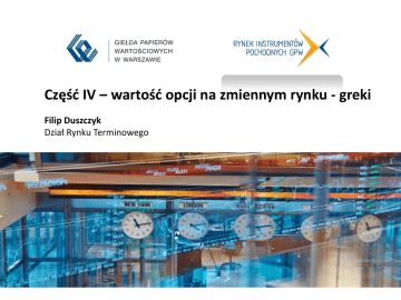 Część IV – wartość opcji na zmiennym rynku - greki Filip Duszczyk Dział Rynku Terminowego Agenda 1. Wprowadzenie 2. Greki - Delta - Gamma - Theta - Vega - Rho 3. Stopa Dywidendy 4. Podsumowanie 2 Wprowadzenie • Inwestor, który ignoruje ryzyko powiązane z otwartą pozycją opcyjną jest narażony na ogromne straty. • Inwestując np. w kontrakt terminowy boimy się jednego – niekorzystnej zmiany kursu. • Niestety jest wiele współczynników zmiany wartości premii opcyjnej • Każdy inwestor opcyjny powinien wiedzieć jak będzie zachowywała się wartość premii opcyjnej pod wpływem danych sytuacji rynkowych. • Zwróćmy uwagę na wpływy ogólnych czynników instrumentu bazowego na wartości opcji: 3 Wprowadzenie • Jeżeli instrument bazowy rośnie lub spada, wtedy w zależności od rodzaju opcji (kupna czy sprzedaży) rośnie lub spada prawdopodobieństwo, że dana opcja wygaśnie ITM. • Jeżeli zmienność rośnie, skrajne wyniki stają się bardziej prawdopodobne i wartości opcji rosną. • Jeżeli zmienność spada lub upływa czas, skrajne wyniki stają się jeszcze bardziej małoprawdopodobne i wartości opcji maleją. 4 Greki DELTA (∆) (1) • Wskaźnik DELTA wiąże ze sobą kilka interpretacji: Szybkość Zmiany • Wskaźnik zmiany wartości opcji w stosunku do zmiany kursu instrumentu bazowego. • Teoretycznie, premia opcyjna nie może zmieniać się szybciej niż instrument bazowy; dlatego górna granica wartości Delty zawsze = 1,00 (w praktyce ignoryjemy przecinek i mówimy 100) • Opcja z Deltą 100, za każdy punkt zmiany instrumentu bazowego zmieni swoją wartość o tyle samo – zmienia się w 100% jak instrument bazowy. • Opcje kupna mają Delty od 0 do 100. czyli opcja kupna z Deltą = 25 zmienią wartość o 25% w stosunku do instrumentu bazowego. Za 1 pkt. wzrostu instrumentu bazowego, wartość opcji kupna rośnie o 0,25 pkt.) • Podobnie zachowują się opcje sprzedaży, lecz w przeciwnym kierunku. • Opcje sprzedaży mają Delty od 0 do -100. czyli opcja sprzedazy z Deltą = - 75 zmienia wartość o -75% w stosunku do instrumentu bazowego. Za 1 pkt. wzrostu instrumentu bazowego, wartość opcji sprzedaży traci 0,75 pkt. 5 Greki DELTA (∆) (2) ∆ (Delta) Cena WIG20 Cena przykładowej opcji kupna (CALL) z kursem wykonania 2400 Cena przykładowej opcji sprzedaży (PUT) z kursem wykonania 2400 2410 pkt. 55 Pkt. 50 pkt. +10 Pkt. 2400 Pkt. +5 Pkt. -5 Pkt. 50 pkt. 45 Pkt. ∆ = 0,50 6 Greki DELTA (∆) (3) Współczynnik zabezpieczenia (Hedge Ratio) • Jeżeli chcemy otworzyć przeciwstawną pozycję w instrumencie bazowym w celu zabezpieczenia pozycji opcyjnej (hedge), Delta wskazuje jaki musimy dobrać wolumen. • Instrument bazowy zawsze będzie miał Deltę = 100. • Jeżeli opcja ma Deltę = 25 (0,25), prawidłowa proporcja instrumentu bazowego do pozycji opcyjnej = 100 do 25 czyli 4 do 1. • Możemy też stwierdzić, że mając Deltę = 30, wolumen pozycji przeciwstawnej instrumentu bazowego = 30% wolumenu pozycji opcyjnej. • Opcje kupna – jeżeli nabywamy, odpowiednią transakcją przeciwstawną jest sprzedaż instrumentu bazowego; jeżeli wystawiamy opcje musimy nabyć instrument bazowy. • Opcje sprzedaży – jeżeli nabywamy, odpowiednią transakcją przeciwstawną jest nabycie instrumentu bazowego; jeżeli wystawiamy opcje musimy też wystawić instrument bazowy. 7 Greki DELTA (∆) (4) Hedge Ratio (2) • Omówiliśmy otwieranie pozycji przeciwstawnej używając instrumentu bazowego. • Istnieje też możliwość otworzenia pozycji przeciwstawnej za pomocą innych opcji. • Powiedzmy, że nabywamy 2 opcje kupna z Deltą 50 każda i 10 opcji sprzedaży z Deltą -10 każda • Nasza łączna pozycja jest Delta neutralna (Delta neutral) (+2 x +50) + (+10 x -10) = (+100) + (-100) = 0 • Pozycje opcyjne mogą być skomplikowane z wieloma otwartymi długimi i krótkimi pozycjami opcji lub instrumentu bazowego; • Jeżeli Delty wszystkich tych pozycji dodają się do zera, cała pozycja jest nadal Delta neutralna. 8 Greki DELTA (∆) (5) Teoretyczna lub równoważna pozycja instrumentu bazowego • Jeżeli inwestor przyzwyczajony jest do analizowania ryzyka portfela przy zastosowaniu ekspozycji instrumentu bazowego, Delta może wskazać podobną kierunkową charakterystykę pozycji opcyjnej. • Delta instrumentu bazowego zawsze = 100 • Inwestor, który nabył jedną opcję z Deltą 50 kontroluje ok. 50% instrumentu bazowego. • Mówimym, że inwestor ma długie 50 Delt (Long 50 Deltas). • Jeżeli nabywa 10 takich opcji, pozycja jest długa 500 Delt – co w odniesieniu do instrumentu bazowego = + 5 (+1 instrument bazowy = Delta +100) • Podobnie, jeżeli inwestor wystawi 20 opcji z Deltą -25 każda, końcowa pozycja Delty = +500 (-20 x -25 = +500). • Pamiętajmy, że Delta jako równoważna pozycja w instrumencie bazowym jest tylko teoretycznym pojęciem obowiązującym w danym momencie. Pozycja opcyjna jest wrażliwa nie tylko na kierunek instrumentu bazowego lecz również na inne czynniki występujące na rynku. 9 Greki DELTA (∆) (6) Zbliżone prawdopodobieństwo • Jeżeli zignorujemy +/-, Delta określa bardzo zbliżone prawdopodobieństwo, że dana opcja wygaśnie ITM. • Opcje kupna z Deltą 25 lub opcje sprzedaży z Deltą -25, mniej więcej w 25% przypadków będą ITM w dniu wygaśnięcia. • Opcje, których Delty zbliżają się do 100 mają coraz to większe prawdopodobieństwo wykonania. • Tym samym opcje, których Delty zbliżają się do 0 charakteryzują się coraz to mniejszym prawdopodobieństwem wykonania. • Opcje ATM mają Delty zbliżone do 50. • Zakładając losowe zmiany kursu instrumentu bazowego, opcja z tym samym kursem wykonania co wartość instrumentu bazowego, w 50% przypadków zostanie wykonana a w 50% przypadków nie zostanie wykonana. • Pamiętajmy, że Delta jest tylko zbliżonym prawdopodobieństwem wykonania. 10 Greki GAMMA (Γ) • Wskazuje prędkoś