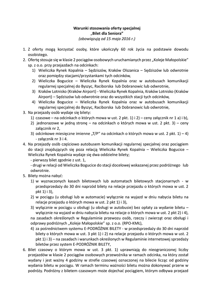 Warunki stosowania oferty specjalnej „Bilet dla Seniora” (obowiązują od 15 maja 2016 r.) 1. Z oferty mogą korzystać osoby, które ukończyły 60 rok życia na podstawie dowodu osobistego. 2. Ofertę stosuje się w klasie 2 pociągów osobowych uruchamianych przez „Koleje Małopolskie” sp. z o.o. przy przejazdach na odcinkach: 1) Wieliczka Rynek Kopalnia – Sędziszów, Kraków Olszanica – Sędziszów lub odwrotnie oraz pomiędzy stacjami/przystankami tych odcinków, 2) Wieliczka Bogucice – Wieliczka Rynek Kopalnia oraz w autobusach komunikacji regularnej specjalnej do Byszyc, Raciborska lub Dobranowic lub odwrotnie, 3) Kraków Lotnisko (Kraków Airport) - Wieliczka Rynek Kopalnia, Kraków Lotnisko (Kraków Airport) – Sędziszów lub odwrotnie oraz do wszystkich stacji tych odcinków, 4) Wieliczka Bogucice – Wieliczka Rynek Kopalnia oraz w autobusach komunikacji regularnej specjalnej do Byszyc, Raciborska lub Dobranowic lub odwrotnie, 3. Na przejazdy osób wydaje się bilety: 1) czasowe – na odcinkach o których mowa w ust. 2 pkt. 1) i 2) – ceny załącznik nr 1 a) i b), 2) jednorazowe w jedną stronę – na odcinkach o których mowa w ust. 2 pkt. 3) – ceny załącznik nr 2, 3) odcinkowe miesięczne imienne „T/P” na odcinkach o których mowa w ust. 2 pkt. 1) – 4) - załącznik nr 3 i 4. 4. Na przejazdy osób częściowo autobusem komunikacji regularnej specjalnej oraz pociągiem do stacji znajdujących się poza relacją Wieliczka Rynek Kopalnia – Wieliczka Bogucice – Wieliczka Rynek Kopalnia wydaje się dwa oddzielne bilety; - pierwszy bilet zgodnie z ust. 1, - drugi w relacji od Wieliczka Bogucice do stacji docelowej wskazanej przez podróżnego lub odwrotnie. 5. Bilety można nabyć: 1) w wyznaczonych kasach biletowych lub automatach biletowych stacjonarnych - w przedsprzedaży do 30 dni naprzód bilety na relacje przejazdu o których mowa w ust. 2 pkt 1) i 3), 2) w pociągu (u obsługi lub w automacie) wyłącznie na wyjazd w dniu nabycia biletu na relacje przejazdu o których mowa w ust. 2 pkt 1) i 3), 3) wyłącznie w pociągu u obsługi (u obsługi w autobusie) bez opłaty za wydanie biletu – wyłącznie na wyjazd w dniu nabycia biletu na relacje o których mowa w ust. 2 pkt 2) i 4), na zasadach określonych w Regulaminie przewozu osób, rzeczy i zwierząt oraz obsługi i odprawy podróżnych „Koleje Małopolskie” sp. z o.o. (RPO-KMŁ), 4) za pośrednictwem systemu E-PODRÓŻNIK BILETY - w przedsprzedaży do 30 dni naprzód bilety o których mowa w ust. 3 pkt 1) i 2) na relacje przejazdu o których mowa w ust. 2 pkt 1) i 3) – na zasadach i warunkach określonych w Regulaminie internetowej sprzedaży biletów przez system E-PODRÓŻNIK BILETY, 6. Bilet czasowy o którym mowa w ust. 3 pkt. 1) uprawniają do nieograniczonej liczby przejazdów w klasie 2 pociągów osobowych przewoźnika w ramach odcinka, na który został wydany i jest ważny 4 godziny w strefie czasowej oznaczonej na bilecie licząc od godziny wydania biletu w pociągu. W ramach terminu ważności biletu można dokonywać przerw w podróży. Podróżny z biletem czasowym może dojechać pociągiem, którym odbywa przejazd 7. 8. 9. 10. 11. 12. 13. najdalej do stacji, na której pociąg zgodnie z rozkładem jazdy zatrzymuje się po raz ostatni przed upływem terminu ważności biletu. Jeżeli nie ukończono podróży w terminie ważności biletu z powodu opóźnienia przyjazdu pociągu zdążającego do stacji przeznaczenia, podróżny może opóźnionym pociągiem dojechać do tej stacji po upływie terminu ważności biletu. Bilet jednorazowy w jedną stronę o którym mowa w ust. 3 pkt. 2) uprawnia do jednorazowego przejazdu w jedną stronę i jest ważny 2 godziny w strefie czasowej oznaczonej na bilecie licząc od godziny wydania biletu w pociągu. Podróż musi być rozpoczęta i zakończona w terminie wskazanym na bilecie z zastrzeżeniem ust. 6. W ramach terminu ważności biletu można dokonywać przerw w podróży. Podróżny z biletem jednorazowym na przejazd w jedną stronę, ma prawo dojechać do stacji przeznaczenia po upływie terminu ważności biletu, gdy przejazd odbywa się: 1) bezpośrednim pociągiem od stacji wyjazdu, wskazanej na bilecie, albo 2) z przesiadaniem po drodze – pod warunkiem, że przesiadanie odbywa się do najbliższego pociągu jadącego w kierunku stacji przeznaczenia, jeżeli pociąg, którym rozpoczęto podróż nie dojeżdża do tej stacji. Bilet odcinkowy miesięczny imienny uprawnia do nieograniczonej liczby przejazdów na odcinku ograniczonym stacjami określonymi na bilecie w terminie ważności biletu. Oferty nie łączy się z innymi ofertami taryfowymi, z wyjątkiem oferty Zasady odprawy osób, rzeczy lub zwierząt w autobusach komunikacji regularnej specjalnej organizowanych przez Gminę Wieliczka na odcinku: Wieliczka Rynek Kopalnia – Byszyce, Wieliczka Rynek Kopalnia – Raciborsko, Wieliczka Rynek Kopalnia – Dobranowice. W przypadku pozostawienia samochodu na parkingu przy przystanku Wieliczka Park oraz przejazdu na podstawie biletu wg oferty z wyjątkiem biletów wydanych: 1) wg oferty specjalnej „Zasady odprawy osób, rzeczy lub zwierząt w autobusach komunikacji regularnej specjalnej organizowanej przez Gminę Wieliczka na liniach B1/R1/D1”, 2) za pośrednictwem systemu E-PODRÓŻNIK BILETY, 3) w kasach biletowych, podróżny ma prawo w tym dniu do wyjazdu samochodem z w/w parkingu, przy uwzględnieniu godzin, w których parking jest czynny bez ponoszenia kosztów za parkowanie samochodu. Warunkiem korzystania z bezpłatnego parkingu jest posiadanie biletu, o którym mowa wyżej ze wskazaniem stacji początkowej lub końcowej odcinka odpowiednio Wieliczka Park lub Wieliczka Rynek Kopalnia. Zasady korzystania z parkingu zamieszczone są w „Warunkach taryfowych oferty specjalnej P&R Wieliczka”. Przejście do pociągu innego przewoźnika nie jest dozwolone. W sprawach nieuregulowanych niniejszymi warunkami s
