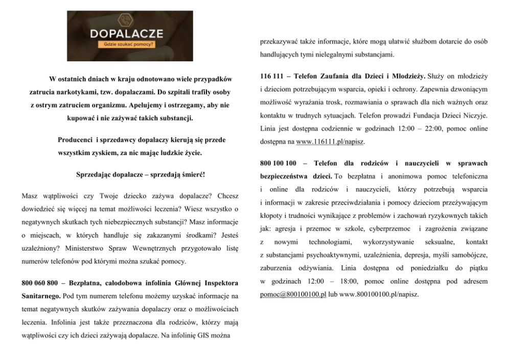 przekazywać także informacje, które mogą ułatwić służbom dotarcie do osób handlujących tymi nielegalnymi substancjami. W ostatnich dniach w kraju odnotowano wiele przypadków 116 111 – Telefon Zaufania dla Dzieci i Młodzieży. Służy on młodzieży zatrucia narkotykami, tzw. dopalaczami. Do szpitali trafiły osoby i dzieciom potrzebującym wsparcia, opieki i ochrony. Zapewnia dzwoniącym z ostrym zatruciem organizmu. Apelujemy i ostrzegamy, aby nie możliwość wyrażania trosk, rozmawiania o sprawach dla nich ważnych oraz kupować i nie zażywać takich substancji. kontaktu w trudnych sytuacjach. Telefon prowadzi Fundacja Dzieci Niczyje. Linia jest dostępna codziennie w godzinach 12:00 – 22:00, pomoc online Producenci i sprzedawcy dopalaczy kierują się przede dostępna na www.116111.pl/napisz. wszystkim zyskiem, za nic mając ludzkie życie. 800 100 100 – Telefon dla rodziców i nauczycieli w sprawach Sprzedając dopalacze – sprzedają śmierć! Masz wątpliwości czy Twoje dziecko zażywa dopalacze? Chcesz dowiedzieć się więcej na temat możliwości leczenia? Wiesz wszystko o bezpieczeństwa dzieci. To bezpłatna i anonimowa pomoc telefoniczna i online dla rodziców i nauczycieli, którzy uzależniony? Ministerstwo Spraw Wewnętrznych przygotowało listę numerów telefonów pod którymi można szukać pomocy. wsparcia i informacji w zakresie przeciwdziałania i pomocy dzieciom przeżywającym kłopoty i trudności wynikające z problemów i zachowań ryzykownych takich negatywnych skutkach tych niebezpiecznych substancji? Masz informacje o miejscach, w których handluje się zakazanymi środkami? Jesteś potrzebują i zagrożenia związane jak: agresja i przemoc w szkole, cyberprzemoc z nowymi technologiami, wykorzystywanie seksualne, kontakt z substancjami psychoaktywnymi, uzależnienia, depresja, myśli samobójcze, zaburzenia odżywiania. Linia dostępna od poniedziałku do piątku 800 060 800 – Bezpłatna, całodobowa infolinia Głównej Inspektora w godzinach 12:00 – 18:00, pomoc online dostępna pod adresem Sanitarnego. Pod tym numerem telefonu możemy uzyskać informacje na [email protected] lub www.800100100.pl/napisz. temat negatywnych skutków zażywania dopalaczy oraz o możliwościach leczenia. Infolinia jest także przeznaczona dla rodziców, którzy mają wątpliwości czy ich dzieci zażywają dopalacze. Na infolinię GIS można 800 12 12 12 - Dziecięcy Telefon Zaufania Rzecznika Praw Co to są „dopalacze” Dziecka. Osoby poszukujące pomocy oraz informacji na temat dopalaczy Dopalacze to różnego rodzaju substancje psychoaktywne – takie, które mogą korzystać także z telefonu zaufania Rzecznika Praw Dziecka. Numer przeznaczony jest zarówno dla dzieci, jak i dorosłych, którzy chcą powodują zmiany w zachowaniu człowieka, czy też postrzeganiu przez niego rzeczywistości. W działaniu przypominają zatem alkohol lub jak narkotyki. Dopalacze bywają mieszankami substancji naturalnych np. ziół, lub mogą być zgłosić problemy dzieci. Telefon jest czynny od poniedziałku do piątku syntetyczne, czyli wytworzone w laboratorium chemicznym. Cała specyfika w godzinach od 8.15 do 20.00. Po godzinie 20.00 oraz w dni wolne od tzw. „legalnych narkotyków” polega na tym, że są one produkowane pracy, każdy może przedstawić problem i zostawić numer kontaktowy. substancji nie uznawanych za szkodliwe czy niedozwolone. Dopiero mieszanka 801 199 990 – Ogólnopolski Telefon Zaufania Narkotyki sytuacjach, pomagają wyszukać odpowiednią formę pomocy i informują na temat ryzyka używania narkotyków i ,,dopalaczy”. adresowany jest nie tylko do osób używających receptura – powoduje ich ukierunkowane działanie. – w którym specjaliści udzielają wsparcia w trudnych Narkomania, – z Telefon narkotyków Jak działają dopalacze Twórcy dopalaczy tak dobierają poszczególne składniki specyfików, żeby wywołać konkretne działanie po jego zażyciu. Wszelkiego rodzaju pochodne piperazyny maja na przykład działanie psychodeliczne, podobne do stanów po zażyciu narkotyków: ecstasy i amfetaminy. Bardzo często do produkcji i „dopalaczy”, ale także ich bliskich i rodzin. Telefon prowadzony jest dopalaczy przez Krajowe Biuro do Spraw Przeciwdziałania Narkomanii i czynny jest oraz MDPV i metylokatynon – wszystkie te substancje powodują zmiany codziennie w godzinach 16:00 – 21:00 w psychice, uczucie euforii i duże pobudzenie. Poradnia internetowa www.narkomania.org.pl – w której, można uzyskać anonimową pomoc on- line lekarza psychiatry, psychologa i prawnika; dwa razy w tygodniu można skorzystać z konsultacji za pośrednictwem chatu. Poradnia prowadzona jest na zlecenie Krajowego Biura do Spraw Przeciwdziałania Narkomanii. wykorzystywane są również syntetyczne kannabinoidy, Czy dopalacze szkodzą Zażywanie dopalaczy może być niebezpieczne! Dlaczego? Bo: mefedron, efedron, metylokatynon, czy chociażby równie popularny składnik dopalaczy jakim jest salwinoryna A (szałwia wieszcza), powodują znaczny wzrost tętna, szybszy oddech. Częste zażywanie tych substancji może prowadzić do wyczerpania organizmu, a w skrajnych przypadkach do zatrucia. Opracowanie; pedagog szkolny Lucyna Stec