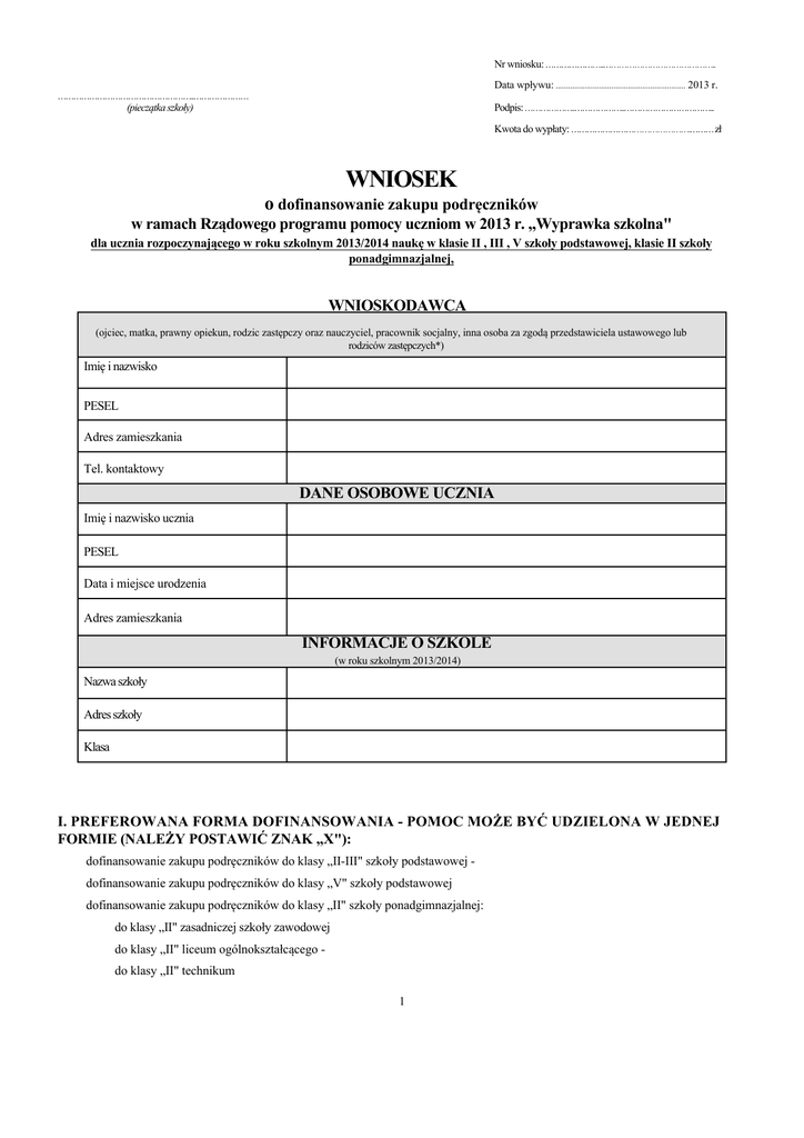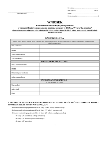 Nr wniosku: …………………..…………………………………….. Data wpływu: ............................................................... 2013 r. ……………………………………………..………………… (pieczątka szkoły) Podpis: ………………..………………..……………………………... Kwota do wypłaty: ……………………………………….……… zł WNIOSEK o dofinansowanie zakupu podręczników w ramach Rządowego programu pomocy uczniom w 2013 r. „Wyprawka szkolna" dla ucznia rozpoczynającego w roku szkolnym 2013/2014 naukę w klasie II , III , V szkoły podstawowej, klasie II szkoły ponadgimnazjalnej, WNIOSKODAWCA (ojciec, matka, prawny opiekun, rodzic zastępczy oraz nauczyciel, pracownik socjalny, inna osoba za zgodą przedstawiciela ustawowego lub rodziców zastępczych*) Imię i nazwisko PESEL Adres zamieszkania Tel. kontaktowy DANE OSOBOWE UCZNIA Imię i nazwisko ucznia PESEL Data i miejsce urodzenia Adres zamieszkania INFORMACJE O SZKOLE (w roku szkolnym 2013/2014) Nazwa szkoły Adres szkoły Klasa I. PREFEROWANA FORMA DOFINANSOWANIA - POMOC MOŻE BYĆ UDZIELONA W JEDNEJ FORMIE (NALEŻY POSTAWIĆ ZNAK „X"): dofinansowanie zakupu podręczników do klasy „II-III" szkoły podstawowej dofinansowanie zakupu podręczników do klasy „V" szkoły podstawowej dofinansowanie zakupu podręczników do klasy „II" szkoły ponadgimnazjalnej: do klasy „II" zasadniczej szkoły zawodowej do klasy „II" liceum ogólnokształcącego do klasy „II" technikum 1 II. DANE O DOCHODACH CZŁONKÓW RODZINY UCZNIA, UZYSKANYCH W MIESIĄCU POPRZEDZAJĄCYM MIESIĄC ZŁOŻENIA WNIOSKU W 2013 R. - dochód obliczany jest na podstawie ustawy z dnia 12 marca 2004 r. o pomocy społecznej (Dz. U. z 2009 r. Nr 175, poz. 1362, z późn. zm.) i nie może przekroczyć 456 zł na osobę w rodzinie Oświadczam, że moja rodzina składa się z niżej wymienionych osób, pozostających i zamieszkujących we wspólnym gospodarstwie domowym - łącznie z wnioskodawcą i uczniem ubiegającym się o pomoc: L.p. Imię i nazwisko Data urodzenia Stopień pokrewieństwa Miejsce pracy nauki Źródła oraz kwota miesięcznego dochodu (netto) rodziny uzyskanego w miesiącu poprzedzającym miesiąc złożenia wniosku t.j. w .............................................. 2013 r., z tytułu: (miesiąc) (miesięczna wysokość dochodu na osobę w rodzinie ucznia nie może być wyższa niż kwota, o której mowa w art. 8 ust. 1 ustawy o pomocy społecznej z dnia 12 marca 2004 r. czyli 456 zł netto): 1. Wynagrodzenie za pracę (łączna kwota) - ……………………………………………………….……………….. zł 2. Dochody z działalności gospodarczej wykonywanej osobiście (w tym umowy o dzieło i zlecenia) - ……………………………………………………………………………... zł 3. Liczba ha przeliczeniowych - ………………………………….… x 250 zł Dochód z gospodarstwa rolnego - ……………………………………………………………………………....... zł Emerytury, renty inwalidzkie, renty socjalne, renty strukturalne i rodzinne, w tym również zagraniczne, świadczenia przedemerytalne - …………………………………………………... zł Świadczenia rodzinne: Zasiłek rodzinny i dodatki do zasiłku rodzinnego - …………………………………………………..…………... zł 4. 5. Świadczenia opiekuńcze (zasiłek pielęgnacyjny, świadczenie pielęgnacyjne) - ……………………………………………………..........… zł Zasiłek wychowawczy - ………………………………………………………………………………………...… zł 6. Zasiłek chorobowy, świadczenie rehabilitacyjne - ……………………………………………………………….. zł 7. Zasiłek dla bezrobotnych - ………………………………………………………………………………………... zł 8. Zasiłki z pomocy społecznej - ……………………………………………………………………......…………... zł 9. Dodatek mieszkaniowy - ……………………………………………………………………………………….… zł 10. Alimenty i świadczenia alimentacyjne - ………………………………………………………………………….. zł 11. Stypendia (nie wlicza się stypendiów o charakterze socjalnym lub motywacyjnym przyznawanych na podstawie przepisów o systemie oświaty - należy wpisać miesięczną wartość stypendium pobieranego przez członków rodziny ………………………………………………………………………………………….……………..… zł 12. Inne dochody (np. praca dorywcza, za granicą RP) - ……………………………..…………………………...… zł 2 Łączny dochód miesięczny netto w rodzinie wyniósł - …………………………………………………………….....… zł (Wyżej wymienione dochody należy potwierdzić stosownymi zaświadczeniami lub oświadczeniami) 13. Wydatki rodziny: Alimenty na rzecz innych osób w miesiącu …………………….... 2013 r. wynosiły - …..……………………... zł (Wyżej wymienione wydatki należy potwierdzić postanowieniem sądu, decyzją lub zaświadczeniem oraz dowodem wpłaty) Ilość osób w rodzinie - …….............................................................................................................................. ....................... Dochód miesięczny netto na 1 osobę w rodzinie (łączną sumę dochodów podzielić przez liczbę osób w rodzinie) - ………………………………………………………... zł III. UZASADNIENIE (wypełnia tylko wnioskodawca, którego kryterium dochodowe w rodzinie przekracza 456 zł netto na osobę, a której rodzina znajduje się w