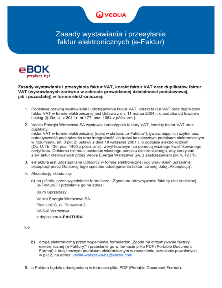 Zasady wystawiania i przesyłania faktur elektronicznych (e-Faktur) Zasady wystawiania i przesyłania faktur VAT, korekt faktur VAT oraz duplikatów faktur VAT (wystawianych zarówno w zakresie prowadzonej działalności podstawowej, jak i pozostałej) w formie elektronicznej: 1. Podstawą prawną wystawiania i udostępniania faktur VAT, korekt faktur VAT oraz duplikatów faktur VAT w formie elektronicznej jest Ustawa z dn. 11 marca 2004 r. o podatku od towarów i usług (tj. Dz. U. z 2011 r. nr 177, poz. 1054 z późn. zm.). 2. Veolia Energia Warszawa SA wystawia i udostępnia faktury VAT, korekty faktur VAT oraz duplikaty faktur VAT w formie elektronicznej (dalej w skrócie: „e-Faktura”), gwarantując ich czytelność, autentyczność pochodzenia oraz integralność ich treści bezpiecznym podpisem elektronicznym w rozumieniu art. 3 pkt 2) ustawy z dnia 18 września 2001 r. o podpisie elektronicznym (Dz. U. Nr 130, poz. 1450 z późn. zm.), weryfikowanym za pomocą ważnego kwalifikowanego certyfikatu. Odbiorca nie musi posiadać własnego podpisu elektronicznego, aby korzystać z e-Faktur oferowanych przez Veolię Energia Warszawa SA, z zastrzeżeniem pkt 4, 12 i 13. 3. e-Faktura jest udostępniana Odbiorcy w formie elektronicznej pod warunkiem uprzedniej akceptacji przez Odbiorcę tego sposobu udostępniania faktur, zwanej dalej „Akceptacją”. 4. Akceptację składa się: a) na piśmie, przez wypełnienie formularza: „Zgoda na otrzymywanie faktury elektronicznej (e-Faktury)” i przesłanie go na adres: Biuro Sprzedaży Veolia Energia Warszawa SA Plac Unii C, ul. Puławska 2 02-566 Warszawa z dopiskiem e-FAKTURA lub b) drogą elektroniczną przez wypełnienie formularza: „Zgoda na otrzymywanie faktury elektronicznej (e-Faktury)” i przesłanie go w formacie pliku PDF (Portable Document Format) z bezpiecznym podpisem elektronicznym w rozumieniu przepisów powołanych w pkt 2, na adres: [email protected] 5. e-Faktura będzie udostępniana w formacie pliku PDF (Portable Document Format). 6. Pierwsza e-Faktura zostanie wystawiona nie wcześniej, jak po upływie 14 dni od dnia otrzymania prawidłowo wypełnionej Akceptacji. 7. Akceptacja jest jednoznaczna z rezygnacją Odbiorcy z otrzymywania faktur w formie papierowej. 8. e-Faktura jest udostępniana za pośrednictwem serwisu https://ebok.energiadlawarszawy.pl po uprzednim zalogowaniu się w tym serwisie. Korzystanie z serwisu odbywa się na zasadach opisanych w Regulaminie elektronicznego Biura Obsługi Klienta. 9. Powiadomienie o wystawieniu i udostępnieniu e-Faktury wysyłane jest na adres e-mail Odbiorcy wskazany w Akceptacji, w terminie 3 dni roboczych od wystawienia e-Faktury. Powiadomienie zawiera link umożliwiający dostęp do danej faktury. 10. Za dzień doręczenia Odbiorcy e-Faktury uznawany będzie dzień wysłania do Odbiorcy powiadomienia o jej wystawieniu i udostępnieniu, zgodnie z pkt 9. 11. Odbiorca zobowiązuje się do utrzymywania aktywnego adresu e-mail, wskazanego w Akceptacji przez cały okres korzystania z usługi e-Faktury. 12. Odbiorca ma prawo dokonać zmiany adresu e-mail wskazanego w Akceptacji w formie oświadczenia złożonego we „Wniosku o zmianę adresu e-mail do przesyłania i udostępniania faktury elektronicznej (e-Faktury)”, które należy wysłać na adres wskazany w pkt 4 lit. a) z dopiskiem na kopercie: „Zmiana adresu e-mail” lub drogą elektroniczną na adres wskazany w pkt 4 lit. b). 13. Odbiorca jest uprawniony do cofnięcia Akceptacji. Cofnięcie Akceptacji następuje poprzez oświadczenia według wzoru „Cofnięcie zgody na otrzymywanie faktury elektronicznej (e-Faktury)” i wysłanie go na adres wskazany w pkt 4 lit. a) z dopiskiem na kopercie: „Cofnięcie zgody na e-Fakturę” lub drogą elektroniczną na adres wskazany w pkt 4 lit. b). 14. Cofnięcie Akceptacji jest skuteczne po upływie 14 dni od otrzymania przez Veolia Energia Warszawa SA oświadczenia o cofnięciu zgody na otrzymywanie e-Faktur. 15. e-Faktura, wystawiona począwszy od daty wskazanej w pkt 6, jest dostępna przez co najmniej 12 miesięcy, nie dłużej jednak niż przez okres korzystania przez Odbiorcę z serwisu https://ebok.energiadlawarszawy.pl 16. W przypadku zmiany przepisów prawa regulujących zasady wystawiania i przesyłania e-Faktury, Veolia Energia Warszawa SA odpowiednio dostosuje swoje procedury, o czym powiadomi Odbiorcę. 17. Wzory oświadczeń, o których mowa w pkt 3, 12 i 13 są dostępne na stronie internetowej https://ebok.energiadlawarszawy.pl