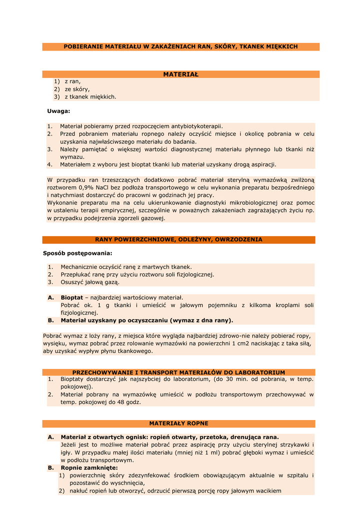 POBIERANIE MATERIAŁU W ZAKAŻENIACH RAN, SKÓRY, TKANEK MIĘKKICH 1) z ran, 2) ze skóry, 3) z tkanek miękkich. MATERIAŁ Uwaga: 1. 2. 3. 4. Materiał pobieramy przed rozpoczęciem antybiotykoterapii. Przed pobraniem materiału ropnego należy oczyścić miejsce i okolicę pobrania w celu uzyskania najwłaściwszego materiału do badania. Należy pamiętać o większej wartości diagnostycznej materiału płynnego lub tkanki niż wymazu. Materiałem z wyboru jest bioptat tkanki lub materiał uzyskany drogą aspiracji. W przypadku ran trzeszczących dodatkowo pobrać materiał sterylną wymazówką zwilżoną roztworem 0,9% NaCl bez podłoża transportowego w celu wykonania preparatu bezpośredniego i natychmiast dostarczyć do pracowni w godzinach jej pracy. Wykonanie preparatu ma na celu ukierunkowanie diagnostyki mikrobiologicznej oraz pomoc w ustaleniu terapii empirycznej, szczególnie w poważnych zakażeniach zagrażających życiu np. w przypadku podejrzenia zgorzeli gazowej. RANY POWIERZCHNIOWE, ODLEŻYNY, OWRZODZENIA Sposób postępowania: 1. 2. 3. Mechanicznie oczyścić ranę z martwych tkanek. Przepłukać ranę przy użyciu roztworu soli fizjologicznej. Osuszyć jałową gazą. A. Bioptat – najbardziej wartościowy materiał. Pobrać ok. 1 g tkanki i umieścić w jałowym pojemniku z kilkoma kroplami soli fizjologicznej. Materiał uzyskany po oczyszczaniu (wymaz z dna rany). B. Pobrać wymaz z loży rany, z miejsca które wygląda najbardziej zdrowo-nie należy pobierać ropy, wysięku, wymaz pobrać przez rolowanie wymazówki na powierzchni 1 cm2 naciskając z taka siłą, aby uzyskać wypływ płynu tkankowego. 1. 2. PRZECHOWYWANIE I TRANSPORT MATERIAŁÓW DO LABORATORIUM Bioptaty dostarczyć jak najszybciej do laboratorium, (do 30 min. od pobrania, w temp. pokojowej). Materiał pobrany na wymazówkę umieścić w podłożu transportowym przechowywać w temp. pokojowej do 48 godz. MATERIAŁY ROPNE A. Materiał z otwartych ognisk: ropień otwarty, przetoka, drenująca rana. Jeżeli jest to możliwe materiał pobrać przez aspirację przy użyciu sterylnej strzykawki i igły. W przypadku małej ilości materiału (mniej niż 1 ml) pobrać głęboki wymaz i umieścić w podłożu transportowym. B. Ropnie zamknięte: 1) powierzchnię skóry zdezynfekować środkiem obowiązującym aktualnie w szpitalu i pozostawić do wyschnięcia, 2) nakłuć ropień lub otworzyć, odrzucić pierwszą porcję ropy jałowym wacikiem drugą porcję zaaspirować do strzykawki (przy dużej ilości materiału), zabezpieczyć igłę osłonką i jak najszybciej (do 30 minut) przetransportować do laboratorium w temperaturze pokojowej. PRZECHOWYWANIE I TRANSPORT MATERIAŁÓW DO LABORATORIUM W sytuacji, gdy natychmiastowy transport materiału do Pracowni Bakteriologicznej nie jest możliwy: należy wstrzyknąć materiał do podłoży w butelkach, stosowanych do posiewów krwi – do butelki beztlenowej i tlenowej, po uprzedniej zmianie igły na nową i odkażeniu korków butelek. Przechowywać do 2 h w temp. pokojowej lub pobrać na wymazówkę (całkowicie nasączyć wymazówkę badanym materiałem) i umieść w podłożu transportowym. Przechowywać w temp. pokojowej do 48 godz. STOPA CUKRZYCOWA Na zleceniu, zaznaczyć czy jest to rana przewlekła, zakażenie nawracające, zakażenie świeże. Próbkę do badań zaleca się pobrać nawet przy pierwszym epizodzie i zmianie łagodnej, od pacjenta nie leczonego antybiotykami. Im dłużej trwa zmiana skórna tym większe znaczenie ma właściwe pobranie materiału do badania. Wymaz powierzchniowy ma małą wartość diagnostyczną ponieważ identyfikuje jedynie florę tlenową, identyfikuje drobnoustroje kolonizujące i zakażające ranę. Materiał do diagnostyki mikrobiologicznej należy pobrać po oczyszczeniu rany i usunięciu tkanek martwiczych. Bioptat tkanek głębokich - najbardziej wartościowy materiał 1. Powierzchnię rany oczyścić jałową solą fizjologiczną i pobrać tkankę (nie martwiczą). 2. Pobrany materiał umieścić w jałowym naczyniu i dostarczyć do pracowni w godzinach jej pracy do 30 min od pobrania. Materiał po łyżeczkowaniu tkanki głębokiej w trakcie oczyszczania (wymaz z dna rany)- wiarygodny materiał z zakażeń nie dochodzących do kości. Pobrany materiał umieścić w podłożu transportowym i jak najszybciej dostarczyć do pracowni. Jeśli nie będzie to możliwe przechowywać w temp. pokojowej do 48 godz. POBIERANIE MATERIAŁU W KIERUNKU ZGORZELI GAZOWEJ I PROMIENICY Zgorzel gazowa Materiałem do badania w przypadku podejrzenia zgorzeli gazowej powinien być BIOPTAT lub WYSIĘK. Wymaz pobierać tylko w przypadku, gdy nie ma innej możliwości. W celu wykonania preparatu bezpośredniego materiał należy pobrać na wymazówkę bez podłoża i dostarczyć jak najszybciej do pracowni bakteriologii. Promienica Najlepszym materiałem w diagnostyce promienicy jest ROPA lub BIOPTAT zawierający żółte ziarna promienicze przypominające ziarna siarki. Materiał pobrać do jałowego pojemnika, natychmiast dostarczyć do pracowni bakteriologii,transportować w temperaturze pokojowej
