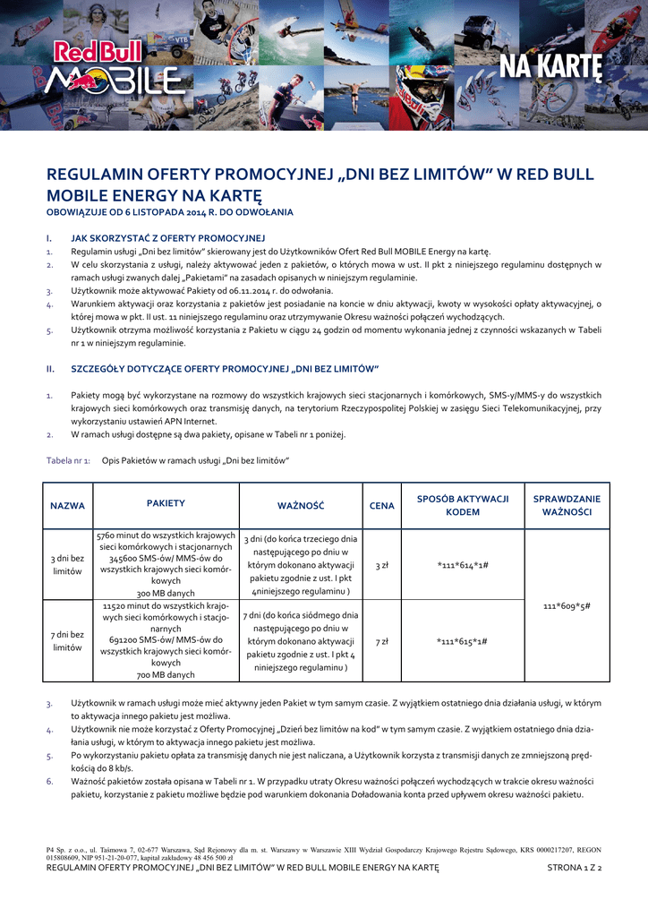 REGULAMIN OFERTY PROMOCYJNEJ „DNI BEZ LIMITÓW” W RED BULL MOBILE ENERGY NA KARTĘ OBOWIĄZUJE OD 6 LISTOPADA 2014 R. DO ODWOŁANIA I. JAK SKORZYSTAĆ Z OFERTY PROMOCYJNEJ 1. 2. Regulamin usługi „Dni bez limitów” skierowany jest do Użytkowników Ofert Red Bull MOBILE Energy na kartę. W celu skorzystania z usługi, należy aktywować jeden z pakietów, o których mowa w ust. II pkt 2 niniejszego regulaminu dostępnych w ramach usługi zwanych dalej „Pakietami” na zasadach opisanych w niniejszym regulaminie. Użytkownik może aktywować Pakiety od 06.11.2014 r. do odwołania. Warunkiem aktywacji oraz korzystania z pakietów jest posiadanie na koncie w dniu aktywacji, kwoty w wysokości opłaty aktywacyjnej, o której mowa w pkt. II ust. 11 niniejszego regulaminu oraz utrzymywanie Okresu ważności połączeń wychodzących. Użytkownik otrzyma możliwość korzystania z Pakietu w ciągu 24 godzin od momentu wykonania jednej z czynności wskazanych w Tabeli nr 1 w niniejszym regulaminie. 3. 4. 5. II. SZCZEGÓŁY DOTYCZĄCE OFERTY PROMOCYJNEJ „DNI BEZ LIMITÓW” 1. Pakiety mogą być wykorzystane na rozmowy do wszystkich krajowych sieci stacjonarnych i komórkowych, SMS-y/MMS-y do wszystkich krajowych sieci komórkowych oraz transmisję danych, na terytorium Rzeczypospolitej Polskiej w zasięgu Sieci Telekomunikacyjnej, przy wykorzystaniu ustawień APN Internet. W ramach usługi dostępne są dwa pakiety, opisane w Tabeli nr 1 poniżej. 2. Tabela nr 1: NAZWA 3 dni bez limitów 7 dni bez limitów 3. 4. 5. 6. Opis Pakietów w ramach usługi „Dni bez limitów” PAKIETY WAŻNOŚĆ 5760 minut do wszystkich krajowych 3 dni (do końca trzeciego dnia sieci komórkowych i stacjonarnych następującego po dniu w 345600 SMS-ów/ MMS-ów do którym dokonano aktywacji wszystkich krajowych sieci komórpakietu zgodnie z ust. I pkt kowych 4niniejszego regulaminu ) 300 MB danych 11520 minut do wszystkich krajowych sieci komórkowych i stacjo- 7 dni (do końca siódmego dnia następującego po dniu w narnych 691200 SMS-ów/ MMS-ów do którym dokonano aktywacji wszystkich krajowych sieci komórpakietu zgodnie z ust. I pkt 4 kowych niniejszego regulaminu ) 700 MB danych CENA SPOSÓB AKTYWACJI KODEM 3 zł *111*614*1# SPRAWDZANIE WAŻNOŚCI 111*609*5# 7 zł *111*615*1# Użytkownik w ramach usługi może mieć aktywny jeden Pakiet w tym samym czasie. Z wyjątkiem ostatniego dnia działania usługi, w którym to aktywacja innego pakietu jest możliwa. Użytkownik nie może korzystać z Oferty Promocyjnej „Dzień bez limitów na kod” w tym samym czasie. Z wyjątkiem ostatniego dnia działania usługi, w którym to aktywacja innego pakietu jest możliwa. Po wykorzystaniu pakietu opłata za transmisję danych nie jest naliczana, a Użytkownik korzysta z transmisji danych ze zmniejszoną prędkością do 8 kb/s. Ważność pakietów została opisana w Tabeli nr 1. W przypadku utraty Okresu ważności połączeń wychodzących w trakcie okresu ważności pakietu, korzystanie z pakietu możliwe będzie pod warunkiem dokonania Doładowania konta przed upływem okresu ważności pakietu. P4 Sp. z o.o., ul. Taśmowa 7, 02-677 Warszawa, Sąd Rejonowy dla m. st. Warszawy w Warszawie XIII Wydział Gospodarczy Krajowego Rejestru Sądowego, KRS 0000217207, REGON 015808609, NIP 951-21-20-077, kapitał zakładowy 48 456 500 zł REGULAMIN OFERTY PROMOCYJNEJ „DNI BEZ LIMITÓW” W RED BULL MOBILE ENERGY NA KARTĘ STRONA 1 Z 2 7. 8. 9. 10. 11. 12. 13. W przypadku aktywowania dowolnego z Pakietów, transmisja danych rozliczana jest w pierwszej kolejności z Pakietu, a po jego wyczerpaniu zgodnie z zasadami wymienionymi w ust. II pkt 5 niniejszego regulaminu. Korzystanie z Internetu w ramach pakietów odbywa się z prędkością do 15 Mb/s dla pobierania danych oraz do 5 Mb/s dla wysyłania danych. Rzeczywista prędkość przesyłania danych zależy od szeregu czynników takich jak m.in. obciążenie stacji bazowej, rodzaj technologii wspieranej przez telekomunikacyjne urządzenie końcowe, z którego korzysta Użytkownik, siła odbieranego sygnału, ukształtowanie terenu oraz warunki atmosferyczne. Operator informuje, że ze względów technologicznych może czasowo lub na stałe znieść ograniczenie prędkości transmisji. W takim przypadku maksymalną możliwą prędkość przesyłania danych wyznacza dostępna w danej lokalizacji technologia transmisji mobilnej wykorzystywana przez Operatora, przy czym rzeczywista prędkość przesyłania danych zależy od szeregu czynników, w tym wymienionych w pkt 9 powyżej. Każdorazowo, opłata za aktywację oraz korzystanie z pakietu jest pobierana z Pakietu Złotówek i jest uzależniona od aktywowanego pakietu zgodnie z Tabelą nr 1. Aby aktywować Pakiet danego typu należy wykonać jedną z następujących czynności, określonych w Tabeli nr 1. Skorzystanie z niniejszej usługi nie wyklucza korzystania z innych Ofert Promocyjnych dostępnych łącznie z Ofertą, z której korzysta Użytkownik, z wyjątkiem określonym w pkt 4, chyba że warunki innych Ofert Promocyjnych stanowią inaczej. III. POSTANOWIENIA KOŃCOWE 1. Operator zastrzega sobie prawo do zmiany lub odwołania niniejszego regulaminu w każdym czasie bez podawania przyczyny, z zastrzeżeniem, że zmiana lub odwołanie nie wpływa na prawa i obowiązki uprzednio nabyte przez Użytkownika, co oznacza, że Użytkownik może korzystać ze środków przyznanych przed zmiana lub odwołaniem, ale nie będzie miał możliwości aktywowania Pakietów na nowo. Informacja o zmianie lub odwołaniu usługi zostanie opublikowana na stronie internetowej www.play.pl lub w inny sposób podana do wiadomości publicznej. Wszelkie wyrazy lub wyrażenia pisane w treści niniejszego regulaminu dużą literą należy rozumieć zgodnie z ich definicją zawartą odpowiednio w Regulaminie świadczenia Usług Telekomunikacyjnych przez P4 sp. z o.o. dla Użytkowników lub Cenniku Oferty Red Bull MOBILE Energy na kartę. 