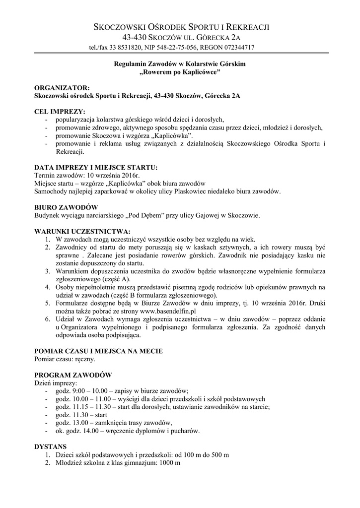 SKOCZOWSKI OŚRODEK SPORTU I REKREACJI 43-430 SKOCZÓW UL. GÓRECKA 2A tel./fax 33 8531820, NIP 548-22-75-056, REGON 072344717 Regulamin Zawodów w Kolarstwie Górskim „Rowerem po Kaplicówce” ORGANIZATOR: Skoczowski ośrodek Sportu i Rekreacji, 43-430 Skoczów, Górecka 2A CEL IMPREZY: - popularyzacja kolarstwa górskiego wśród dzieci i dorosłych, - promowanie zdrowego, aktywnego sposobu spędzania czasu przez dzieci, młodzież i dorosłych, - promowanie Skoczowa i wzgórza „Kaplicówka”. - promowanie i reklama usług związanych z działalnością Skoczowskiego Ośrodka Sportu i Rekreacji. DATA IMPREZY I MIEJSCE STARTU: Termin zawodów: 10 września 2016r. Miejsce startu – wzgórze „Kaplicówka” obok biura zawodów Samochody najlepiej zaparkować w okolicy ulicy Plaskowiec niedaleko biura zawodów. BIURO ZAWODÓW Budynek wyciągu narciarskiego „Pod Dębem” przy ulicy Gajowej w Skoczowie. WARUNKI UCZESTNICTWA: 1. W zawodach mogą uczestniczyć wszystkie osoby bez względu na wiek. 2. Zawodnicy od startu do mety poruszają się w kaskach sztywnych, a ich rowery muszą być sprawne . Zalecane jest posiadanie rowerów górskich. Zawodnik nie posiadający kasku nie zostanie dopuszczony do startu. 3. Warunkiem dopuszczenia uczestnika do zwodów będzie własnoręczne wypełnienie formularza zgłoszeniowego (część A). 4. Osoby niepełnoletnie muszą przedstawić pisemną zgodę rodziców lub opiekunów prawnych na udział w zawodach (część B formularza zgłoszeniowego). 5. Formularze dostępne będą w Biurze Zawodów w dniu imprezy, tj. 10 września 2016r. Druki można także pobrać ze strony www.basendelfin.pl 6. Udział w Zawodach wymaga zgłoszenia uczestnictwa – w dniu zawodów – poprzez oddanie u Organizatora wypełnionego i podpisanego formularza zgłoszenia. Za zgodność danych odpowiada osoba podpisująca. POMIAR CZASU I MIEJSCA NA MECIE Pomiar czasu: ręczny. PROGRAM ZAWODÓW Dzień imprezy: - godz. 9:00 – 10.00 – zapisy w biurze zawodów; - godz. 10.00 – 11.00 – wyścigi dla dzieci przedszkoli i szkół podstawowych - godz. 11.15 – 11.30 – start dla dorosłych; ustawianie zawodników na starcie; - godz. 11.30 – start - godz. 13.00 – zamknięcia trasy zawodów, - ok. godz. 14.00 – wręczenie dyplomów i pucharów. DYSTANS 1. Dzieci szkół podstawowych i przedszkoli: od 100 m do 500 m 2. Młodzież szkolna z klas gimnazjum: 1000 m SKOCZOWSKI OŚRODEK SPORTU I REKREACJI 43-430 SKOCZÓW UL. GÓRECKA 2A tel./fax 33 8531820, NIP 548-22-75-056, REGON 072344717 3. Trasa dla młodzieży i dorosłych: a. Około 7 km – jedna pętla b. Około 21 km – trzy pętle SZCZEGÓŁY PRZEBIEGU TRASY: 1. Zawody zostaną przeprowadzone na trasach przebiegających wokół Górki Wilamowickiej 388m npm. 2. Trasy zostaną oznakowane oraz zabezpieczone przez osoby porządkowe lub inne służby. 3. Na trasach zawodów mogą występować odcinki niebezpieczne, strome podjazdy i zjazdy. Trasy zawodów zostaną opublikowane na stronie internetowej www.basendelfin.pl przed planowanym terminem rozegrania imprezy. Organizator zastrzega sobie możliwość zmiany trasy. 4. Start dla wyścigu odbędzie się ze startu wspólnego. Organizator zastrzega sobie prawo do innego sposobu przeprowadzenia startu, o czym poinformuje uczestników na odprawie technicznej w dniu zawodów. O ustawieniu na starcie zdecyduje sędzia główny zawodów. 5. Zawodnicy podczas wyścigu zobowiązani są do przestrzegania niniejszego regulaminu oraz do zachowania podstawowych zasad kultury. ŚWIADCZENIA DLA UCZESTNIKÓW Wszyscy uczestnicy zawodów otrzymują: - posiłek regeneracyjny po imprezie (po zwrocie numeru startowego), - zabezpieczenie medyczne, - możliwość umycia roweru, - puchary dla zwycięzców oraz dyplomy dla II i III miejsca, KATEGORIE (osobno dziewczyny i chłopcy): - dzieci w wieku przedszkolnym – dystans 100 m - 1 i 2 klasa szkoły podstawowej – dystans 200 m - 3 i 4 klasa szkoły podstawowej – dystans 400 m - 5 i 6 klasa szkoły podstawowej – dystans 500 m - klasy gimnazjalne (13 – 17 lat) – dystans 1 km - młodzież ponadgimnazjalna (18 – 20 lat) – dystans 1 km Mężczyźni – dystans 6 km (jedno okrążenie) M0 1998-1996 (18-20 lat) Mężczyźni – dystans 18 km (trzy okrążenia) M1 1995-1986 (21-30 lat) M2 1986-1976 (31-40 lat) M3 1975-1966 (41-50 lat) M4 1965 i poniżej (+51 lat) Kobiety – dystans 6 km (jedno okrążenie) K0 1998-1996 (18-20 lat) K1 1995-1986 (21-30 lat) K2 1985 i poniżej (+30 lat) RUCH DROGOWY: - Zawody odbywać się będą przy nieograniczonym ruchu drogowym. W miejscach szczególnie niebezpiecznych służby OSP oraz Straż Miejska ułatwią włączanie się do ruchu. - Zawodnicy muszą zachować szczególną ostrożność mając na uwadze możliwość wyjechania pojazdów z pól, dróg leśnych czy pojedynczych zabudowań. SKOCZOWSKI OŚRODEK SPORTU I REKREACJI 43-430 SKOCZÓW UL. GÓRECKA 2A tel./fax 33 8531820, NIP 548-22-75-056, REGON 072344717 - Wszyscy zawodnicy na drogach gruntowych i publicznych powinni poruszać się prawą stroną jezdni i bezwzględnie przestrzegać przepisów Ruchu Drogowego. Organizator nie ponosi odpowiedzialności za ewentualne kolizje i wypadki na trasie. INFORMACJE KOŃCOWE - Każdy pełnoletni uczestnik zawodów bierze udział w zawodach na własną odpowiedzialność i ponosi odpowiedzialność prawną za wszystkie szkody wyrządzone przez siebie. - Za niepełnoletnich uczestników zawodów oraz za wszystkie szkody przez nich wyrządzone odpowiadają rodzice lub prawni opiekunowie. - Uczestnik przyjmuje do wiadomości, że należy przestrzegać zarządzeń służb porządkowych oraz warunków regulaminu. Brak znajomości regulaminu nie zwalnia z odpowiedzialności. - Poprzez wypełnienie formularza zgłoszenia, uczestnik akceptuje niniejszy regulamin, a w szczególności warunki uczestnictwa w zawodach i zgłasza swoje uczestnictwo w w/w zawodach. W przypadku startu młodzieży poniże
