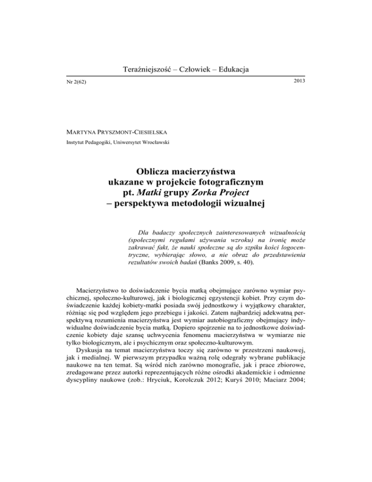 Teraźniejszość – Człowiek – Edukacja 2013 Nr 2(62) MARTYNA PRYSZMONT-CIESIELSKA Instytut Pedagogiki, Uniwersytet Wrocławski Oblicza macierzyństwa ukazane w projekcie fotograficznym pt. Matki grupy Zorka Project – perspektywa metodologii wizualnej Dla badaczy społecznych zainteresowanych wizualnością (społecznymi regułami używania wzroku) na ironię może zakrawać fakt, że nauki społeczne są do szpiku kości logocentryczne, wybierając słowo, a nie obraz do przedstawienia rezultatów swoich badań (Banks 2009, s. 40). Macierzyństwo to doświadczenie bycia matką obejmujące zarówno wymiar psychicznej, społeczno-kulturowej, jak i biologicznej egzystencji kobiet. Przy czym doświadczenie każdej kobiety-matki posiada swój jednostkowy i wyjątkowy charakter, różniąc się pod względem jego przebiegu i jakości. Zatem najbardziej adekwatną perspektywą rozumienia macierzyństwa jest wymiar autobiograficzny obejmujący indywidualne doświadczenie bycia matką. Dopiero spojrzenie na to jednostkowe doświadczenie kobiety daje szansę uchwycenia fenomenu macierzyństwa w wymiarze nie tylko biologicznym, ale i psychicznym oraz społeczno-kulturowym. Dyskusja na temat macierzyństwa toczy się zarówno w przestrzeni naukowej, jak i medialnej. W pierwszym przypadku ważną rolę odegrały wybrane publikacje naukowe na ten temat. Są wśród nich zarówno monografie, jak i prace zbiorowe, zredagowane przez autorki reprezentujących różne ośrodki akademickie i odmienne dyscypliny naukowe (zob.: Hryciuk, Korolczuk 2012; Kuryś 2010; Maciarz 2004; 94 Martyna PRYSZMONT-CIESIELSKA Bartosz 2002; Budrowska 2000). Dyskurs akademicki przeniósł się także do mediów. Dyskusje toczą się w wybranych audycjach radiowych, m.in. Polskim Radio Trójka lub Radiu TOK FM oraz na łamach prasy i stron internetowych (m.in. Krytyka Polityczna, Feminoteka, Wysokie Obcasy). Niektóre z zamieszczonych głosów są odpowiedzią na wystąpienie prof. Z. Mikołejki (2012), który publicznie skrytykował wybraną grupę matek nazwaną przez siebie „wózkowymi”, zarzucając im m.in. zakłócanie spokoju i porządku publicznego. Wypowiedź ta, a także wiele innych komentarzy będących reakcją na wystąpienie profesora, przyjęła dość agresywny ton. Ich autorzy dzielą się przede wszystkim niezadowoleniem z jakości życia w Polsce. Tym, co różni od siebie owe głosy, są odmienne ideologie, z których pozycji wypowiadają się poszczególni autorzy. To właśnie one wydają się decydować o tym, jaką „wizję” macierzyństwa przedstawiają w przestrzeni publicznej, a także jaką przypisują mu rolę. Istotne jest pytanie, czy wypowiadający się bazują na jakichś (i jakich?) jednostkowych doświadczeniach kobiet-matek? Czy może są oni zdeterminowani określoną ideologią, która daje im schemat myślenia o macierzyństwie widzianym w separacji od realnych doświadczeń kobiet w Polsce? Przyglądając się sporom na temat macierzyństwa, odnoszę wrażenie, że ich autorzy walczą przede wszystkim o to, aby nadać temu doświadczeniu jakiś kształt i tym samym zamknąć w określonym schemacie. W tej perspektywie rozumiane jest ono jako instytucja służąca wypełnianiu pewnych celów społecznych, edukacyjnych, politycznych oraz ekonomicznych itd. Ich realizacja odbywa się dzięki przemocy symbolicznej i umożliwia reprodukcją określonego kapitału kulturowego (zob.: Bourdieu, Passeron 2006). Macierzyństwo przestaje być wówczas jednym z okresów życia kobiety, która sama, także w następstwie swojej jednostkowej biografii życiowej, nadaje mu odpowiednią jakość. W tym sensie traci ona autonomię stanowienia o tym doświadczeniu, a przez to także o sobie jako kobiecie i matce. Zainspirowana ogólnym ożywieniem dyskusji na temat macierzyństwa, postanowiłam przyjrzeć się obecnemu w przestrzeni publicznej projektowi fotograficznemu Matki grupy Zorka Project. Fotograficzne prezentacje w roli przedmiotu badań Przedmiotem swojej analizy uczyniłam obraz macierzyństwa zawarty w wybranych fotografiach grupy Zorka Project. Cele badań koncentrowały się na aspektach poznawczych – poznanie obrazów macierzyństwa oraz społecznych – uwrażliwienie na obecność różnorodnych mikroświatów kobiet, a w konsekwencji odmiennego doświadczania macierzyństwa. Oblicza macierzyństwa ukazane w projekcie fotograficznym pt. Matki grupy Zorka Project... 95 Sformułowanym celom przyporządkowałam następujące problemy badawcze: 1) Jaki obraz macierzyństwa przedstawiają wybrane fotografie grupy Zorka Project? Szczególnie interesowały mnie następujące elementy tego obrazu: wizerunek zewnętrzny kobiety-matki, kobieta-matka w relacji z dzieckiem (dziećmi), cechy i role kobiety-matki, problemy macierzyństwa; 2) Jaki ukryty program macierzyństwa przekazują wybrane fotografie? Materiał badawczy stanowiły wybrane fotografie grupy Zorka Project z projektu 1 Matki. Składa się on z około 24 zdjęć , które można pogrupować w następujący sposób: kobiety-matki w ciąży, matki dzieci w wieku żłobkowym, przedszkolnym i szkolnym, 2 matki nastolatek oraz matki dorosłych kobiet . W niniejszym tekście przedstawię analizę dwóch grup fotografii, tj. ukazujących kobiety-matki w ciąży oraz matki dzieci z wieku żłobkowym, przedszkolnym i szkolnym. Autorkami fotografii są Monika Bereżecka (fotografia) i Monika Redzisz (fotografia i teksty), tworzące grupę fotograficzną Zorka Project, która istnieje od 2000 r. Autorki zajmują się dokumentem i publikowały na łamach Gazety Wyborczej, Rzeczpospolitej, Życia Warszawy, Polityki, Przekroju i w czasopismach fotograficznych. Dotychczas zaprezentowały na wystawach indywidualnych i zbiorowych następujące projekty: Laski, Drag Queen, Ciało, Matki, Mocarze, Przeciętni, Przeciętni Rosjanie, Przeciętni Czesi, Zaolzie, Przytulanie, Śródborów, Identyczni, Bokserki, Piękny Umysł (www.zorkaprojec