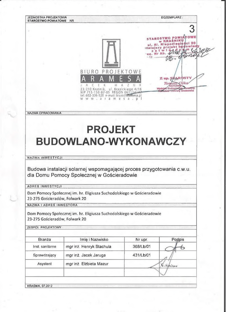 Oświadczam, że opracow any przeze mnie projekt branży sanitarnej w chodzący w skład projektu