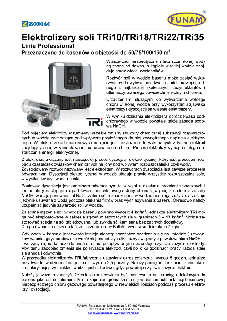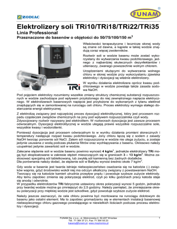 Elektrolizery soli TRi10/TRi18/TRi22/TRi35 Linia Professional Przeznaczone do basenów o objętości do 50/75/100/150 m3 Właściwości terapeutyczne i lecznicze słonej wody są znane od dawna, a kąpiele w takiej wodzie znajdują coraz więcej zwolenników. Roztwór soli w wodzie basenu może zostać wykorzystany do wytwarzania kwasu podchlorawego, jednego z najbardziej skutecznych dezynfektantów i utleniaczy, zwanego powszechnie wolnym chlorem. Urządzeniami służącymi do wytwarzania wolnego chloru w słonej wodzie przy wykorzystaniu zjawiska elektrolizy i dysocjacji są właśnie elektrolizery. W wyniku działania elektrolizera oprócz kwasu podchlorawego w wodzie powstaje także zasada sodowa NaOH. Pod pojęciem elektrolizy rozumiemy wszelkie zmiany struktury chemicznej substancji rozpuszczonych w wodzie zachodzące pod wpływem przyłożonego do niej zewnętrznego napięcia elektrycznego. W elektrolizerach basenowych napięcie jest przyłożone do wykonanych z tytanu elektrod znajdujących się w zamontowanej na rurociągu celi chloru. Proces elektrolizy wymaga stałego dostarczania energii elektrycznej. Z elektrolizą związany jest najczęściej proces dysocjacji elektrolitycznej, który jest procesem rozpadu cząsteczek związków chemicznych na jony pod wpływem rozpuszczalnika czyli wody. Zdysocjowany roztwór nazywany jest elektrolitem. W roztworach dysocjacja jest zawsze procesem odwracalnym. Dysocjacji elektrolitycznej w wodzie ulegają prawie wszystkie rozpuszczalne sole, wszystkie kwasy i wodorotlenki. Ponieważ dysocjacja jest procesem odwracalnym to w wyniku działania promieni słonecznych i temperatury następuje rozpad kwasu podchlorawego. Jony chloru łączą się z sodem z zasady NaOH tworząc ponownie sól NaCl. Zatem sól rozpuszczona w wodzie nie ulega zużyciu, a zostaje jedynie usuwana z wodą podczas płukania filtrów oraz wychlapywania z basenu. Okresowo należy uzupełniać jedynie zawartość soli w wodzie. Zalecane stężenie soli w wodzie basenu powinno wynosić 4 kg/m3, jednakże elektrolizery TRi mogą być eksploatowane w zakresie stężeń mieszczących się w granicach 3 – 13 kg/m3. Można zastosować specjalną sól tabletkowaną, lub zwykłą sól kamienną bez żadnych dodatków. Dla porównania należy dodać, że stężenie soli w Bałtyku wynosi średnio około 7 kg/m3. Gdy woda w basenie jest twarda istnieje niebezpieczeństwo osadzania się na katodzie (-) związków wapnia, gdyż środowisko wokół niej ma odczyn alkaliczny związany z powstawaniem NaOH. Tworzący się na katodzie kamień utrudnia przepływ prądu i powoduje szybsze zużycie elektrody. Aby temu zapobiec zmienia się polaryzację elektrod, czyli po kilku godzinach pracy katoda staje się anodą i odwrotnie. W przypadku elektrolizerów TRi fabrycznie ustawiony okres polaryzacji wynosi 5 godzin, jednakże przy twardej wodzie można go zmniejszyć do 2,5 godziny. Należy pamiętać, że zmniejszanie okresu polaryzacji przy miękkiej wodzie jest szkodliwe, gdyż powoduje szybsze zużycie elektrod. Należy jeszcze zaznaczyć, że cela chloru powinna być montowana na rurociągu dolotowym do basenu jako ostatni element. Ma to zapobiec gromadzeniu się w elementach instalacji basenowej niebezpiecznego chloru gazowego powstającego w niewielkich ilościach podczas procesu elektrolizy i dysocjacji. FUNAM Sp. z o.o., ul. Mokronoska 2, 52-407 Wrocław Tel.: 71 364 37 21, Fax: 71 364 55 23 [email protected], www.maytronics.pl 1 Produkowane są cztery wersje elektrolizerów: TRi 10 wytwarzający 10 g/h wolnego chloru, przeznaczony do basenów o objętości do 50 m3, TRi 18 wytwarzający 18 g/h wolnego chloru, przeznaczony do basenów o objętości do 75 m3, TRi 22 wytwarzający 22 g/h wolnego chloru, przeznaczony do basenów o objętości do 100 m3, TRi 35 wytwarzający 35 g/h wolnego chloru, przeznaczony do basenów o objętości do 150 m3. Każdy z powyższych elektrolizerów może zostać wyposażony od początku lub w trakcie eksploatacji basenu w jeden z opcjonalnych modułów: moduł TRi pH do pomiaru i regulacji wartości pH wody – po zamontowaniu tego modułu w miejscu dolnej ciemnoszarej obudowy uzyskujemy automatyczny pomiar i utrzymywanie odczynu pH wody w basenie na zadanym poziomie, moduł TRi Pro do pomiaru i regulacji wartości pH i potencjału redoks – po zamontowaniu tego modułu w miejscu dolnej ciemnoszarej obudowy uzyskujemy automatyczny pomiar i utrzymywanie odczynu pH wody i potencjału redoks na zadanych poziomach. Bliższe szczegóły dotyczące obu powyższych modułów można znaleźć w odrębnych kartach katalogowych. Sterownik elektrolizera posiada proste w obsłudze menu dostępne w kilku językach, jednakże wyświetlane proste komunikaty są zrozumiałe także dla osób nie znających języków obcych. Sterownik ma wbudowany zegar z programatorem, który umożliwia ustawienie dwóch okresów czasu pracy elektrolizera w ciągu doby, jednakże czasy te muszą uwzględniać ustawione wcześniej na sterowniku pompy obiegowej okresy czasu jej pracy (filtracji). Ponadto ze względów bezpieczeństwa programator wyłącza automatycznie elektrolizer po 30 godzinach nieprzerwanej pracy, co ma zapobiec zbyt dużej zawartości wolnego chloru w basenie w przypadku nieumiejętnej obsługi. Wydajność wytwarzania wolnego chloru jest regulowana za pomocą przycisków w zależności od zapotrzebowania i wskazywana na wyświetlaczu w skokach co 10%. Wymaga to ręcznego zbadania za pomocą testera zawartości wolnego chloru w wodzie. Ręczne pomiary zawartości wolnego chloru, jak i odczynu pH wody powinny być wykonywane regularnie co tydzień. Elektrolizer posiada ponadto dwa niezależne tryby regulacji wydajności: tryb Low stosowany przy niskim zapotrzebowaniu na wolny chlor (mało używane baseny wewnętrzne, baseny z przykryciem itp.) w którym wydajność wytwarzania chloru jest ograniczona do 10%, tryb Boost stosowany przy dużym zapotrzebowaniu na wolny