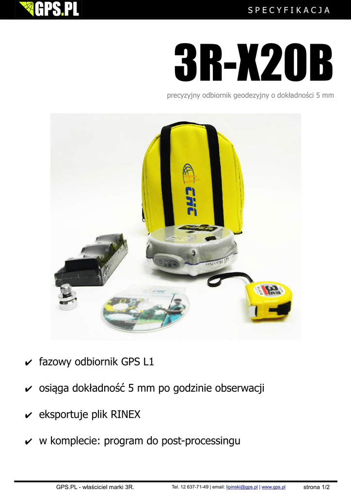 SPECYFIKACJA 3R-X20B precyzyjny odbiornik geodezyjny o dokładności 5 mm ✔ fazowy odbiornik GPS L1 ✔ osiąga dokładność 5 mm po godzinie obserwacji ✔ eksportuje plik RINEX ✔ w komplecie: program do post-processingu GPS.PL - właściciel marki 3R. Tel. 12 637-71-49 | email: [email protected] | www.gps.pl strona 1/2 Zintegrowany odbiornik geodezyjny CHC X20 przeznaczony jest do zagęszczania osnów geodezyjnych i wszelkich prac pomiarowych wymagających prostego pomiaru Static lub FastStatic o dokładności 1 centymetra. dane techniczne parametry odbiornika • • • • 12-kanałowy, zintegrowany odbiornik GPS L1 Dokładność Tryby: Static, FastStatic, Stop&Go, Kinematic poziomo: +/- 5 mm + 1 ppm (<10 km) pionowo: +/- 10 mm + 1 ppm (< 10 km) Tryby: Kinematic, Stop&Go poziomo: +/- 10 cm + 1 ppm pionowo: +/- 20 cm + 1 ppm Częstotliwość pozycjonowania: 1 Hz parametry zasilania • • • • Bateria litowa 7,2 V/ 2 AH Pobierana moc: 0,8 W Czas pracy na baterii: 16 godzin Czas ładowania: 3 godziny odporność • • • całkowicie szczelny odporny na uderzenia i wstrtząsy temp. pracy: -30 do + 65 st. C komunikacja • • • • Interfejsy: NMEA i RTCM-104 Lemo zawiera RS-232 i USB Bluetooth (opcja) port zasilania kompletacja • • Odbiornik X20 Receiver with Bluetooth pokrowiec, taśma do pomiaru wysokości ant Zasilacz 230 V z kablem kabel do komunikacji z PC bateria litowa z ładowarką konektor/adapter • • • • • • • • • GPS.PL - właściciel marki 3R. Tel. 12 637-71-49 | email: [email protected] | www.gps.pl strona 2/2