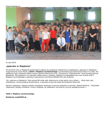 http://mojekgw.pl 21 paź 2015 „Jajeczko w Majdanie” 25.04.2015 roku w Majdanie Surhowskim odbyło się spotkanie wielkanocno-majówkowe „Jajeczko w Majdanie” organizowane przez Panie z KGW z Majdanu Surhowskiego z przewodniczącą Katarzyną Tokarz na czele. Na spotkaniu były członkinie KGW z terenu gminy Kraśniczyn oraz „Czarownice”z Raciborowic i Kurmanowa (gmina Białopole). Na spotkaniu nie zabrakło władz gminy, powiatu, lokalnych przedsiębiorców oraz druhów OSP z Majdanu Surhowskiego a gościem specjalnym był Prezes RZKiOR Pan Jan Rudnicki. Na „Jajeczku w Majdanie” było ponad 80 osób więc dziewczyny miały pełne ręce roboty…. Stoły były syto zastawione, remiza pięknie przystrojona, a oprawą muzyczna zajął się Arkadiusz Klimczuk. Oprócz integracji i zabawy została nawiązana dyskusja na temat zakupów na portalu „Rabat Rolniczy”. Wszystkie niejasności zostały rozwiane i mamy nadzieję, że niebawem zaczniemy czynnie współpracować:-) KGW z Majdanu Surhowskiego Redakcja mojeKGW.pl ..