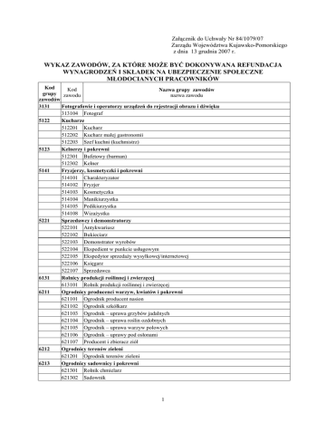 Załącznik do Uchwały Nr 84/1079/07 Zarządu Województwa Kujawsko-Pomorskiego z dnia 13 grudnia 2007 r. WYKAZ ZAWODÓW, ZA KTÓRE MOŻE BYĆ DOKONYWANA REFUNDACJA WYNAGRODZEŃ I SKŁADEK NA UBEZPIECZENIE SPOŁECZNE MŁODOCIANYCH PRACOWNIKÓW Kod Kod Nazwa grupy zawodów grupy zawodu nazwa zawodu zawodów 3131 Fotografowie i operatorzy urządzeń do rejestracji obrazu i dźwięku 313104 Fotograf 5122 Kucharze 512201 Kucharz 512202 Kucharz małej gastronomii 512203 Szef kuchni (kuchmistrz) 5123 Kelnerzy i pokrewni 512301 Bufetowy (barman) 512302 Kelner 5141 Fryzjerzy, kosmetyczki i pokrewni 514101 Charakteryzator 514102 Fryzjer 514103 Kosmetyczka 514104 Manikiurzystka 514105 Pedikiurzystka 514108 Wizażystka 5221 Sprzedawcy i demonstratorzy 522101 Antykwariusz 522102 Bukieciarz 522103 Demonstrator wyrobów 522104 Ekspedient w punkcie usługowym 522105 Ekspedytor sprzedaży wysyłkowej/internetowej 522106 Księgarz 522107 Sprzedawca 6131 Rolnicy produkcji roślinnej i zwierzęcej 613101 Rolnik produkcji roślinnej i zwierzęcej 6211 Ogrodnicy producenci warzyw, kwiatów i pokrewni 621101 Ogrodnik producent nasion 621102 Ogrodnik szkółkarz 621103 Ogrodnik – uprawa grzybów jadalnych 621104 Ogrodnik – uprawa roślin ozdobnych 621105 Ogrodnik – uprawa warzyw polowych 621106 Ogrodnik – uprawy pod osłonami 621107 Producent i zbieracz ziół 6212 Ogrodnicy terenów zieleni 621201 Ogrodnik terenów zieleni 6213 Ogrodnicy sadownicy i pokrewni 621301 Rolnik chmielarz 621302 Sadownik 1 7113 7121 7122 7123 7124 7129 7131 7132 7133 7134 7135 7136 7139 Robotnicy obróbki kamienia 711301 Kamieniarz Murarze i pokrewni 712102 Murarz 712103 Zdun Betoniarze 712201 Betoniarz 712202 Betoniarz zbrojarz Cieśle, stolarze budowlani i pokrewni 712301 Cieśla 712302 Stolarz budowlany Robotnicy budowy dróg i pokrewni 712401 Brukarz Robotnicy budowlani robót stanu surowego i pokrewni gdzie indziej niesklasyfikowani 712901 Konserwator budynków 712902 Montażysta dekoracji 712903 Monter konstrukcji budowlanych 712904 Monter rusztowań 712905 Renowator zabytków architektury Dekarze 713101 Dekarz Posadzkarze i pokrewni 713201 Glazurnik 713202 Parkieciarz 713203 Posadzkarz Tynkarze i pokrewni 713301 Sztukator 713302 Tynkarz Monterzy izolacji 713401 Monter izolacji budowlanych Szklarze i pokrewni 713501 Monter/składacz okien 713502 Monter żaluzji 713503 Szklarz budowlany 713504 Szklarz pojazdów 713505 Witrażownik Monterzy instalacji i urządzeń sanitarnych 713601 Monter instalacji centralnego ogrzewania i ciepłej wody 713602 Monter instalacji gazowych 713603 Monter instalacji wentylacyjnych i klimatyzacyjnych 713604 Monter instalacji wodociągowych i kanalizacyjnych 713605 Studniarz 713690 Pozostali monterzy instalacji i urządzeń sanitarnych Robotnicy budowlani robót wykończeniowych i pokrewni gdzie indziej niesklasyfikowani 713901 Technolog robót wykończeniowych w budownictwie 2 7141 7142 7143 7212 7213 7221 7222 7223 7224 7231 Malarze budowlani i pokrewni 714101 Malarz budowlany 714102 Malarz konstrukcji i wyrobów metalowych 714103 Malarz – tapeciarz Lakiernicy 714201 Lakiernik samochodowy 714202 Lakiernik wyrobów drzewnych 714204 Malarz lakiernik wyrobów metalowych 714290 Pozostali lakiernicy Robotnicy czyszczący konstrukcje budowlane i pokrewni 714302 Czyściciel elewacji budowlanych 714303 Kominiarz 714304 Robotnik osuszania i odgrzybiania budowli Spawacze i pokrewni 721290 Pozostali spawacze i pokrewni Blacharze 721303 Blacharz samochodowy 721390 Pozostali blacharze Kowale, hartownicy i pokrewni 722101 Hartownik 722102 Kowal 722103 Kowal wyrobów zdobniczych Ślusarze i pokrewni 722201 Eguterzysta 722202 Płatnerz 722203 Rusznikarz 722204 Ślusarz 722205 Ślusarz galanterii metalowej 722206 Ślusarz narzędziowy 722207 Traser Ustawiacze-operatorzy obrabiarek skrawających do metali 722301 Frezer 722302 Strugacz 722303 Szlifierz metali 722304 Tokarz 722305 Ustawiacz maszyn do obróbki skrawaniem 722306 Wiertacz w metalu Szlifierze narzędzi i polerowacze metali 722401 Docieracz polerowacz 722402 Szlifierz ostrzarz Mechanicy pojazdów samochodowych 723101 Mechanik autobusów 723102 Mechanik ciągników 723103 Mechanik pojazdów jednośladowych 723104 Mechanik samochodów ciężarowych 723105 Mechanik samochodów osobowych 723190 Pozostali mechanicy pojazdów samochodowych 3 7233 7241 7242 7243 7251 7311 Mechanicy – monterzy maszyn i urządzeń 723301 Mechanik maszyn i urządzeń budowlanych i melioracyjnych 723302 Mechanik maszyn i urządzeń do obróbki metali 723304 Mechanik maszyn i urządzeń przemysłowych 723306 Mechanik – operator pojazdów i maszyn rolniczych 723307 Mechanik silników spalinowych 723308 Mechanik urządzeń dźwignicowych (konserwator) 723309 Mechanik urządzeń klimatyzacyjnych 723310 Monter instalator urządzeń technicznych w budownictwie wiejskim Elektromechanicy 724101 Elektromechanik elektrycznych przyrządów pomiarowych 724102 Elektromechanik pojazdów samochodowych 724103 Elektromechanik sprzętu gospodarstwa domowego 724104 Elektromechanik urządzeń chłodniczych 724105 Elektromechanik urządzeń sterowania ruchem kolejowym Elektromonterzy 724201 Elektromonter (elektryk) zakładowy 724202 Elektromonter lotniczy 724203 Elektromonter maszyn elektrycznych 724207 Elektromonter prefabrykowanych stacji transformatorowych 724208 Elektromonter rozdzielni i podstacji trakcyjnych 724209 Elektromonter taboru szynowego 724210 Elektromonter telekomunikacyjnych urządzeń zasilających 724211 Elektromonter transformatorów 724212 Elektromonter układów pomiarowych i automatyki zabezpieczeniowej 724213 Elektromonter urządzeń dźwignicowych (konserwator) 724214 Elektromonter urządzeń sygnalizacyjnych Elektrycy budowlani i pokrewni 724301 Elektromonter instalacji elektrycznych Monterzy elektronicy 725101 Monter elektronik – aparatura medyczna 725102 Monter elektronik – aparatura pomiarowa 725103 Monter elektronik – elektroniczne instrumenty muzyczne 7
