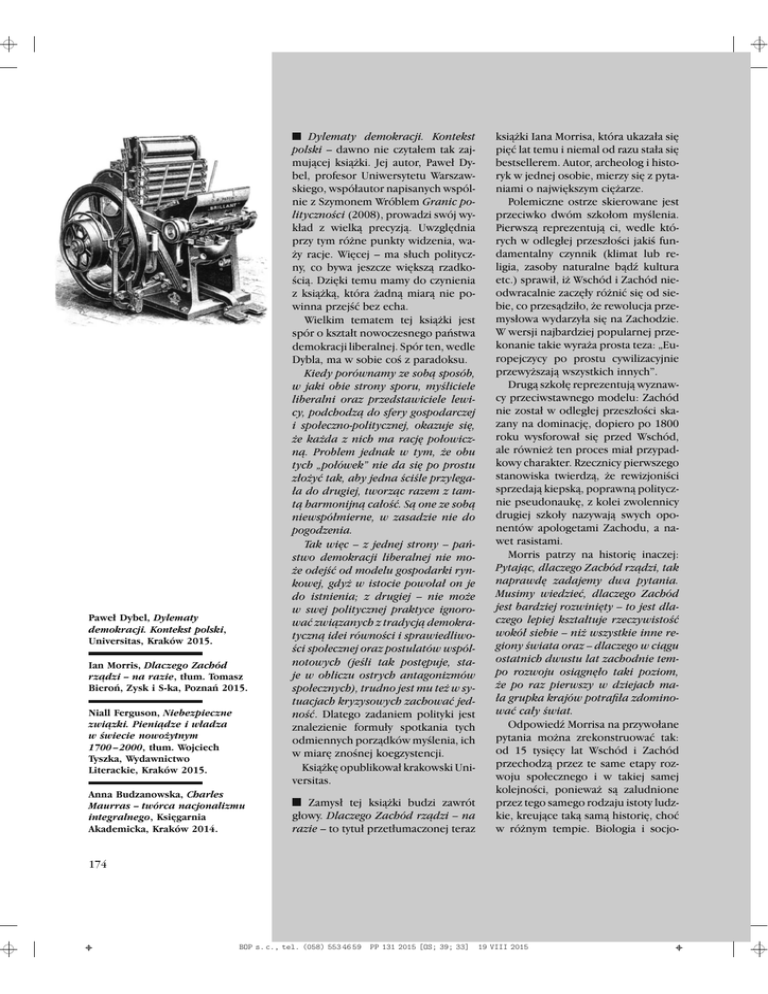 Paweł Dybel, Dylematy demokracji. Kontekst polski, Universitas, Kraków 2015. Ian Morris, Dlaczego Zachód rządzi – na razie, tłum. Tomasz Bieroń, Zysk i S-ka, Poznań 2015. Niall Ferguson, Niebezpieczne związki. Pieniądze i władza w świecie nowożytnym 1700 – 2000, tłum. Wojciech Tyszka, Wydawnictwo Literackie, Kraków 2015. Anna Budzanowska, Charles Maurras – twórca nacjonalizmu integralnego, Księgarnia Akademicka, Kraków 2014. Dylematy demokracji. Kontekst polski – dawno nie czytałem tak zajmującej książki. Jej autor, Paweł Dybel, profesor Uniwersytetu Warszawskiego, współautor napisanych wspólnie z Szymonem Wróblem Granic polityczności (2008), prowadzi swój wykład z wielką precyzją. Uwzględnia przy tym różne punkty widzenia, waży racje. Więcej – ma słuch polityczny, co bywa jeszcze większą rzadkością. Dzięki temu mamy do czynienia z książką, która żadną miarą nie powinna przejść bez echa. Wielkim tematem tej książki jest spór o kształt nowoczesnego państwa demokracji liberalnej. Spór ten, wedle Dybla, ma w sobie coś z paradoksu. Kiedy porównamy ze sobą sposób, w jaki obie strony sporu, myśliciele liberalni oraz przedstawiciele lewicy, podchodzą do sfery gospodarczej i społeczno-politycznej, okazuje się, że każda z nich ma rację połowiczną. Problem jednak w tym, że obu tych „połówek” nie da się po prostu złożyć tak, aby jedna ściśle przylegała do drugiej, tworząc razem z tamtą harmonijną całość. Są one ze sobą niewspółmierne, w zasadzie nie do pogodzenia. Tak więc – z jednej strony – państwo demokracji liberalnej nie może odejść od modelu gospodarki rynkowej, gdyż w istocie powołał on je do istnienia; z drugiej – nie może w swej politycznej praktyce ignorować związanych z tradycją demokratyczną idei równości i sprawiedliwości społecznej oraz postulatów wspólnotowych (jeśli tak postępuje, staje w obliczu ostrych antagonizmów społecznych), trudno jest mu też w sytuacjach kryzysowych zachować jedność. Dlatego zadaniem polityki jest znalezienie formuły spotkania tych odmiennych porządków myślenia, ich w miarę znośnej koegzystencji. Książkę opublikował krakowski Universitas. Zamysł tej książki budzi zawrót głowy. Dlaczego Zachód rządzi – na razie – to tytuł przetłumaczonej teraz książki Iana Morrisa, która ukazała się pięć lat temu i niemal od razu stała się bestsellerem. Autor, archeolog i historyk w jednej osobie, mierzy się z pytaniami o największym ciężarze. Polemiczne ostrze skierowane jest przeciwko dwóm szkołom myślenia. Pierwszą reprezentują ci, wedle których w odległej przeszłości jakiś fundamentalny czynnik (klimat lub religia, zasoby naturalne bądź kultura etc.) sprawił, iż Wschód i Zachód nieodwracalnie zaczęły różnić się od siebie, co przesądziło, że rewolucja przemysłowa wydarzyła się na Zachodzie. W wersji najbardziej popularnej przekonanie takie wyraża prosta teza: „Europejczycy po prostu cywilizacyjnie przewyższają wszystkich innych”. Drugą szkołę reprezentują wyznawcy przeciwstawnego modelu: Zachód nie został w odległej przeszłości skazany na dominację, dopiero po 1800 roku wysforował się przed Wschód, ale również ten proces miał przypadkowy charakter. Rzecznicy pierwszego stanowiska twierdzą, że rewizjoniści sprzedają kiepską, poprawną politycznie pseudonaukę, z kolei zwolennicy drugiej szkoły nazywają swych oponentów apologetami Zachodu, a nawet rasistami. Morris patrzy na historię inaczej: Pytając, dlaczego Zachód rządzi, tak naprawdę zadajemy dwa pytania. Musimy wiedzieć, dlaczego Zachód jest bardziej rozwinięty – to jest dlaczego lepiej kształtuje rzeczywistość wokół siebie – niż wszystkie inne regiony świata oraz – dlaczego w ciągu ostatnich dwustu lat zachodnie tempo rozwoju osiągnęło taki poziom, że po raz pierwszy w dziejach mała grupka krajów potrafiła zdominować cały świat. Odpowiedź Morrisa na przywołane pytania można zrekonstruować tak: od 15 tysięcy lat Wschód i Zachód przechodzą przez te same etapy rozwoju społecznego i w takiej samej kolejności, ponieważ są zaludnione przez tego samego rodzaju istoty ludzkie, kreujące taką samą historię, choć w różnym tempie. Biologia i socjo- 174 BOP s. c., tel. (058) 553 46 59 PP 131 2015 [OS; 39; 33] 19 VIII 2015