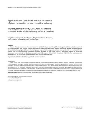 PROGRESS IN PLANT PROTECTION/POSTĘPY W OCHRONIE ROŚLIN 52 (1) 2012 Applicability of QuEChERS method in analysis of plant protection products residue in honey Wykorzystanie metody QuEChERS w analizie pozostałości środków ochrony roślin w miodzie Magdalena Grzegorzak, Ewa Szpyrka, Magdalena Słowik‐Borowiec, Anna Kurdziel, Aneta Matyaszek, Julian Rupar Summary The aim of study was to check the usefulness of the QuEChERS (Quick Easy Cheap Effective Rugged and Safe) method coupled with gas chromatography with electron capture detection and thermionic detection in analysis of pesticide residues in honey samples. 19 insecticides belonging to different chemical groups: organochlorine, organophosphates and pyrethroids were selected for the analysis. For 17 active substances satisfactory recovery, according to SANCO (DG SANCO – Directorate General for Health and Consumers) were received. For 2 substances: aldrin and HCB recovery did not fulfill the criteria of SANCO. The relative standard deviation (RSD), for all analyzed active substances were equal or lower than 20%. Key words: QuEChERS method, honey, pesticide residue, detection Streszczenie Celem badań było sprawdzenie przydatności metody QuEChERS (Quick Easy Cheap Effective Rugged and Safe) w połączeniu z chromatografią gazową z detekcją wychwytu elektronów oraz termojonową w badaniach pozostałości środków ochrony roślin w miodzie. Do badań wybrano 19 insektycydów należących do różnych grup chemicznych: chloroogranicznej, fosforoorganicznej oraz pyretroidów. Dla 17 badanych substancji aktywnych otrzymano zadowalające wartości odzysków spełniające wymagania SANCO (Dyrekcja Generalna ds. Zdrowia i Konsumentów). Dla dwóch substancji: aldryny i HCB średni odzysk nie spełniał wyżej wymienionych kryteriów. Względne odchylenia standardowe (RSD), dla wszystkich badanych substancji aktywnych były równe bądź niższe od 20%. Słowa kluczowe: metoda QuEChERS, miód, pozostałości pestycydów, oznaczanie Instytut Ochrony Roślin − Państwowy Instytut Badawczy Terenowa Stacja Doświadczalna Langiewicza 28, 35‐101 Rzeszów [email protected] Institute of Plant Protection – National Research Institute Instytut Ochrony Roślin – Państwowy Instytut Badawczy Prog. Plant Prot./Post. Ochr. Roślin 52 (1): 133‐136 ISSN 1427‐4337 134 Applicability of QuEChERS method / Wykorzystanie metody QuEChERS Wstęp / Introduction Stosowanie środków ochrony roślin (ś.o.r.) ma znaczący udział w zwiększaniu efektywności, jakości oraz ilości produkcji rolnej. Wykorzystanie ich niesie korzyści, ale stwarza także zagrożenie dla zdrowia człowieka i środowiska. Stosowane w rolnictwie (szczególnie w okresie wzmożonych zabiegów agrotechnicznych wiosną i latem) mogą być przyczyną nie tylko masowych zatruć pszczół, ale również przedostawać się i kumulować w produktach pszczelich, np. miodzie (Kisała 2009). Unia Europejska prowadzi zrównoważoną politykę dotyczącą stosowania pestycydów, która ma doprowadzić do eliminacji zagrożeń płynących ze stosowania ś.o.r. W konsekwencji, towary spożywcze muszą być kontrolowane, pod kątem występowania substancji niedozwolonych w żywności oraz przestrzegania najwyższych dopuszczalnych poziomów pozostałości (NDP). Metoda QuEChERS (Quick Easy Cheap Effective Rugged and Safe) pozwala na oznaczenie pozostałości ś.o.r. przy minimalnej liczbie etapów pracy laboratoryjnej i niewielkim zużyciu odczynników oraz szkła laboratoryjnego. Metoda polega na ekstrakcji i podziale w układzie ciecz-ciecz składników próbki z użyciem acetonitrylu, a następnie oczyszczeniu ekstraktu z wykorzystaniem metody dyspersyjnej ekstrakcji do fazy stałej (SPE – Solid Phase Extraction) (Snopczyński i wsp. 2011). Celem badań było sprawdzenie przydatności metody QuEChERS w połączeniu z chromatografią gazową z detekcją wychwytu elektronów oraz termojonową w badaniach pozostałości ś.o.r. w miodzie. wierającą: 4 g bezwodnego siarczanu magnezu, 1 g chlorku sodu, 1 g cytrynianu trisodu i 0,5 g seskwiwodnego wodorocytrynianu disodu. Tak przygotowaną próbkę wytrząsano przez 30 sekund, a następnie wirowano przez 5 minut przy obrotach > 3000 obr./min, 6 ml warstwy acetonitrylowej przenoszono do polipropylenowej probówki, w której znajdowało się 150 mg PSA (primary secondary amine) i 900 mg siarczanu sodu, energicznie wytrząsano i odwirowywano przez 5 minut. Z tak uzyskanego ekstraktu pobierano 2 ml, przenoszono do szklanej probówki, odparowywano do sucha, a suchą pozostałość rozpuszczono w 1 ml (dla niższego poziomu wzbogacenia) lub 2 ml (dla wyższego poziomu wzbogacenia) eteru naftowego. Próbki oznaczano na chromatografie gazowym Agilent 7890 wyposażonym w detektory: wychwytu elektronów (EC) i azotowo-fosforowy (NP), sterowany za pomocą oprogramowania ChemStation, wyposażony w automatyczny dozownik próbek oraz kolumnę chromatograficzną HP-5MS, 30 m × 0,32 mm × 0,25 µm. Zastosowano następujący program temperaturowy pieca: temperatura początkowa 100°C – 0 minut → 10°C/minutę → 180°C – 4 minuty → 3°C/minutę → 220°C – 15 minut → 10°C/minutę → 260°C – 11 minut. Warunki analizy instrumentalnej: przepływy gazów: gaz nośny azot – 4,4 ml/minutę; detektor NP: wodór – 3,0 ml/minutę, powietrze – 60 ml/minutę, gaz dodatkowy (azot) – 10 ml/minutę; detektor EC: gaz dodatkowy (azot) – 30 ml/minutę. Temperatura detektora NP: 300°C, detektora EC: 260°C; temperatura komory nastrzykowej: 250°C. Łączny czas analizy wynosił 55,3 minut. Na kolumnę dozowano 2 µl ekstraktu. Badane związki były identyfikowane na podstawie czasów retencji. Materiały i metody / Materials and methods Materiał do badań stanowił miód pochodzący z pasieki położonej na czystych ekologicznie terenach Pogórza Dynowskiego. Miód został wstępnie poddany analizie pod kątem wykluczenia obecności wyt