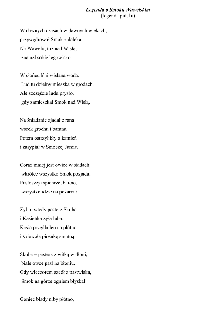 Legenda o Smoku Wawelskim (legenda polska) W dawnych czasach w dawnych wiekach, przywędrował Smok z daleka. Na Wawelu, tuż nad Wisłą, znalazł sobie legowisko. W słońcu lśni wiślana woda. Lud tu dzielny mieszka w grodach. Ale szczęście ludu prysło, gdy zamieszkał Smok nad Wisłą. Na śniadanie zjadał z rana worek grochu i barana. Potem ostrzył kły o kamień i zasypiał w Smoczej Jamie. Coraz mniej jest owiec w stadach, wkrótce wszystko Smok pozjada. Pustoszeją spichrze, barcie, wszystko idzie na pożarcie. Żył tu wtedy pasterz Skuba i Kasieńka żyła luba. Kasia przędła len na płótno i śpiewała piosnkę smutną. Skuba – pasterz z witką w dłoni, białe owce pasł na błoniu. Gdy wieczorem szedł z pastwiska, Smok na górze ogniem błyskał. Goniec blady niby płótno, przyniósł ludziom wieść okrutną oto Smok zażądał właśnie, by za żonę dać mu Kasię. Idą ludzie do pieczary, niosą skarby, niosą dary. A Smok tylko ogniem miota, nie chce skarbów, nie chce złota. Wypłakuje Kasia oczy, smutnym wzrokiem wkoło toczy. Już ja stroją w ślubne szaty i wplatają w warkocz kwiaty. Załamuje ojciec dłonie, biedna matka we łzach tonie. Gniew i rozpacz miota Skubą, chce ratować Kasię lubą. Skuba myślał aż do zmroku: „ nie oddam ci Kasi Smoku…” Do Olkusza szedł piechotę, przyniósł w worze siarkę złotą. Zaszył siarkę w owczą skórę, na Wawelską poszedł Górę. Rzucił skórę tuż przed jamą, potem dróżką zszedł ta samą. Zgasły w Wiśle gwiazdy rano. Wiodą Kasię zapłakaną. Już Smoczysko straszne kroczy, Kasia w dłoniach skryła oczy. A Smok kroczy ku jałowcom, naraz ujrzał skórę owczą. Połknął siarkę w owczej skórze, potem podniósł łeb ku chmurze. Już pragnienie Smoka pali, do wiślanej pędzi fali. Pije, chłepce. Mało, mało! Czy wypije Wisłę całą? Wielka radość była w grodzie. Cieszyli się starsi, młodzież… Znów nastały dobre czasy, stada się spokojnie pasły…. Gdy chcesz ujrzeć Smoczą Jamę na Wawelski przyjedź Zamek. Fala pluszcze i szeleści, a zna wiele opowieści …