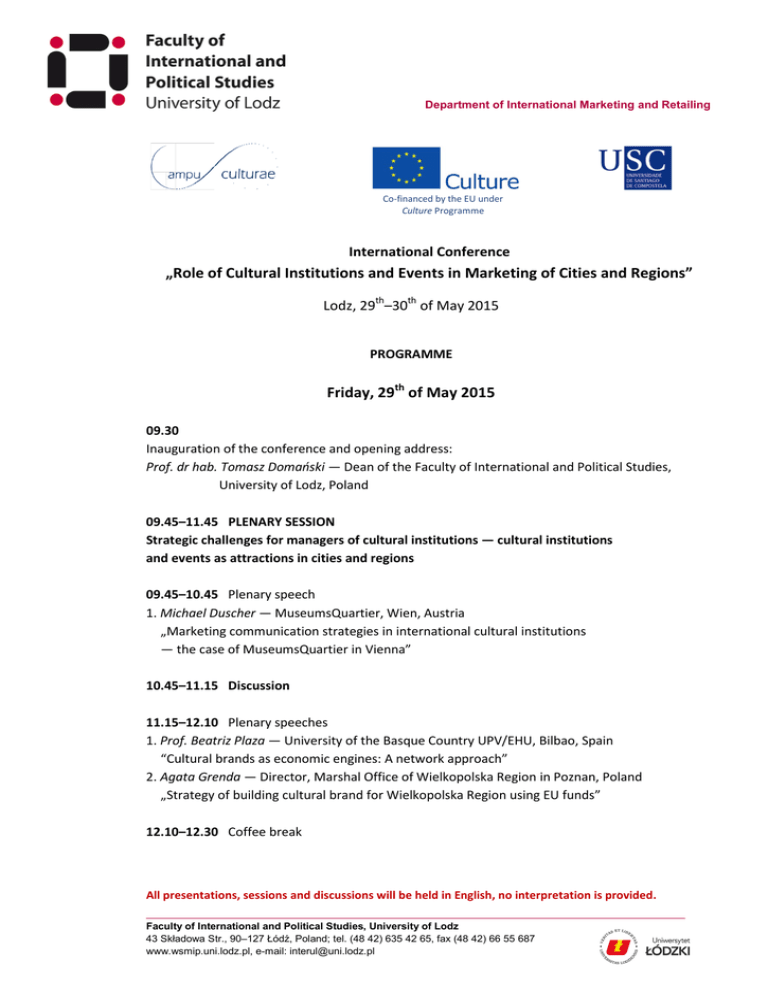 Department of International Marketing and Retailing Co-financed by the EU under Culture Programme International Conference „Role of Cultural Institutions and Events in Marketing of Cities and Regions” Lodz, 29th–30th of May 2015 PROGRAMME Friday, 29th of May 2015 09.30 Inauguration of the conference and opening address: Prof. dr hab. Tomasz Domański — Dean of the Faculty of International and Political Studies, University of Lodz, Poland 09.45–11.45 PLENARY SESSION Strategic challenges for managers of cultural institutions — cultural institutions and events as attractions in cities and regions 09.45–10.45 Plenary speech 1. Michael Duscher — MuseumsQuartier, Wien, Austria „Marketing communication strategies in international cultural institutions — the case of MuseumsQuartier in Vienna” 10.45–11.15 Discussion 11.15–12.10 Plenary speeches 1. Prof. Beatriz Plaza — University of the Basque Country UPV/EHU, Bilbao, Spain “Cultural brands as economic engines: A network approach” 2. Agata Grenda — Director, Marshal Office of Wielkopolska Region in Poznan, Poland „Strategy of building cultural brand for Wielkopolska Region using EU funds” 12.10–12.30 Coffee break All presentations, sessions and discussions will be held in English, no interpretation is provided. Faculty of International and Political Studies, University of Lodz 43 Składowa Str., 90–127 Łódź, Poland; tel. (48 42) 635 42 65, fax (48 42) 66 55 687 www.wsmip.uni.lodz.pl, e-mail: [email protected] 12.30–13.30 PLENARY SESSION Role of cultural events and festivals in building brands of cities and regions 12.30–13.30 Plenary speeches 1. Koen Van Rompaey — European Association of Comic Books Festival, Brussels, Belgium “Geography in 5-D., A new type of cultural geography in a globalized world” 2. Dr Karolina Zielińska-Dąbkowska — Wismar University, Germany “Night in the big city. Artificial lighting as a creative medium used at night and its impact on the authority, significance and prestige of towns and cities throughout history” 13.30–14.30 Lunch 15.15–17.15 PLENARY SESSION with panel discussion at EC1 (former power plant) Role of new generation cultural institutions and creative industries in building the brand of the city of Lodz Plenary speeches 1. Dr Monika Tomczyk — Director of Szczecin Culture Incubator, Szczecin, Poland „Business model of culture and creative industries incubator in the creation of social innovation” 2. Prof. dr hab. Tomasz Domański — Department of International Marketing and Retailing, Faculty of International and Political Studies, University of Lodz, Poland „New generation Culture and Science Centres — challenges and strategic dilemmas” Discussion. Moderator — Prof. dr hab. Tomasz Domański Błażej Moder — Director of EC1-The City of Culture, Lodz, Poland Dr Monika Tomczyk — Szczecin Culture Incubator, Szczecin, Poland 17.30 –18.30 Visit to the Art Factory — Photo Festival 20.00–22.30 Gala dinner and concert in Biedermann Palace All presentations, sessions and discussions will be held in English, no interpretation is provided. Faculty of International and Political Studies, University of Lodz 43 Składowa Str., 90–127 Łódź, Poland; tel. (48 42) 635 42 65, fax (48 42) 66 55 687 www.wsmip.uni.lodz.pl, e-mail: [email protected] Saturday, 30th May 2015 09.30 Conference sessions — cntd 09.45–11.45 PLENARY SESSION Role of the European City of Culture project in city marketing — benefits for cities and regions Plenary speeches 1. Marcin Jasiński — Director of Marketing Department in Impart 2016 Festival Office, institution responsible for the preparation and implementation of the programme of European Capital of Culture 2016 in Wroclaw, Wrocław, Poland „Large-scale cultural event in city marketing, examples of selected European Capitals of Culture” 2. Prof. Wolfgang Schuster — Former Mayor of Stuttgart, Germany „Cultural activities and events as medium for branding in the global competition of cities 3. Prof. Teodoro Luque Martinez — University of Granada, Spain “Influence of the initiative New7wonders on image and intention to visit the city” 11:45–12.15 Coffee break 12.15–14.00 PLENARY SESSION Role of cultural institutions in building the brand of a city and region Plenary speeches 1. Prof. Ala Al-Hamarneh — University of Mainz, Germany “Events and destination branding process — Rethinking the global and the intraregional events in Dubai and Sharjah” 2. Dr Basagaitz Guereno-Omil — University Deusto, Bilbao, Spain „Cultural tourism in Bilbao and its surroundings” 3. Wojciech Kłosowski — Director, Mazovian Cultural Institute, Warsaw, Poland “Mazovian Cultural Institute — the role in building a regional brand” 14.00–15.00 Lunch All presentations, sessions and discussions will be held in English, no interpretation is provided. Faculty of International and Political Studies, University of Lodz 43 Składowa Str., 90–127 Łódź, Poland; tel. (48 42) 635 42 65, fax (48 42) 66 55 687 www.wsmip.uni.lodz.pl, e-mail: [email protected] 15.30–17.30 PLENARY SESSION with panel discussion at the Marek Edelman Dialogue Center in Lodz Role of cultural institutions in preserving the history of the place and its multicultural identity. Educational function of culture and building relationships with the environment. Role of social media in maintaining the dialogue with the community. Plenary speeches 1. Prof. Patrick Leech — University of Bologna, Italy "The ATRIUM cultural route and local development through culture" 2. Dr Nina Mihaljinac — University of the Arts in Belgrade, Serbia “From city identity to city branding: artistic initiatives or top-down urban regeneration?” 3. Natalia Żurowska — The Marek Edelman Dialogue Center in Lodz, Poland “Social media in building a relationship with the audience. Case study: the Marek Edelman Dialogue Center” Discussion. Moder