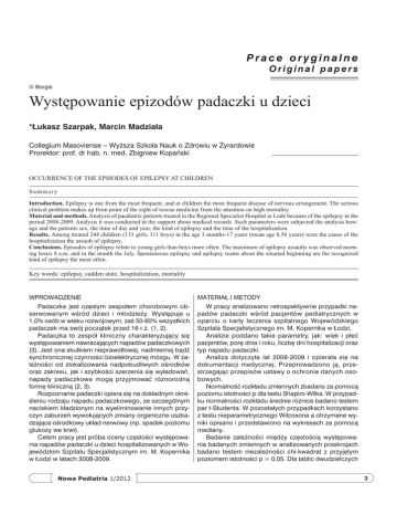 Prace oryginalne Original papers © Borgis Występowanie epizodów padaczki u dzieci *Łukasz Szarpak, Marcin Madziała Collegium Masoviense – Wyższa Szkoła Nauk o Zdrowiu w Żyrardowie Prorektor: prof. dr hab. n. med. Zbigniew Kopański Occurrence of the episodes of epilepsy at children Summary Introduction. Epilepsy is one from the most frequent, and at children the most frequent disease of nervous arrangement. The serious clinical problem makes up from point of the sight of rescue medicine from the attention on high mortality. Material and methods. Analysis of paediatric patients treated in the Regional Specialist Hospital in Lodz because of the epilepsy in the period 2008-2009. Analysis it was conducted in the support about medical records. Such parameters were subjected the analysis how: age and the patients sex, the time of day and year, the kind of epilepsy and the time of the hospitalization. Results. Among treated 244 children (133 girls, 111 boys) in the age 3 months-17 years (mean age 8,56 years) were the cause of the hospitalization the assault of epilepsy. Conclusions. Episodes of epilepsy relate to young girls than boys more often. The maximum of epilepsy assaults was observed morning hours 8 a.m. and in the month the July. Spontaneous epilepsy and epilepsy teams about the situated beginning are the recognized kind of epilepsy the most often. Key words: epilepsy, sudden state, hospitalization, mortality Wprowadzenie Materiał i metody Padaczka jest częstym zespołem chorobowym obserwowanym wśród dzieci i młodzieży. Występuje u 1,0% osób w wieku rozwojowym, zaś 50-60% wszystkich padaczek ma swój początek przed 16 r.ż. (1, 2). Padaczka to zespół kliniczny charakteryzujący się występowaniem nawracających napadów padaczkowych (3). Jest ona skutkiem nieprawidłowej, nadmiernej bądź synchronicznej czynności bioelektrycznej mózgu. W zależności od zlokalizowania nadpobudliwych ośrodków oraz zakresu, jak i szybkości szerzenia się wyładowań, napady padaczkowe mogą przyjmować różnorodną formę kliniczną (2, 3). Rozpoznanie padaczki opiera się na dokładnym określeniu rodzaju napadu padaczkowego, ze szczególnym naciskiem kładzionym na wyeliminowanie innych przyczyn zaburzeń wywołujących zmiany organiczne uszkadzające ośrodkowy układ nerwowy (np. spadek poziomu glukozy we krwi). Celem pracy jest próba oceny częstości występowania napadów padaczki u dzieci hospitalizowanych w Wojewódzkim Szpitalu Specjalistycznym im. M. Kopernika w Łodzi w latach 2008-2009. W pracy analizowano retrospektywnie przypadki napadów padaczki wśród pacjentów pediatrycznych w oparciu o karty leczenia szpitalnego Wojewódzkiego Szpitala Specjalistycznego im. M. Kopernika w Łodzi. Analizie poddano takie parametry, jak: wiek i płeć pacjentów, porę dnia i roku, liczbę dni hospitalizacji oraz typ napadu padaczki. Analiza dotyczyła lat 2008-2009 i opierała się na dokumentacji medycznej. Przeprowadzono ją, przestrzegając przepisów ustawy o ochronie danych osobowych. Normalność rozkładu zmiennych zbadano za pomocą poziomu istotności p dla testu Shapiro-Wilka. W przypadku normalności rozkładu średnie różnice badano testem par t-Studenta. W pozostałych przypadkach korzystano z testu nieparametrycznego Wilcoxona a otrzymane wyniki opisano i przedstawiono na wykresach za pomocą mediany. Badanie zależności między częstością występowania badanych zmiennych w analizowanych przekrojach badano testem niezależności chi-kwadrat z przyjętym poziomem istotności p = 0,05. Dla tablic dwudzielczych Nowa Pediatria 1/2012 3 Łukasz Szarpak, Marcin Madziała siłę zależności między zmiennymi zbadano dodatkowo współczynnikiem V-Cramera. Wyniki W okresie dwóch lat w Wojewódzkim Szpitalu Specjalistycznym im. M. Kopernika w Łodzi leczono 244 przypadki napadów padaczki wśród dzieci w wieku od 3 miesięcy do 17 lat. W badanej grupie przeważały dziewczęta (n = 133; 55%) nad chłopcami (n = 111; 45%; p < 0,001). Średnia wieku badanej grupy wynosiła 8,56 lat ± 5,12 i była nieznacznie wyższa dla dziewcząt (8,81 lat) aniżeli chłopców (8,25 lat). Najbardziej liczną grupą wiekową były osoby w 11 r.ż. stanowiące 7% badanej grupy. Wśród osób w wieku 16 lat odnotowano jedynie 5 przypadków (ryc. 1; p = 0,0000). W grupie chłopców najwięcej przypadków napadów padaczki odnotowano wśród pacjentów w wieku 10 lat (n = 11), następnie w wieku 13 lat (n = 10). Wśród chłopców w wieku 16 lat odnotowano najmniejszą liczbę przypadków (n = 2; p = 0,0012). Wśród dziewcząt najwięcej przypadków odnotowano natomiast w 11 oraz 17 r.ż. (n = 12 dla każdej z grup wiekowych), następnie w 6 r.ż. (n = 10). Podobnie jak w przypadku chłopców, tak też wśród dziewcząt najmniej liczną grupę stanowiły osoby w wieku 16 lat (p = 0,00007). Test U Manna-Whitneya nie wykazał istotnie statystycznej różnicy w średniej wieku dziewcząt i chłopców (ryc. 2; p = 0,3854). Ryc. 1. Rozkład wieku grupy badawczej. Ryc. 2. Wykres ramka – wąsy średniej wieku z uwzględnieniem płci w materiale badawczym. 4 Nowa Pediatria 1/2012 Występowanie epizodów padaczki u dzieci Przeprowadzona analiza z uwzględnieniem występowania napadów padaczki w cyklu dobowym wykazała największe nasilenie występowania napadów padaczki w okresie 9:00-9:59 (n = 72; 30%), następnie 8:00-8:59 (n = 38; 16%). W godzinach 16:00-16:59, 23:00-23:59 oraz 2:00-5:59 nie odnotowano żadnych przypadków (ryc. 3; p = 0,0000). Dodatkowa analiza na podstawie godzin zgrupowanych do czterech rozłącznych grup: 0:00-5:59, 6:00-11:59, 12:00-17:59, 18:23:59 wykazała największe nasilenie przypadków napadu padaczki w godzinach przedpołudniowych (6:00-11:59 – 153 przypadki; 63%), następnie w okresie późnowieczornym 18:00-23:59 (n = 58; 24%). W okresie 12:00-17:59 odnotowano 13% wszystkich przypadków (n = 31). Najmniej, bo jedynie dwa przypadki, odnotowano w ok