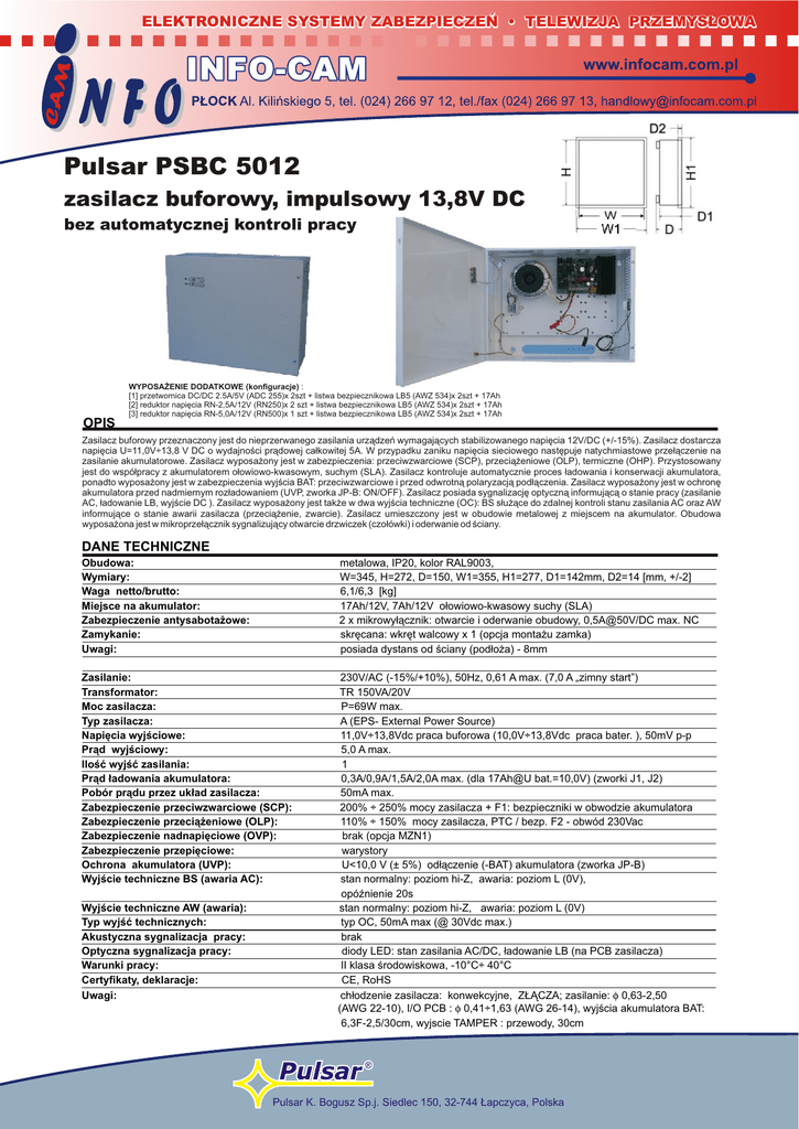 ELEKTRONICZNE SYSTEMY ZABEZPIECZEŃ • TELEWIZJA PRZEMYSŁOWA Pulsar PSBC 5012 zasilacz buforowy, impulsowy 13,8V DC bez automatycznej kontroli pracy OPIS WYPOSAŻENIE DODATKOWE (konfiguracje) : [1] przetwornica DC/DC 2.5A/5V (ADC 255)x 2szt + listwa bezpiecznikowa LB5 (AWZ 534)x 2szt + 17Ah [2] reduktor napięcia RN-2,5A/12V (RN250)x 2 szt + listwa bezpiecznikowa LB5 (AWZ 534)x 2szt + 17Ah [3] reduktor napięcia RN-5,0A/12V (RN500)x 1 szt + listwa bezpiecznikowa LB5 (AWZ 534)x 2szt + 17Ah Zasilacz buforowy przeznaczony jest do nieprzerwanego zasilania urządzeń wymagających stabilizowanego napięcia 12V/DC (+/-15%). Zasilacz dostarcza napięcia U=11,0V÷13,8 V DC o wydajności prądowej całkowitej 5A. W przypadku zaniku napięcia sieciowego następuje natychmiastowe przełączenie na zasilanie akumulatorowe. Zasilacz wyposażony jest w zabezpieczenia: przeciwzwarciowe (SCP), przeciążeniowe (OLP), termiczne (OHP). Przystosowany jest do współpracy z akumulatorem ołowiowo-kwasowym, suchym (SLA). Zasilacz kontroluje automatycznie proces ładowania i konserwacji akumulatora, ponadto wyposażony jest w zabezpieczenia wyjścia BAT: przeciwzwarciowe i przed odwrotną polaryzacją podłączenia. Zasilacz wyposażony jest w ochronę akumulatora przed nadmiernym rozładowaniem (UVP, zworka JP-B: ON/OFF). Zasilacz posiada sygnalizację optyczną informującą o stanie pracy (zasilanie AC, ładowanie LB, wyjście DC ). Zasilacz wyposażony jest także w dwa wyjścia techniczne (OC): BS służące do zdalnej kontroli stanu zasilania AC oraz AW informujące o stanie awarii zasilacza (przeciążenie, zwarcie). Zasilacz umieszczony jest w obudowie metalowej z miejscem na akumulator. Obudowa wyposażona jest w mikroprzełącznik sygnalizujący otwarcie drzwiczek (czołówki) i oderwanie od ściany. DANE TECHNICZNE Obudowa: Wymiary: Waga netto/brutto: Miejsce na akumulator: Zabezpieczenie antysabotażowe: Zamykanie: Uwagi: metalowa, IP20, kolor RAL9003, W=345, H=272, D=150, W1=355, H1=277, D1=142mm, D2=14 [mm, +/-2] 6,1/6,3 [kg] 17Ah/12V, 7Ah/12V ołowiowo-kwasowy suchy (SLA) 2 x mikrowyłącznik: otwarcie i oderwanie obudowy, 0,5A@50V/DC max. NC skręcana: wkręt walcowy x 1 (opcja montażu zamka) posiada dystans od ściany (podłoża) - 8mm Zasilanie: Transformator: Moc zasilacza: Typ zasilacza: Napięcia wyjściowe: Prąd wyjściowy: Ilość wyjść zasilania: Prąd ładowania akumulatora: Pobór prądu przez układ zasilacza: Zabezpieczenie przeciwzwarciowe (SCP): Zabezpieczenie przeciążeniowe (OLP): Zabezpieczenie nadnapięciowe (OVP): Zabezpieczenie przepięciowe: Ochrona akumulatora (UVP): Wyjście techniczne BS (awaria AC): 230V/AC (-15%/+10%), 50Hz, 0,61 A max. (7,0 A „zimny start”) TR 150VA/20V P=69W max. A (EPS- External Power Source) 11,0V÷13,8Vdc praca buforowa (10,0V÷13,8Vdc praca bater. ), 50mV p-p 5,0 A max. 1 0,3A/0,9A/1,5A/2,0A max. (dla 17Ah@U bat.=10,0V) (zworki J1, J2) 50mA max. 200% ÷ 250% mocy zasilacza + F1: bezpieczniki w obwodzie akumulatora 110% ÷ 150% mocy zasilacza, PTC / bezp. F2 - obwód 230Vac brak (opcja MZN1) warystory U<10,0 V (± 5%) odłączenie (-BAT) akumulatora (zworka JP-B) stan normalny: poziom hi-Z, awaria: poziom L (0V), opóźnienie 20s stan normalny: poziom hi-Z, awaria: poziom L (0V) typ OC, 50mA max (@ 30Vdc max.) brak diody LED: stan zasilania AC/DC, ładowanie LB (na PCB zasilacza) II klasa środowiskowa, -10°C÷ 40°C CE, RoHS chłodzenie zasilacza: konwekcyjne, ZŁĄCZA; zasilanie: f 0,63-2,50 (AWG 22-10), I/O PCB : f 0,41÷1,63 (AWG 26-14), wyjścia akumulatora BAT: 6,3F-2,5/30cm, wyjscie TAMPER : przewody, 30cm Wyjście techniczne AW (awaria): Typ wyjść technicznych: Akustyczna sygnalizacja pracy: Optyczna sygnalizacja pracy: Warunki pracy: Certyfikaty, deklaracje: Uwagi: Pulsar K. Bogusz Sp.j. Siedlec 150, 32-744 Łapczyca, Polska