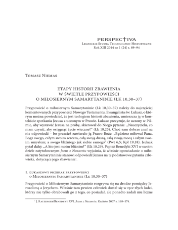 Etapy historii zbawienia w świetle przypowieści… 89 perspec†iva Legnickie Studia Teologiczno-Historyczne Rok XIII 2014 nr 1 (24) s. 89–94 Tomasz Niemas ETAPY HISTORII ZBAWIENIA W ŚWIETLE PRZYPOWIEŚCI O MIŁOSIERNYM SAMARYTANINIE (ŁK 10,30–37) Przypowieść o miłosiernym Samarytaninie (Łk 10,30–37) należy do najczęściej komentowanych przypowieści Nowego Testamentu. Ewangelista św. Łukasz, o którym można powiedzieć, że jest teologiem historii zbawienia, umieszcza ją w kontekście spotkania Jezusa z uczonym w Prawie. Łukasz precyzuje, że uczony w Piśmie, aby wystawić Jezusa na próbę, skierował do Niego pytanie: „Nauczycielu, co mam czynić, aby osiągnąć życie wieczne?” (Łk 10,25). Choć sam dobrze znał na nie odpowiedź – bo przecież zawierało ją Prawo Boże: „Będziesz miłował Pana, Boga swego, całym swoim sercem, całą swoją duszą, całą swoją mocą i całym swoim umysłem; a swego bliźniego jak siebie samego” (Pwt 6,5; Kpł 19,18). Jednak pytał dalej: „A kto jest moim bliźnim?” (Łk 10,29). Papież Benedykt XVI w swoim dziele zatytułowanym Jezus z Nazaretu wyjaśnia, iż właśnie opowiadanie o miłosiernym Samarytaninie stanowi odpowiedź Jezusa na te podstawowe pytania człowieka, dotyczące jego zbawienia1. 1. Łukaszowy przekaz przypowieści o Miłosiernym Samarytaninie (Łk 10,30–37) Przypowieść o Miłosiernym Samarytaninie rozgrywa się na drodze pomiędzy Jerozolimą a Jerychem. Właśnie tam pewien człowiek dostał się w ręce złych ludzi, którzy nie tylko obrabowali go z tego, co posiadał, ale ponadto zadali mu liczne J. Ratzinger/Benedykt Xvi. Jezus z Nazaretu. Kraków 2007 s. 168–174. 1 Tomasz Niemas 90 rany i na pół umarłego pozostawili przy drodze. Ponieważ miejsce to było uczęszczane, wnet pojawiły się tam konkretne osoby. Najpierw zjawił się kapłan, jednak minął tego człowieka, nie udzieliwszy mu pomocy. Niedługo po nim przechodził tamtędy lewita (urzędnik kultu świątynnego), który również poszedł dalej swoją drogą, nie zatrzymując się przy śmiertelnie rannym. Dopiero Samarytanin – cudzoziemiec, postrzegany przez Żydów jako ich nieprzyjaciel – zdjęty głęboką litością, nie tylko zainteresował się nieszczęśnikiem, ale przyszedł mu z bardzo konkretną i daleko idącą pomocą. Nie tylko na miejscu opatrzył rany owego człowieka, „zalewając je oliwą i winem” (Łk 10,34), ale również zawiózł go potem na swoim bydlęciu do gospody i jeszcze zapłacił gospodarzowi „dwa denary” (Łk 10, 35), aby ten dalej troszczył się o niego. Zobowiązał się też pokryć wszystkie dodatkowe wydatki związane z pielęgnacją rannego człowieka. 2. Analiza przekazu Łk 10,30–37 Wskazane w przypowieści miasto Jerozolima2, położone na świętej górze Syjon (Iz 56,7), dla narodu izraelskiego było siedzibą samego Boga Jahwe: „Niech będzie błogosławiony Pan z Syjonu, który mieszka w Jeruzalem!” (Ps 135,21). Naród wybrany wierzył, iż właśnie tutaj można spotkać się z Bogiem w uprzywilejowanym miejscu, jakim była świątynia jerozolimska3. Święte miasto to także miejsce, w którym dokonały się najważniejsze wydarzenia historii zbawienia: męka, śmierć i zmartwychwstanie Jezusa oraz zesłanie Ducha Świętego4. Stolica narodu Izraela była w oczach chrześcijan alegorycznym obrazem Jeruzalem niebieskiego, miasta Boga żywego, do którego chrześcijanie wchodzą przez chrzest św. (por. Hbr 12,22 n; Ap 21)5. Pobyt podróżnego w Jerozolimie można zatem interpretować symbolicznie jako stan pierwotnej przyjaźni z Bogiem, którą człowiek cieszył się w raju przed grzechem pierworodnym. Poniżej miasta świętego położone jest Jerycho. Z Jerozolimy prowadzi do niego stroma droga opadająca serpentynami (ponad 1000 m różnicy poziomów na przestrzeni 25 km) przez wyludniony, skalisty teren, idealnie nadający się na zbójeckie napady6. Dlatego Jezus mówi o schodzeniu z Jerozolimy do Jerycha Jej nazwa oznacza pokój, jednak na przestrzeni wieków pokój był w tym mieście rzadkim gościem, chociaż zawsze wyczekiwanym. Miasto było oblegane ponad pięćdziesiąt razy, zdobyte dwadzieścia sześć razy i zburzone co najmniej dziesięciokrotnie. T. Jelonek. Ziemia Święta. Śladami historii zbawienia. Kraków 2000 s. 136. 3 O znaczeniu świątyni jerozolimskiej w dziejach narodu wybranego opowiada: Świątynia Jerozolimska. Red. M. Rosik. Wrocław 2007 s. 31–102. 4 F. Fernández-Carvajal. Życie Jezusa według Ewangelii. Droga do Ojca. Tłum. E. Książkiewicz. Kraków 2010 s. 5–219. 5 X. Léon-Dufour. Słownik teologii biblijnej. Tłum. K. Romaniuk. Poznań 1994 s. 343. 6 Przewodnik po Biblii. Red. D. i P. Alexander.Tłum. T. Mieszkowski. Warszawa 2005 s. 522. 2 Etapy historii zbawienia w świetle przypowieści… 91 (Łk 10,30), co należy traktować metaforycznie jako odejście człowieka od Boga. Jerycho jest obrazem świata w znaczeniu nadanym mu przez ewangelistów, zwłaszcza przez św. Jana, tzn. przykładem społeczności tych ludzi, którzy odrzucają Boga7. Jak pisze w swoim dziele J. Ratzinger: „[…] półżywy człowiek leżący na skraju drogi jest obrazem ludzkości”8. Odejście od Boga sprawiło, że podróżny wpadł w ręce zbójców, czyli swoich grzechów. Zgodnie z wymową przypowieści, grzech powoduje w człowieku głębokie rany, niszczy go i zabija. Oddalenie się od Boga niemalże przyprawiło podróżnego o śmierć. Obdarcie z szat (Łk 10,30) obrazuje natomiast utratę godności synostwa Bożego. W kapłanie i lewicie, którzy minęli obojętnie rannego i nie udzielili mu pomocy, można widzieć Stare Przymierze, które nie przynosi ratunku w trudnej egzystencjalnej sytuacji, nie daje zbawienia. Kapłan i lewita – ludzie powołani do szczególnej bliskości z Bogiem poprzez sprawowanie czynności liturgicznych w świątyni – sądząc prawdopodobnie, że człowiek ów nie żyje, nie c