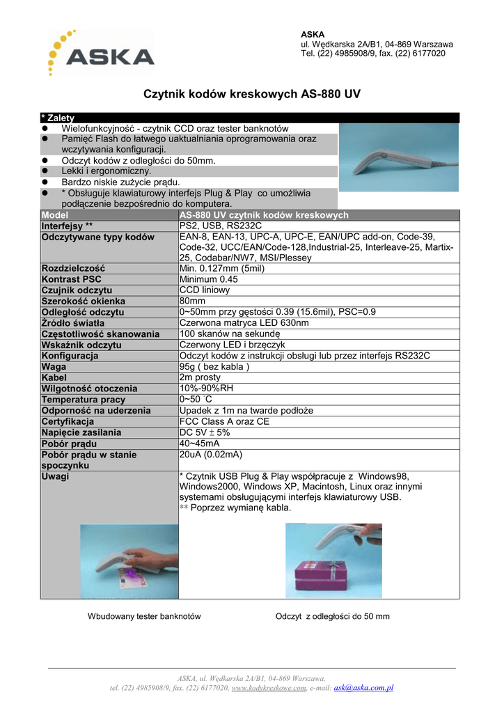 ASKA ul. Wędkarska 2A/B1, 04-869 Warszawa Tel. (22) 4985908/9, fax. (22) 6177020 Czytnik kodów kreskowych AS-880 UV * Zalety l Wielofunkcyjność - czytnik CCD oraz tester banknotów l Pamięć Flash do łatwego uaktualniania oprogramowania oraz wczytywania konfiguracji. l Odczyt kodów z odległości do 50mm. l Lekki i ergonomiczny. l Bardzo niskie zużycie prądu. l * Obsługuje klawiaturowy interfejs Plug & Play co umożliwia podłączenie bezpośrednio do komputera. Model AS-880 UV czytnik kodów kreskowych PS2, USB, RS232C Interfejsy ** EAN-8, EAN-13, UPC-A, UPC-E, EAN/UPC add-on, Code-39, Odczytywane typy kodów Code-32, UCC/EAN/Code-128,Industrial-25, Interleave-25, Martix25, Codabar/NW7, MSI/Plessey Min. 0.127mm (5mil) Rozdzielczość Minimum 0.45 Kontrast PSC CCD liniowy Czujnik odczytu 80mm Szerokość okienka 0~50mm przy gęstości 0.39 (15.6mil), PSC=0.9 Odległość odczytu Czerwona matryca LED 630nm Źródło światła 100 skanów na sekundę Częstotliwość skanowania Czerwony LED i brzęczyk Wskaźnik odczytu Odczyt kodów z instrukcji obsługi lub przez interfejs RS232C Konfiguracja 95g ( bez kabla ) Waga 2m prosty Kabel 10%-90%RH Wilgotność otoczenia 0~50 °C Temperatura pracy Upadek z 1m na twarde podłoże Odporność na uderzenia FCC Class A oraz CE Certyfikacja DC 5V ± 5% Napięcie zasilania 40~45mA Pobór prądu 20uA (0.02mA) Pobór prądu w stanie spoczynku * Czytnik USB Plug & Play współpracuje z Windows98, Uwagi Windows2000, Windows XP, Macintosh, Linux oraz innymi systemami obsługującymi interfejs klawiaturowy USB. ** Poprzez wymianę kabla. Wbudowany tester banknotów Odczyt z odległości do 50 mm ASKA, ul. Wędkarska 2A/B1, 04-869 Warszawa, tel. (22) 4985908/9, fax. (22) 6177020, www.kodykreskowe.com, e-mail: [email protected]