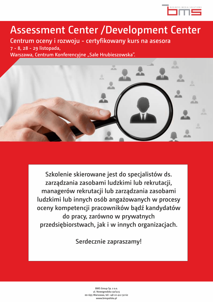 Assessment Center /Development Center Centrum oceny i rozwoju - certyfikowany kurs na asesora 7 - 8, 28 - 29 listopada, Warszawa, Centrum Konferencyjne „Sale Hrubieszowska”. Szkolenie skierowane jest do specjalistów ds. zarządzania zasobami ludzkimi lub rekrutacji, managerów rekrutacji lub zarządzania zasobami ludzkimi lub innych osób angażowanych w procesy oceny kompetencji pracowników bądź kandydatów do pracy, zarówno w prywatnych przedsiębiorstwach, jak i w innych organizacjach. Serdecznie zapraszamy! BMS Group Sp. z o.o. ul. Nowogrodzka 50/515 00-695 Warszawa, tel: +48 22 412 50 62 www.bmspolska.pl WSTĘP Assessment Center / Development Center Assessment / Development Centre to jedna z najefektywniejszych metod oceny kompetencji pracowników (lub kandydatów do pracy), która wśród wielu specjalistów i managerów HR, posiada opinię, procesu trudnego, czasochłonnego i kosztowego do przeprowadzenia. Celem kursu „Assessment/ Development Centre” jest „odczarowanie” tej opinii i wyposażenie uczestników w wiedzę, narzędzia i umiejętności pozwalające na efektywne zaprojektowanie i przeprowadzenie procesu A/DC zarówno na potrzeby procesów rekrutacji jaki i w procesach HR, które wymagają oceny kompetencji pracowników. Dla uczestników, którzy odbędą cały kurs oraz zrealizują projekt ośrodka oceny/rozwoju, kurs zakończy się certyfikatem wystawionym przez instytucję zarejestrowaną w Krajowym Rejestrze Instytucji Szkoleniowych (pozostali uczestnicy kurs zakończą zaświadczeniem o jego ukończeniu). Kurs obejmuje: 4 dni szkoleniowe (po 8 godz. każdy) obywające się w 2-ch modułach dwudniowych, opracowanie projektu ośrodka oceny/ rozwoju (w ramach pracy pomiędzy modułami), ź aktywne ćwiczenie umiejętności projektowania i prowadzenia ośrodka oceny/ rozwoju ( w tym umiejętności związane w wyciąganiem wniosków oraz udzielaniem informacji zwrotnej po ośrodku) ź ź Cele kursu: ź wyposażenie i usystematyzowanie wiedzy uczestników w obszarze A/DC jako narzędzia rekrutacji i rozwoju pracowników, ź nabycie umiejętności projektowania A/DC (w tym opanowanie umiejętności układania harmonogramu A/DC, projektowania ćwiczeń, raportów, etc.), ź ćwiczenie umiejętności niezbędnych do pełnienia poszczególnych ról w A/DC (w tym asesora, asesora wiodącego, koordynatora, osoby prowadzącej wywiad, „aktora”), ź nabycie umiejętności pozwalających na unikanie pułapek w pracy w poszczególnych rolach podczas A/DC, ź budowanie pewności w wykorzystaniu A/DC jako efektywnego i prostego narzędzia oceny kompetencji pracowników i kandydatów. BMS Group Sp. z o.o. ul. Nowogrodzka 50/515 00-695 Warszawa, tel: +48 22 412 50 62 www.bmspolska.pl PROGRAM Program kursu Dzień I 1. Wprowadzenie do tematyki A/DC ź Czym jest Assessement/ Development Centre? ź Jakie jest pochodzenie i wykorzystanie narzędzia A/DC w zarządzaniu zasobami ludzkimi? ź Kluczowe różnice i podobieństwa między ośrodkami oceny i rozwoju (dyskusja grupowa). ź Korzyści z wykorzystywania A/DC w zarządzaniu zasobami ludzkimi 2. Kompetencje ź Czym kompetencja jest, a czym nie – zapoznanie z definicjami i wybór / opis definicji w danej organizacji (praca na bazie studium przypadku) ź Behawioralność a opis kompetencji - definiowanie pozytywnych i negatywnych zachowań. ź Tworzenie behawioralnych opisów kompetencji na cele narzędzi A/DC (praca w parach) 3. Projektowanie i harmonogram A/DC ź Kluczowe aspekty wpływające na efektywność procesu A/DC (np. ilość mierzonych kompetencji, jakość definicji poszczególnych kompetencji) ź Wybór ćwiczeń podczas A/DC i ich wpływ na harmonogram (praca indywidualna lub w parach). 4. Projektowanie ról dla osób zaangażowanych w proces Analiza ról i odpowiedzialności osób w procesie A/DC ź Wybór osób do poszczególnych ról (omówienie najważniejszych kryteriów) ź Przygotowanie asesorów i aktorów do prowadzenia A/DC (studium przypadku) ź Dzień II 1. Rodzaje oraz dobór zadań i ćwiczeń do celu A/DC (grupowe, testy, rozmowy behawioralne, indywidualne, etc.) ź Praca w parach oraz podgrupach bazująca na zapoznaniu z najczęściej wykorzystywanymi 2. Prowadzenie sesji integracyjnej ź Cele sesji ź Najczęściej pojawiające się błędy i problemy – opracowanie narzędzi/ podejścia prewencyjnego 3. Raporty z A/DC - studium przypadku 4. Zakańczanie i podsumowywanie A/DC – omówienie podstawowych zasad. BMS Group Sp. z o.o. ul. Nowogrodzka 50/515 00-695 Warszawa, tel: +48 22 412 50 62 www.bmspolska.pl PROGRAM Program kursu Dzień III 1. Narzędzia i zasady pracy asesora (opanowanie ORCE – Observe, Record, Classify, Evaluate) – zestaw ćwiczeń indywidualnych i w parach pozwalających uczestnikom na rozwój umiejętności obserwacji, notowania, klasyfikowania i oceny obserwowanych podczas A/DC zachowań pożądanych i niepożądanych) 2. Skalowanie ocen – ćwiczenia w parach 3. Udzielanie informacji zwrotnej Komu i kiedy udzielać informacji zwrotnej po A/DC? ź Dlaczego warto udzielać informacji zwrotnej? ź Ćwiczenie struktury udzielania informacji zwrotnej ź Dzień IV 1. Błędy oceniania i interpretacji ź Najczęściej pojawiającej się błędy w pracy asesora i sposoby ich unikania 2. Zasady etyczne w pracy asesora 3. Prezentacje projektów uczestników kursu. ź Uczestnicy kursu prezentują przygotowane projekty A/DC bazujące na nabytej wiedzy i umiejętnościach 4. Zakończenie kursu, wręczenie certyfikatów, podsumowanie. BMS Group Sp. z o.o. ul. Nowogrodzka 50/515 00-695 Warszawa, tel: +48 22 412 50 62 www.bmspolska.pl SYLWETKA TRENERA Nasz Trener: Elżbieta Malicka Doświadczony Manager HR, certyfikowany Trener i Coach. Od 15 lat aktywnie związana z zarządzaniem zasobami ludzkimi w firmach różnych branż i krajów. Z rozwojem kompetencji służb HR i liderów w biznesie związana od początku kariery w obszarze HR. Swoją przygodę z międzynarodowym HR 