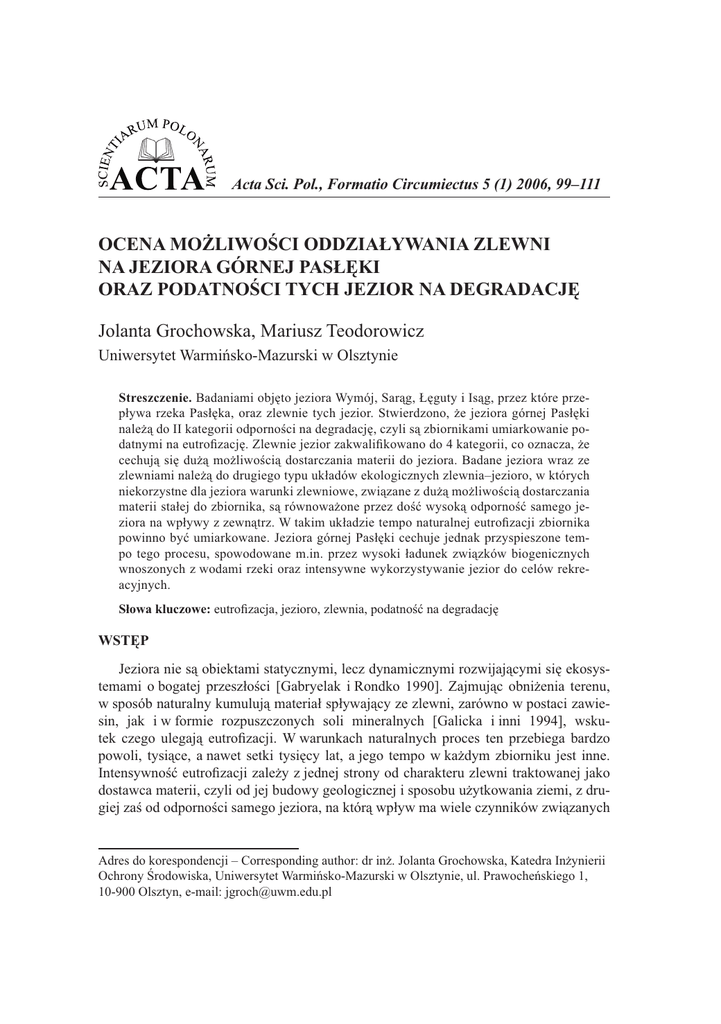 Acta Sci. Pol., Formatio Circumiectus 5 (1) 2006, 99–111 OCENA MOŻLIWOŚCI ODDZIAŁYWANIA ZLEWNI NA JEZIORA GÓRNEJ PASŁĘKI ORAZ PODATNOŚCI TYCH JEZIOR NA DEGRADACJĘ Jolanta Grochowska, Mariusz Teodorowicz Uniwersytet Warmińsko-Mazurski w Olsztynie Streszczenie. Badaniami objęto jeziora Wymój, Sarąg, Łęguty i Isąg, przez które przepływa rzeka Pasłęka, oraz zlewnie tych jezior. Stwierdzono, że jeziora górnej Pasłęki należą do II kategorii odporności na degradację, czyli są zbiornikami umiarkowanie podatnymi na eutrofizację. Zlewnie jezior zakwalifikowano do 4 kategorii, co oznacza, że cechują się dużą możliwością dostarczania materii do jeziora. Badane jeziora wraz ze zlewniami należą do drugiego typu układów ekologicznych zlewnia–jezioro, w których niekorzystne dla jeziora warunki zlewniowe, związane z dużą możliwością dostarczania materii stałej do zbiornika, są równoważone przez dość wysoką odporność samego jeziora na wpływy z zewnątrz. W takim układzie tempo naturalnej eutrofizacji zbiornika powinno być umiarkowane. Jeziora górnej Pasłęki cechuje jednak przyspieszone tempo tego procesu, spowodowane m.in. przez wysoki ładunek związków biogenicznych wnoszonych z wodami rzeki oraz intensywne wykorzystywanie jezior do celów rekreacyjnych. Słowa kluczowe: eutrofizacja, jezioro, zlewnia, podatność na degradację WSTĘP Jeziora nie są obiektami statycznymi, lecz dynamicznymi rozwijającymi się ekosystemami o bogatej przeszłości [Gabryelak i Rondko 1990]. Zajmując obniżenia terenu, w sposób naturalny kumulują materiał spływający ze zlewni, zarówno w postaci zawiesin, jak i w formie rozpuszczonych soli mineralnych [Galicka i inni 1994], wskutek czego ulegają eutrofizacji. W warunkach naturalnych proces ten przebiega bardzo powoli, tysiące, a nawet setki tysięcy lat, a jego tempo w każdym zbiorniku jest inne. Intensywność eutrofizacji zależy z jednej strony od charakteru zlewni traktowanej jako dostawca materii, czyli od jej budowy geologicznej i sposobu użytkowania ziemi, z drugiej zaś od odporności samego jeziora, na którą wpływ ma wiele czynników związanych Adres do korespondencji – Corresponding author: dr inż. Jolanta Grochowska, Katedra Inżynierii Ochrony Środowiska, Uniwersytet Warmińsko-Mazurski w Olsztynie, ul. Prawocheńskiego 1, 10-900 Olsztyn, e-mail: [email protected] 100 J. Grochowska, M. Teodorowicz z jego morfometrią i hydrologią [Bajkiewicz-Grabowska 1985, Kudelska i inni 1994, Szyper 2000]. Ochrona ekosystemów jeziornych, polegająca na ograniczaniu spływu substancji biogenicznych i organicznych ze zlewni, wymaga znajomości naturalnej odporności zbiornika na degradację oraz roli, jaką zlewnia odgrywa w przyspieszaniu bądź hamowaniu jego eutrofizacji. Interesujący obszar badań stanowią jeziora Wymój, Sarąg, Łęguty i Isąg, przez które przepływa rzeka Pasłęka. W 1970 r. rozporządzeniem Ministerstwa Ochrony Środowiska, Zasobów Naturalnych i Leśnictwa w dorzeczu Pasłęki utworzono rezerwat przyrody – Ostoja Bobrów na rzece Pasłęce, który rozciągał się na obszarze 4116,18 ha na terenie byłych województw olsztyńskiego i elbląskiego. Obecnie powierzchnia rezerwatu wynosi 1903 ha [Endler i Zielińska 1994]. W skład rezerwatu wchodzą wspomniane cztery jeziora oraz rzeka Pasłęka na odcinku od źródeł do jej ujścia do jeziora Isąg. Dorzecze Pasłęki i jeziora, przez które przepływa ta rzeka, nie były dotychczas przedmiotem żadnych poważniejszych badań ani analiz ze strony limnologów, hydrologów i geografów. Ze względu na niepowtarzalne walory krajobrazowe i przyrodnicze obszar ten powinien podlegać określonym zasadom użytkowania i ochrony. Celem pracy było określenie naturalnej podatności jezior Wymój, Sarąg, Łęguty i Isąg na degradację, ocenienie oddziaływania ich zlewni jako dostawcy materii biogenicznej oraz oszacowanie tempa naturalnej eutrofizacji tych jezior. MATERIAŁ I METODY Badaniami objęto cztery jeziora leżące na trasie przepływu pojeziernej rzeki Pasłęki (patrz rysunek). Źródliska Pasłęki znajdują się ok. 25 km na południowy-zachód od Olsztyna, na zabagnionych łąkach w pobliżu wsi Gryźliny, na wysokości 188 m n.p.m. Na początku swego biegu rzeka płynie przez niewielkie jezioro Pasłęk, a dalej – przez jeziora Wymój, Sarąg, Łęguty i Isąg oraz sztuczny zbiornik Pierzchalski – niesie wody do Zalewu Wiślanego. Jeziora, przez które przepływa Pasłęka, są znacznie zróżnicowane morfometrycznie (tab. 1). Jeziora pasłęckie leżą na obszarze falistej wysoczyzny morenowej, pod względem geologiczno-morfologicznym wykształconej w marginalnej strefie pomorskiej fazy zlodowacenia bałtyckiego [Forovic 1975, Panfil 1978]. Dolina Pasłęki to holoceńska równina zalewowa i nadzalewowa. Falistą wysoczyznę morenową budują piaski i żwiry wodnolodowcowe z początków fazy pomorskiej oraz piaski i żwiry moreny czołowej. Dolina Pasłęki zbudowana jest głównie z piasków rzecznych. Skałą macierzystą dla gleb obszaru wysoczyzny są piaski międzymorenowe, a w dolinach wyraźnie dominują piaski rzeczne i piaski akumulacji lodowcowej. Na terenie dorzecza Pasłęki przeważają gleby brunatne (z przewagą gleb brunatnych bielicowych), ponadto występują tam gleby murszowo-mineralne, torfowo-murszowe, czarnoziemy, gleby torfowe torfowisk niskich i przejściowych, gleby mułowo-glejowe oraz bielicowe właściwe [Uggla 1956]. Acta Sci. Pol. Ocena możliwości oddziaływania zlewni na jeziora... Rys. Fig. 101 Mapa terenu badań Map of study area Powierzchnia zlewni całkowitej jeziora Wymój wynosi 2260 ha, a bezpośredniej 60,2 ha. Największy udział w zlewni bezpośredniej – 52% powierzchni – mają tereny porośnięte lasami, obszary użytkowane rolniczo stanowią 36%, a tereny zabudowane i bagna po 6% jej obszaru. Zlewnia całkowita jeziora Sarąg ma powierzchnię 18 