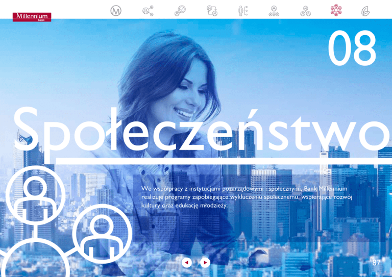 08 Społeczeństwo We współpracy z instytucjami pozarządowymi i społecznymi, Bank Millennium realizuje programy zapobiegające wykluczeniu społecznemu, wspierające rozwój kultury oraz edukację młodzieży. 87 Bank Millennium 8.1. DZIAŁALNOŚĆ PROSPOŁECZNA Wolontariat Program społeczny Nikifory Od 2009 roku Bank Millennium jest stałym partnerem Fundacji Wspólna Droga przy realizacji programu społecznego Nikifory. Celem projektu jest pokonywanie izolacji osób niepełnosprawnych intelektualnie poprzez rozwój i promocję ich aktywności twórczej. Odpowiedzialny biznes 2015 Interesariusze Banku Bezpieczeństwo powierzonych środków Klienci Inwestorzy W 2015 roku Pracownicy przy współudziale Banku zaangażowali się w szereg wydarzeń na rzecz wsparcia programu Nikifory: ü zorganizowano dwa wolontariaty pracownicze, podczas których wolontariusze uczestniczyli w organizacji konkursu plastycznego Świat Nikiforów oraz w warsztatach artystycznych dla laureatów tego konkursu; ü w siedzibie Centrali Banku zaprezentowano wystawę prac artystów niepełnosprawnych połączoną z aukcją intranetową. Pozyskane podczas licytacji środki zostały przekazane na wsparcie i rozwój artystów niepełnosprawnych; Partnerzy biznesowi Pracownicy Społeczeństwo Środowisko naturalne ü zwieńczeniem wspólnych działań była uroczysta Gala Fundacji United Way Polska i rozdanie laureatom konkursu Świat Nikiforów nagród ufundowanych przez Bank Millennium. Program Nikifory 2009 – 2015 Liczba wolontariuszy Banku 93 Liczba beneficjentów Programu 1 922 ü przy współudziale Fundacji zorganizowano wewnętrzne warsztaty dla Pracowników Banku, promujące korzyści z angażowania się w wolontariat; 88 Bank Millennium Interesariusze Banku Bezpieczeństwo powierzonych środków Klienci Inwestorzy BAKCYL – Bankowcy dla Edukacji Finansowej Młodzieży [G4-FS16] Wolontariusze z Banku Millennium uczestniczą we wspólnym projekcie polskiego sektora bankowego BAKCYL – Bankowcy dla Edukacji Finansowej Młodzieży. Pomysłodawcą i organizatorem projektu jest Warszawski Instytut Bankowości. BAKCYL, oparty na zaangażowaniu pracowników banków w roli trenerów wolontariuszy, ma na celu przekazanie uczniom gimnazjum praktycznej wiedzy finansowej i umiejętności korzystania z usług finansowych. W ramach projektu opracowano cztery programy lekcji: Twoje pieniądze, Pożyczaj z głową, Mądre inwestowanie oraz Finanse na całe życie, które są kompendium wiedzy finansowej dla młodych ludzi. Odpowiedzialny biznes 2015 Partnerzy biznesowi Pracownicy Społeczeństwo Środowisko naturalne Wolontariat 55+ Począwszy od roku 2013, w ramach BAKCYLA łącznie 145 wolontariuszy przeprowadziło 746 lekcji. W przeprowadzonych lekcjach uczestniczyło ponad 16,5 tys. uczniów. Bank Millennium w BAKCYLU 2013 – 2015 Liczba wolontariuszy 18 Liczba przeprowadzonych lekcji 89 Liczba przeszkolonych uczniów 1 780 Pracownicy Banku w wieku powyżej 55. roku życia biorą udział w programie Lokomotywa zmian realizowanym przez Stowarzyszenie Centrum Wolontariatu. Celem programu jest aktywizacja i rozwój uczestników oraz wykorzystanie ich doświadczeń do realizacji działań społecznych. Osobom biorącym udział w programie oferowane są szkolenia i doradztwo, które przygotowują do roli wolontariusza oraz pomagają w opracowaniu koncepcji i sposobu realizacji pomysłu na działanie społeczne. Projekt zakończy się w 2016 roku, a jego finałem będzie realizacja przez każdego z uczestników własnego programu społecznego lub wolontariackiego. 89 Bank Millennium Interesariusze Banku Bezpieczeństwo powierzonych środków Klienci Inwestorzy Partnerzy biznesowi Pracownicy Społeczeństwo Środowisko naturalne Akcje charytatywne Bieg Firmowy 2015 Ilość uczestników biegu 5 300 Kwota przekazana na cel charytatywny (zł) 52 000 Charytatywny Bieg Firmowy Pracownicy Banku Dzieciom W Charytatywnym Biegu Firmowym zorganizowanym przez Fundację Everest w Warszawie i Wrocławiu uczestniczyło 92 Pracowników Banku Millennium. W roku 2015 Pracownicy Grupy Banku Millennium zorganizowali dwie zbiórki darów dla dzieci z placówek opiekuńczo-wychowawczych zlokalizowanych w małych miejscowościach w Polsce. Dochód z imprezy, w której udział wzięło ponad 5 tysięcy pracowników firm z różnych branż przeznaczony został na leczenie i rehabilitację niepełnosprawnych dzieci. Charytatywna aukcja rękodzieła Począwszy od 2013 roku, corocznie przed Świętami Bożego Narodzenia w Banku organizowana jest Świąteczna Aukcja Dobroczynna. Na licytacji intranetowej wystawianych jest kilkaset przedmiotów wykonanych własnoręcznie przez Pracowników. Dzieciom przekazano przybory szkolne, środki higieny osobistej, zabawki i prezenty świąteczne. Zbiórki na rzecz ośrodków opiekuńczych organizowane są w Banku cyklicznie od 2011 r. Zebrana na aukcji kwota, po podwojeniu przez Bank, zostaje przekazana na leczenie niepełnosprawnych dzieci Pracowników Banku. W 2015 przekazano na ten cel około 49 tys. złotych. Odpowiedzialny biznes 2015 90 Bank Millennium Interesariusze Banku Bezpieczeństwo powierzonych środków Klienci Inwestorzy Partnerzy biznesowi Pracownicy Społeczeństwo Środowisko naturalne Orzeł Innowacji Konkurs Orzeł Innowacji to inicjatywa dziennika „Rzeczpospolita” i partnerów: Banku Millennium, RWE Polska, Agencji Rozwoju Przedsiębiorczości, oraz Uniwersytetu Stanforda, Politechniki Warszawskiej, Business Link oraz EasyPack. Konkurs, w którym Bank był członkiem jury, miał na celu promowanie ducha innowacyjności i przedsiębiorczości w gospodarce polskiej i składał się z dwóch etapów: Odpowiedzialny biznes 2015 1. Polskie Innowacje – Orzeł Innowacji 2. Orzeł Innowacji – Start Up konkurs na firmę średniej i dużej wielkości, która wprowadziła najbardziej innowacyjne rozwiązania w zakresie produktowym lub organizacyjnym. Zwycięzcą został CD Projekt RED – t