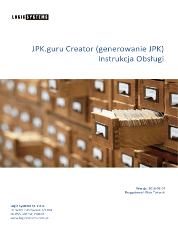 JPK.guru Creator (generowanie JPK) Instrukcja Obsługi Wersja: 2016-08-09 Przygotował: Piotr Tokarski Logic Systems sp. z o.o. Ul. Wały Piastowskie 1/1104 80-855 Gdańsk, Poland www.logicsystems.com.pl Spis treści 1 2 3 4 WSTĘP ..................................................................................................................................................................... 3 INSTALACJA I WYMAGANIA ..................................................................................................................................... 4 UTWORZENIE SZABLONU PLIKU JPK ......................................................................................................................... 5 STRUKTURA PLIKÓW EXCEL ..................................................................................................................................... 8 4.1 4.2 4.3 4.4 4.5 5 KSIĘGI RACHUNKOWE – JPK_KR..................................................................................................................................... 8 WYCIĄG BANKOWY – JPK_WB ...................................................................................................................................... 8 MAGAZYN – JPK_MAG ............................................................................................................................................... 8 EWIDENCJA ZAKUPU I SPRZEDAŻY VAT – JPK_VAT ............................................................................................................ 9 FAKTURY VAT – JPK_FA .............................................................................................................................................. 9 KONWERSJA ARKUSZY EXCEL DO FORMATU JPK .................................................................................................... 10 Logic Systems www.logicsystems.com.pl 2 JPK.guru Creator Instrukcja Użytkownika 1 Wstęp Jednolity Plik Kontrolny jest standardem definiującym postać danych przekazywanych organom podatkowym i kontroli skarbowej podczas czynności sprawdzających, kontroli podatkowych, postępowania podatkowego i kontrolnego. Dane przekazywane są w postaci plików XML o ściśle zdefiniowanej strukturze – ze względu na poziom jej skomplikowania ręczne przygotowanie pliku z posiadanych danych jest prawie niemożliwe. Rozwiązaniem jest narzędzie JPK.guru Creator, które pozwala na wstępne przygotowanie danych w prostym w obsłudze arkuszu Excela i jego konwersję do formatu spełniającego wymagania JPK. Dodatkowo aplikacja weryfikuje techniczną poprawność danych (m.in. czy daty i kwoty zapisane są w prawidłowym formacie). Logic Systems www.logicsystems.com.pl 3 JPK.guru Creator Instrukcja Użytkownika 2 Instalacja i wymagania Program JPK.guru Creator wymaga do pracy: .Net Framework w wersji przynajmniej 4.0 Microsoft Excel 2007 lub nowszy Windows 7 lub nowszy Program domyślnie dostarczany jest w wersji przenośnej, w formacie archiwum .zip, które wystarczy wypakować do wybranego folderu. Dla wygody użytkowników dostępna jest również wersja z instalatorem, która może sama utworzyć skróty w menu start i pulpicie, wymagająca uprawnień administratora na komputerze użytkownika. Program JPK.guru Creator obsługuje dane z następujących obszarów: Księgi rachunkowe, Wyciągi bankowe, Magazyn (przyjęcia, wydania na zewnątrz, rozchód wewnętrzny, przesunięcia międzymagazynowe), Ewidencja zakupu i sprzedaży VAT, Faktury VAT. Specyfikacje są zgodne z wersją opublikowaną dnia 22.06.2016, godz. 11:06. Logic Systems www.logicsystems.com.pl 4 JPK.guru Creator Instrukcja Użytkownika 3 Utworzenie szablonu pliku JPK Program JPK.guru Creator pozwala na wygenerowanie szablonów arkuszy Microsoft Excel (.xlsx lub .xls) dostosowanych do wymagań formatu JPK. W celu wygenerowania arkusza w najnowszym dostępnym szablonie należy: 1. Należy uruchomić program JPK.guru Creator przy pomocy skrótu w menu start lub ikony na pulpicie. Otworzy się okno: 2. Kliknąć symbol rozwinięcia listy (skierowany w dół trójkąt) po prawej stronie przycisku „Nowy szablon”. Wyświetli się lista: Logic Systems www.logicsystems.com.pl 5 JPK.guru Creator Instrukcja Użytkownika 3. Należy wybrać z listy typ JPK do wygenerowania, np. „Wyciąg bankowy (JPK WB)”. Otworzy się okno do wskazania lokalizacji do wygenerowania pliku: 4. Po wyborze lokalizacji, nazwy pliku i kliknięciu przycisku „Zapisz” zostanie wygenerowany i automatycznie otworzony plik, a w przypadku gdy plik docelowy już istnieje, wyświetli się pytanie o nadpisanie jego zawartości: Logic Systems www.logicsystems.com.pl 6 JPK.guru Creator Instrukcja Użytkownika Alternatywnie w celu wyboru typu JPK z pełnej listy należy: 1. Należy uruchomić program JPK.guru Creator przy pomocy skrótu w menu start lub ikony na pulpicie. Otworzy się okno: 2. Aby wygenerować pliki przycisk „Nowy szablon”. Wyświetli się okno: 3. Należy wprowadzić w nim nazwę i lokalizację pliku ręcznie bądź korzystając z przycisku przeglądaj (analogicznie do punktu 3 powyżej). W przypadku, gdy plik docelowy już istnieje, wyświetli się pytanie o nadpisanie jego zawartości. 4. Kliknięcie OK generuje szablon i o ile pole „Otwórz nowy szablon” było zaznaczone również go otwiera. Logic Systems www.logicsystems.com.pl 7 JPK.guru Creator Instrukcja Użytkownika 4 Struktura plików Excel Pliki Excel dla wszystkich obszarów składają się z arkusza ‘Nagłówek’ oraz arkuszy z danymi. Budowa pierwszego jest bardzo podobna, natomiast pozostałe arkusze dostosowane są do struktury plików JPK z danego obszaru. Nagłówek – arkusz ten składa się z kilku sekcji. Dwie sekcje są takie same dla wszystkich szablonów, natomiast niektóre szablony mają dodatkowe sekcje unikalne dla danego obszaru. W pierwszej sekcji ‘Nagłówek’ znajdują się dane ogólne dotyczące wygenerowanego pliku JPK, są to mi