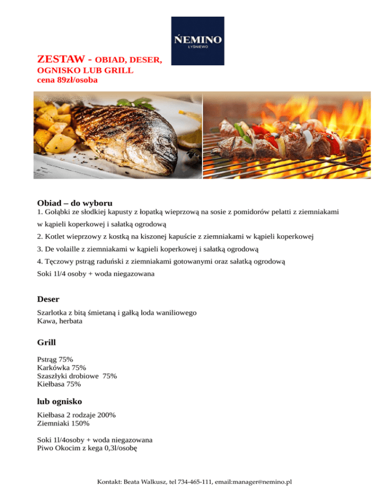 ZESTAW - OBIAD, DESER, OGNISKO LUB GRILL cena 89zł/osoba Obiad – do wyboru 1. Gołąbki ze słodkiej kapusty z łopatką wieprzową na sosie z pomidorów pelatti z ziemniakami w kąpieli koperkowej i sałatką ogrodową 2. Kotlet wieprzowy z kostką na kiszonej kapuście z ziemniakami w kąpieli koperkowej 3. De volaille z ziemniakami w kąpieli koperkowej i sałatką ogrodową 4. Tęczowy pstrąg raduński z ziemniakami gotowanymi oraz sałatką ogrodową Soki 1l/4 osoby + woda niegazowana Deser Szarlotka z bitą śmietaną i gałką loda waniliowego Kawa, herbata Grill Pstrąg 75% Karkówka 75% Szaszłyki drobiowe 75% Kiełbasa 75% lub ognisko Kiełbasa 2 rodzaje 200% Ziemniaki 150% Soki 1l/4osoby + woda niegazowana Piwo Okocim z kega 0,3l/osobę Kontakt: Beata Walkusz, tel 734-465-111, email:[email protected]