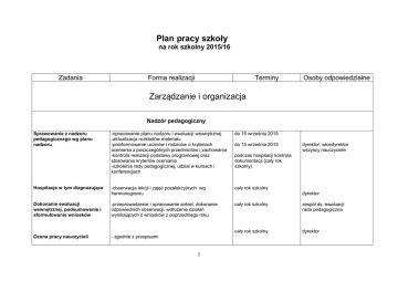 Plan pracy szkoły na rok szkolny 2015/16 Zadania Forma realizacji Terminy Osoby odpowiedzialne Zarządzanie i organizacja Nadzór pedagogiczny -opracowanie planu nadzoru i ewaluacji wewnętrznej -aktualizacja rozkładów materiału -poinformowanie uczniów i rodziców o kryteriach oceniania z poszczególnych przedmiotów i zachowania -kontrola realizacji podstawy programowej oraz stosowania kryteriów oceniania -szkolenia rady pedagogicznej, udział w kursach i konferencjach do 15 września 2015 -obserwacja lekcji i zajęć pozalekcyjnych wg. harmonogramu cały rok szkolny Dokonanie ewaluacji wewnętrznej, podsumowanie i sformułowanie wniosków -przeprowadzenie i opracowanie ankiet, dokonanie odpowiednich obserwacji, wdrożenie działań wynikających z wniosków z poprzedniego roku cały rok szkolny zespół ds. ewaluacji rada pedagogiczna cały rok szkolny dyrektor Ocena pracy nauczycieli - zgodnie z przepisami Sprawowanie z nadzoru pedagogicznego wg planu nadzoru Hospitacje w tym diagnozujące 1 do 15 września 2015 dyrektor, wicedyrektor wszyscy nauczyciele podczas hospitacji kontrola dokumentacji (cały rok szkolny) dyrektor Ocena dorobku zawodowego -zgodnie z przepisami czerwiec 2016 dyrektor Promocja szkoły i współpraca z lokalną społecznością Współpraca ze środowiskiem lokalnym -udział w imprezach organizowanych przez Urząd Dzielnicy -współpraca z innymi szkołami ( SP nr 217, LI LO, -współpraca z Biblioteką Publiczną -współpraca z Akademią Obrony Narodowej -współpraca z przedszkolami: Kubuś Puchatek i 376 -organizowanie zawodów sportowych dla innych szkół - organizowanie przedstawień teatralnych i koncertów muzyki klasycznej i filmowej w Bibliotece Publicznej cały rok szkolny wszyscy nauczyciele dyrekcja Prowadzenie strony internetowej -umieszczanie aktualnych informacji i relacji ze szkolnych cały rok szkolny Szkoły wydarzeń T. Orciuch Redagowanie gazetki szkolnej -gazetka „Pod lupą” cały rok szkolny I. Kietlińska Współpraca z lokalną prasą -przekazywanie informacji z wydarzeń szkolnych do lokalnej prasy cały rok szkolny I. Kietlińska Organizacja Podział zadań i ich realizacja -przydział czynności stałych i dodatkowych oraz kontrola cały rok szkolny ich realizacji -przydział wychowawstw i sal sierpień 2015 -analiza dokumentacji, lustracje, kontrole i obserwacje cały rok szkolny 2 dyrekcja -stwarzanie warunków do uzyskiwania kolejnych stopni awansu zawodowego -organizowanie szkoleń cały rok szkolny dyrekcja cały rok szkolny dyrekcja -kontrola obiektów pod względem bezpieczeństwa i higieny pracy -usuwanie usterek , remonty bieżące sierpień 2015 komisja powołana przez dyrektora, inspektor BHP, inspektor nadzoru budowlanego pracownicy techniczni Wyposażenie szkoły -zakup sprzętu i pomocy dydaktycznych wrzesień październik kierownik administracji -realizacja programów profilaktycznego i wychowawczego -zapewnienie bezpieczeństwa podczas zajęć, przerw i wycieczek cały rok szkolny dyrekcja, pedagog szkolny Zdrowie, higiena i bezpieczeństwo w szkole Rozwój zawodowy nauczycieli Warunki działalności szkoły na bieżąco wszyscy nauczyciele Kształcenie : Wzbogacanie oferty dydaktycznej - wykorzystanie komputerów i programów multimedialnych cały rok szkolny na różnych przedmiotach - wprowadzenie do planu lekcji dodatkowych lekcji z przedmiotów egzaminacyjnych - wprowadzenie dla klas II, IIIa i IIIb gimnazjum dodatkowych zajęć z j. angielskiego - wprowadzenie dla klas 5 PSP i II gimnazjum dodatkowych zajęć z j. niemieckiego i j. francuskiego - prowadzenie lekcji ortografii dla klas 4-6 - utworzenie kółek zainteresowań prowadzonych w j. angielskim, j. francuskim i j. niemieckim - warsztaty artystyczno – kulturowe w j. hiszpańskim ( kl. 16 PSP) - zajęcia z ceramiki ( kl. 1-3 ) 3 dyrekcja, wszyscy nauczyciele - zajęcia – gry i zabawy w j. niemieckim i j. francuskim( kl. 1-3) Stosowanie aktywizujących metod nauczania - na wszystkich lekcjach i zajęciach pozalekcyjnych, na których jest to potrzebne i możliwe -praca metodą projektu - cykle: „ Ziemia Kujawska – historia, kultura i tradycja” -podsumowanie udziału uczniów w konkursach i zawodach na różnych szczeblach -przeprowadzenie testów sprawdzających wiedzę i umiejętności uczniów we wszystkich klasach -sporządzenie zestawień wyników, ich analiza i wykorzystanie w dalszej pracy -analiza porównawcza wyników sprawdzianów zewnętrznych i egzaminów z ocenami szkolnymi -obserwacja umiejętności rozumowania i wykorzystania wiedzy w praktyce oraz stworzenie warunków do rozwoju takich procesów -diagnozowanie przyczyn trudności w nauce Dostosowanie wymagań -indywidualizacja procesu nauczania nauczania do możliwości -tworzenie zespołów pomocy psychologicznointelektualnych dziecka oraz pedagogicznej praca z uczniem o specjalnych - kierowanie uczniów na zajęcia wyrównawcze, potrzebach edukacyjnych korekcyjno-kompensacyjne i logopedyczne -konsultacje indywidualne -współpraca z poradnią PPP cały rok szkolny wszyscy nauczyciele styczeń i czerwiec 2016 zespoły klasowe i przedmiotowe nauczycieli Analiza osiągnięć uczniów cały rok szkolny cały rok szkolny wrzesień 2015 wszyscy nauczyciele cały rok szkolny wszyscy nauczyciele wrzesień cały rok szkolny wrzesień psycholog, pedagog wszyscy nauczyciele wrzesień cały rok szkolny cały rok szkolny -koła przedmiotowe Stwarzanie warunków dla -koła zainteresowań rozwoju uczniów uzdolnionych -konkursy przedmiotowe i zawody sportowe ( załącznikKonkursy wewnątrzszkolne ) -indywidualny program nauki dla wyjątkowo uzdolnionych uczniów: 1 uczeń z klasy III PG – matematyka i fizyka, 1 uczeń z klasy 5a PSP – j. francuski i matematyka, 1 uczeń z klasy 5b PSP - matematyka 4 cały rok szkolny dyrekcja wszyscy nauczyciele Rozwijanie zainteresowań, wiedzy i umiejętności uczniów Realizacja całorocznych projektów: - praca metodą projektu - cykl: „ Ziemi
