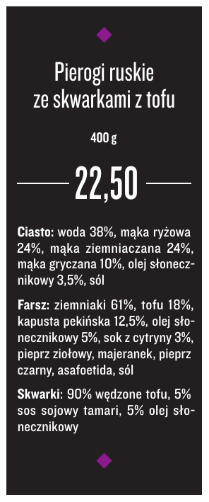 Pierogi ruskie ze skwarkami z tofu 400 g 22,50 Ciasto: woda 38%, mąka ryżowa 24%, mąka ziemniaczana 24%, mąka gryczana 10%, olej słonecznikowy 3,5%, sól Farsz: ziemniaki 61%, tofu 18%, kapusta pekińska 12,5%, olej słonecznikowy 5%, sok z cytryny 3%, pieprz ziołowy, majeranek, pieprz czarny, asafoetida, sól Skwarki: 90% wędzone tofu, 5% sos sojowy tamari, 5% olej słonecznikowy Pierogi z ciecierzycą i szpinakiem 400 g 22,50 Ciasto: woda 38%, mąka ryżowa 24%, mąka ziemniaczana 24%, mąka gryczana 10%, olej słonecznikowy 3,5%, sól Farsz: ciecierzyca 74%, szpinak 17%, suszone pomidory 4%, oliwa z oliwek 4%, przyprawa do pierogów (rozmaryn, tymianek, gałka muszkatołowa), sól Pierogi z soczewicą i truflową nutą 400 g 22,50 Ciasto: woda 38%, mąka ryżowa 24%, mąka ziemniaczana 24%, mąka gryczana 10%, olej słonecznikowy 3,5%, sól Farsz: soczewica zielona 70%, pieczarki 16%, seler 6,5%, olej słonecznikowy 5%, oliwa truflowa 2%, pieprz ziołowy, sól Pierogi z kapustą i grzybami 400 g 22,50 Ciasto: woda 38%, mąka ryżowa 24%, mąka ziemniaczana 24%, mąka gryczana 10%, olej słonecznikowy 3,5%, sól Farsz: kapusta kiszona 80%, koncentrat grzybowy 12%, olej słonecznikowy 6%, liść laurowy, jałowiec, ziele angielskie, kolendra, kminek, pieprz czarny, sól Naleśniki gryczane z konfiturą marchwiowo-pomarańczową 300 g 19,00 Ciasto: woda 76%, mąka gryczana 12%, mąka ziemniaczana 9%, siemię lniane 3%, olej słonecznikowy, sól Nadzienie: marchew 50%, pomarańcze 30%, cytryna 7,5%, cukier trzcinowy 7,5 %, mleko kokosowe 4,5%, kardamon, skórka pomarańczowa, melasa z karobu Naleśniki gryczane z konfiturą dyniowo-pomarańczową 300 g 19,00 Ciasto: woda 76%, mąka gryczana 12%, mąka ziemniaczana 9%, siemię lniane 3%, olej słonecznikowy, sól Nadzienie: dynia 50%, pomarańcze 30%, cytryna 7,5%, cukier trzcinowy 7,5 %, mleko kokosowe 4,5%, kardamon, skórka pomarańczowa, melasa z karobu Naleśniki gryczane z konfiturą jabłkowo-bananową 300 g 19,00 Ciasto: woda 76%, mąka gryczana 12%, mąka ziemniaczana 9%, siemię lniane 3%, olej słonecznikowy, sól Nadzienie: jabłka 82%, banany 11%, cukier trzcinowy 6,5%, sok z cytryny, cynamon, goździki, melasa z karobu Kotlety z soczewicy z kremem chrzanowo-wiśniowym 80 g 6,00 Kotlety: zielona soczewica 48%, ryż brązowy okrągły 47%, mąka ryżowa 3%, siemię lniane 1%, olej słonecznikowy, pieprz ziołowy, pieprz czarny, sól Krem: chrzan 60%, konfitura wiśniowa 36%, kleik ryżowy 3%, mleko kokosowe 1% Kotlety grochowo-jaglane z sosem musztardowym 80 g 6,00 Kotlety: żółty groch 65%, kasza jaglana 14%, pieczarki 8%, seler 8%, mąka kukurydziana 2%, siemię lniane 2%, olej słonecznikowy, pieprz czarny, kminek, tymianek, rozmaryn, gałka muszkatołowa, sól Sos: musztarda 62%, olej lniany 21%, melasa z karobu 17% Gnocchi z sosem pomidorowo-serowym 550 g 22,50 Gnocchi: ziemniaki 75%, mąka kukurydziana 12%, mąka ziemniaczana 10%, siemię lniane 1,5% Sos: woda 52%, ser wegański Violife 20%, pomidory w zalewie 16%, oliwki zielone w zalewie 6%, koncentrat pomidorowy 5,5%, zioła prowansalskie, pieprz ziołowy, oregano, sól Gnocchi z sosem szpinakowo-serowym 550 g 22,50 Gnocchi: ziemniaki 75%, mąka kukurydziana 12%, mąka ziemniaczana 10%, siemię lniane 1,5% Sos: woda 52%, szpinak 19,5%, ser wegański Violife 15%, mleko kokosowe 13%, oliwa truflowa, pieprz czarny, rozmaryn, gałka muszkatołowa, sól Bigos 600 g 22,50 Skład: kapusta kiszona 60%, kotlety sojowe 16%, pieczarki 15,5%, śliwki wędzone 3%, powidła śliwkowe 3%, koncentrat pomidorowy 1%, ocet balsamiczny, olej rzepakowy, liść laurowy, ziele angielskie, jałowiec, pieprz ziołowy, pieprz czarny, majeranek, cząber, sól Danie à la ryba po grecku 600 g 30,00 Skład: kotlety sojowe 22%, marchew 14%, sok pomidorowy (passata) 13%, woda 12,5%, koncentrat pomidorowy 10%, seler 7%, pietruszka 7%, kapusta pekińska 7%, olej rzepakowy 4%, ocet 2,5%, mąka kukurydziana, cukier, sos sojowy tamari, ziele angielskie, liść laurowy, pieprz ziołowy, pieprz czarny, asafoetida, sól Danie à la kaczka z jabłkami 600 g 30,00 Skład: kotlety sojowe 39%, jabłka 55%, sos sojowy tamari 3%, melasa z karobu 2%, majeranek, pieprz czarny, sok z cytryny, cukier trzcinowy, olej słonecznikowy, sól Danie à la gyros & sos tzatziki 500 g 30,00 Skład: kotlety sojowe 77%, sos sojowy tamari 10,5%, olej słonecznikowy 9%, melasa z karobu 3,5%, słodka czerwona papryka, oregano, tymianek, cząber, kolendra, kozieradka, czarny pieprz, gorczyca, gałka muszkatołowa, chili, cynamon Sos: tofu 41%, mleko kokosowe 27,5%, ogórek kiszony 17%, sok z cytryny 14%, oliwa truflowa, pieprz czarny, asafoetida, sól Sznycel ziemniaczany z sosem grzybowym 550 g 22,50 Sznycel: ziemniaki 76%, woda 12%, ser wegański Violife 7%, zielone oliwki 3%, siemię lniane, mąka kukurydziana, pieprz czarny, gałka muszkatołowa, bezglutenowa bułka tarta, olej słonecznikowy, sól Sos: woda 53%, śmietanka sojowa 32%, koncentrat grzybowy 8%, olej słonecznikowy 6%, sos sojowy tamari, mąka ziemniaczana, ziele angielskie, liść laurowy, pieprz czarny, gałka muszkatołowa, sól Bliny gryczane 300 g 15,00 Skład: woda 68%, mąka gryczana 31%, siemię lniane, drożdże, cukier, sól Zupa minestrone 900 ml 20,00 Skład: woda 56%, cukinia 7%, papryka 3%, seler 6%, marchew 6%, pietruszka 3%, ziemniaki, przecier pomidorowy 15%, oliwki zielone 2%, pieprz ziołowy, kminek, papryka suszona wędzona, chili, papryka słodka sproszkowana, pieprz czarny, przyprawa prowansalska, oliwa z oliwek, olej słonecznikowy, sól Zupa krem z zielonego groszku 900 ml 20,00 Skład: groszek zielony z zalewą 45%, woda 34%, ziemniaki 15%, mleko kokosowe 3%, oliwa truflowa, sos sojowy tamari, natka pietruszki, koperek, tymianek, pieprz czarny, curry, cząber, sól, prażone płatki migdałów Grochówka 900 ml 20,00 Skład: woda 65%, groch żółty 8%, ziemniaki 10%, marchew 6%, seler 5%, pietruszka 3%, śliwki wędzone 1,5%, liś