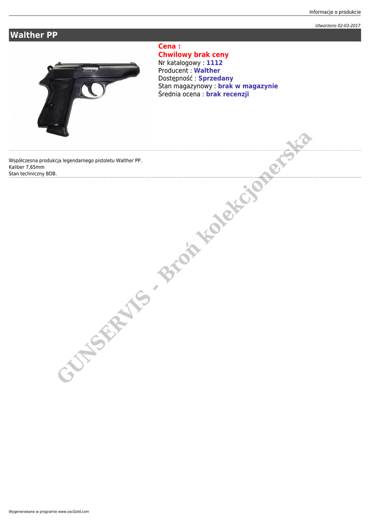 Informacje o produkcie Utworzono 02-03-2017 Walther PP Cena : Chwilowy brak ceny sk a Nr katalogowy : 1112 Producent : Walther Dostępność : Sprzedany Stan magazynowy : brak w magazynie Średnia ocena : brak recenzji G U N SE R VI S -B ro ń ko l ek cj on er Współczesna produkcja legendarnego pistoletu Walther PP. Kaliber 7,65mm Stan techniczny BDB. Wygenerowano w programie www.oscGold.com