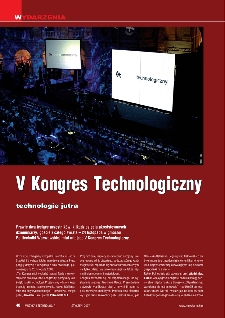 Foto: Trias WYDARZENIA V Kongres Technologiczny technologie jutra Prawie dwa tysiące uczestników, kilkudziesięciu akredytowanych dziennikarzy, goście z całego świata – 24 listopada w gmachu Politechniki Warszawskiej miał miejsce V Kongres Technologiczny. W związku z tragedią w kopalni Halemba w Rudzie Śląskiej i trwającą żałobą narodową władze Plusa podjęły decyzję o rezygnacji z dnia otwartego, planowanego na 25 listopada 2006. „Ten Kongres miał wyglądać inaczej. Także moje wystąpienie miało być inne. Kongres był pomyślany jako święto nauki i technologii. Przeżywamy jednak w kraju tragedię i nie czas na świętowanie. Nawet, jeżeli miałoby ono dotyczyć technologii.” – powiedział, witając gości, Jarosław Bauc, prezes Polkomtela S.A. 40 MUZYKA I TECHNOLOGIA Program całej imprezy został mocno okrojony. Zrezygnowano z dnia otwartego, podczas którego każdy mógł wejść i zapoznać się z nowinkami technicznymi nie tylko z dziedziny telekomunikacji, ale także inżynierii biomedycznej i materiałowej. Kongres rozpoczął się od wspomnianego już wystąpienia prezesa Jarosława Bauca. Przemówienie dotyczyło współpracy sieci z innymi firmami na polu rozwiązań mobilnych. Podczas sesji plenarnej wystąpił także znakomity gość, prezes Nokii, pan STYCZEŃ 2007 Olli-Pekka Kallasvuo. Jego wykład traktował (co nie było trudne do przewidzenia) o telefonii komórkowej jako najdynamiczniej rozwijającym się sektorze gospodarki na świecie. Rektor Politechniki Warszawskiej, prof. Włodzimierz Kurnik, witając gości Kongresu podkreślił wagę partnerstwa między nauką, a biznesem. „Wynalazek bez wdrożenia nie jest innowacją” – podkreślił profesor Włodzimierz Kurnik, wskazując na konieczność finansowego zaangażowania się w badania naukowe www.muzyka-tech.pl Foto: Trias Stanowisko specjalistów od mulitmediów firm prywatnych tak, aby obie strony korzystały na tej współpracy dla dobra swoich społeczności. Rektor zaznaczył też, że warszawska uczelnia ma ambicje stania się uniwersytetem trzeciej generacji, w którego laboratoriach będą powstawały wynalazki znajdujące powszechne zastosowanie, dzięki ich upowszechnieniu przez biznes. Szczerze powiedziawszy przemówienie rektora było mi, jako studentowi PW, najbliższe, chociaż wiem, że niestety w praktyce współpraca pomiędzy firmami a pracownikami uczelni jest często tylko fikcją. diodowy Barco-ILite XP o rozmiarach 6x 3,8 metra, zamontowany w ramie na rolkach, co umożliwiło rozdzielenie go na 2 części i rozsuniecie na odległość 10 metrów. Po obu stronach sceny umieszczono ekrany wyświetlające obrazy z projektorów. Gdy włączono wizualizacje wyświetlane na ścianach auli, postanowiłem udać się na pierwsze piętro, gdzie mieściło się stanowisko specjalistów od mulitmediów z firmy Trias. Od nich dowiedziałem się mnóstwa szczegółów dotyczących pracy przy obsłudze Kongresu. Obrazy na ścianach były rzucane z 6 projektorów: przód i tył obsługiwały urządzenia Christie o mocy 16 tys. ANSI lumenów, natomiast boki – cztery projektory Sanyo, łączone po dwa, każdy o mocy 10 tys. ANSI lumenów. Całość sterowana była przy pomocy dwóch połączonych ze sobą stacji roboczych, wyposażonych w system Wings Platinium. Niestety, z powodu żałoby narodowej tylko część z przygotowanych wizualizacji mogła być zaprezentowana szerszej publiczności. Miałem przyjemność obejrzeć cały program na próbie. Jak tłumaczył mi Maciej Cłapiński z Triasu, odpowiedzialny za kontakty z klientami, prace nad dopasowaniem wyświetlanych grafik do architektury budynku trwały nieprzerwanie przez kilka dni. Obok stanowiska obsługi tego, co jest aktualnie wyświetlane na ścianach budynku, znajdowały się stanowiska obsługi ekranów znajdujących się na Obrazy na ścianach były rzucane z 6 projektorów: przód i tył obsługiwały urządzenia Christie o mocy 16 tys. ANSI lumenów, natomiast boki – cztery projektory Sanyo, łączone po dwa, każdy o mocy 10 tys. ANSI lumenów. Całość sterowana była przy pomocy dwóch połączonych ze sobą stacji roboczych, wyposażonych w system Wings Platinium. Kongres kongresem, przemówienia przemówieniami, ale do Auli Głównej PW przyciągnęły nas trochę inne zagadnienia. Podczas gdy profesorowie i biznesmeni rozprawiali o kosmicznych technologiach, w ich pobliżu stał sprzęt i byli obecni ludzie, dla których najnowocześniejsze techniki to codzienność. Mam na myśli ekipy odpowiedzialne za obsługę tej imprezy, wykorzystujące to, co wymyślają inżynierowie w swojej codziennej pracy. Mówiąc o technologiach, nie można zapomnieć o ich odpowiedniej prezentacji, która da poczucie pewności, że mamy do czynienia z rzeczami przełomowymi, wykraczającymi poza to, co dotychczas uważaliśmy za nowoczesne. Nic więc dziwnego, że najważniejszą rolę w oprawie Kongresu musiały odgrywać multimedia. Za tę istotną cześć Kongresu odpowiedzialna była toruńska firma Trias, która posiada duże doświadczenie w obsłudze wizualizacyjnej największych imprez w Polsce. Już przy wejściu do Gmachu Głównego, w korytarzach zawieszono duże, 42-calowe ekrany plazmowe, na których można było obserwować przemówienia gości. Muszę przyznać, że po wejściu do Auli Głównej byłem pod wrażeniem zamontowanego sprzętu. Zacznę może od samego dołu. Pod przezroczystą podłogą z pleksi umieszczone zostały 24 ekrany plazmowe Fujitsu, każdy o przekątnej 42 cali, na których wyświetlane były wcześniej przygotowane wizualizacje. Efekt niesamowity, choć akurat słowo „niesamowity” powinienem zarezerwować na później. Na scenie, w centralnej jej części, umieszczono ekran Foto: Trias Multimedia STYCZEŃ 2007 MUZYKA I TECHNOLOGIA 41 WYDARZENIA Foto: Trias scenie oraz kamer. Suma ze stołu Data Video SE800, miksującego obraz dostarczany przez 4 kamery Sony HDV sz