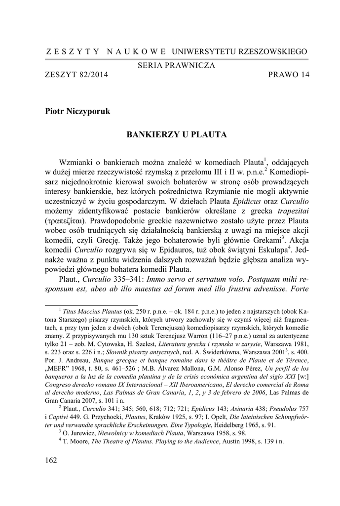 Z E S Z Y T Y N A U K O W E UNIWERSYTETU RZESZOWSKIEGO SERIA PRAWNICZA ZESZYT 82/2014 PRAWO 14 Piotr Niczyporuk BANKIERZY U PLAUTA Wzmianki o bankierach można znaleźć w komediach Plauta1, oddających w dużej mierze rzeczywistość rzymską z przełomu III i II w. p.n.e.2 Komediopisarz niejednokrotnie kierował swoich bohaterów w stronę osób prowadzących interesy bankierskie, bez których pośrednictwa Rzymianie nie mogli aktywnie uczestniczyć w życiu gospodarczym. W dziełach Plauta Epidicus oraz Curculio możemy zidentyfikować postacie bankierów określane z grecka trapezitai (τραπεζίται). Prawdopodobnie greckie nazewnictwo zostało użyte przez Plauta wobec osób trudniących się działalnością bankierską z uwagi na miejsce akcji komedii, czyli Grecję. Także jego bohaterowie byli głównie Grekami3. Akcja komedii Curculio rozgrywa się w Epidauros, tuż obok świątyni Eskulapa4. Jednakże ważna z punktu widzenia dalszych rozważań będzie głębsza analiza wypowiedzi głównego bohatera komedii Plauta. Plaut., Curculio 335–341: Immo servo et servatum volo. Postquam mihi responsum est, abeo ab illo maestus ad forum med illo frustra advenisse. Forte 1 Titus Maccius Plautus (ok. 250 r. p.n.e. – ok. 184 r. p.n.e.) to jeden z najstarszych (obok Katona Starszego) pisarzy rzymskich, których utwory zachowały się w czymś więcej niż fragmentach, a przy tym jeden z dwóch (obok Terencjusza) komediopisarzy rzymskich, których komedie znamy. Z przypisywanych mu 130 sztuk Terencjusz Warron (116–27 p.n.e.) uznał za autentyczne tylko 21 – zob. M. Cytowska, H. Szelest, Literatura grecka i rzymska w zarysie, Warszawa 1981, s. 223 oraz s. 226 i n.; Słownik pisarzy antycznych, red. A. Świderkówna, Warszawa 20013, s. 400. Por. J. Andreau, Banque grecque et banque romaine dans le théâtre de Plaute et de Térence, „MEFR” 1968, t. 80, s. 461–526 ; M.B. Álvarez Mallona, G.M. Alonso Pérez, Un perfil de los banqueros a la luz de la comedia plautina y de la crisis económica argentina del siglo XXI [w:] Congreso derecho romano IX Internacional – XII Iberoamericano, El derecho comercial de Roma al derecho moderno, Las Palmas de Gran Canaria, 1, 2, y 3 de febrero de 2006, Las Palmas de Gran Canaria 2007, s. 101 i n. 2 Plaut., Curculio 341; 345; 560, 618; 712; 721; Epidicus 143; Asinaria 438; Pseudolus 757 i Captivi 449. G. Przychocki, Plautus, Kraków 1925, s. 97; I. Opelt, Die lateinischen Schimpfwörter und verwandte sprachliche Erscheinungen. Eine Typologie, Heidelberg 1965, s. 91. 3 O. Jurewicz, Niewolnicy w komediach Plauta, Warszawa 1958, s. 98. 4 T. Moore, The Theatre of Plautus. Playing to the Audience, Austin 1998, s. 139 i n. 162 aspicio militem. Aggredior hominem, saluto adveniens. ‘salve’ inquit mihi, prendit dexteram, seducit, rogat quid veniam Cariam; dico me illo advenisse animi causa. ibi me interrogat, ecquem in Epidauro Lyconem tarpezitam noverim. Dico me novisse. ‘Quid? lenonem Cappadocem?’ Annuo visitasse. ‘Sed quid eum vis?’ ‘Quia de illo emi virginem triginta minis, vestem, aurum; et pro is decem coaccedunt minae’. ‘Dedisti tu argentum?’ inquam. ‘Immo apud trapezitam situm est illum quem dixi Lyconem, atque ei mandavi, qui anulo meo tabellas obsignatas attulisset, ut daret operam, ut mulierem a lenone cum auro et veste abduceret’. Bogaty oficer Terapontigonus Platagidor kupuje od Kappadoxa służącą, przeznaczoną na heterę Planezjum za trzydzieści min, uiszczając jedynie część ceny. Pozostałą kwotę transakcji, a mianowicie – dziesięć min miał Kapadoxowi wypłacić bankier – Terapontigonusa Platagidora z Epidauros, niejaki Lykon5. Wiadomości dotyczące transakcji oraz sposób zapłaty wyciągnął od oficera sprytny Curculio przy obiedzie suto zakrapianym winem. Ponadto, korzystając z upojenia alkoholowego współbiesiadnika, zabrał on sygnet Terapontigonusa i uciekł. O swych przygodach Curculio opowiedział natomiast swemu przyjacielowi Fedromusowi. Zatem w komedii Curculio spotykamy się z czynnościami o charakterze bankierskim wykonywanymi przez osobę, wobec której stosuje się zlatynizowaną z grecka brzmiącą nazwę trapezitai. Trzeba zaznaczyć, że Plaut tłumaczył na łacinę komedie greckie, dostosowując je do rzymskich realiów. Zatem użycie słowa trapezitai może też świadczyć o celowym zabiegu autora, a mianowicie przejęciu do swego utworu oryginalnego terminu, bez poszukiwania łacińskiego odpowiednika. Zabieg komediopisarza może być dowodem na to, że w źródłach zawód bankierski najczęściej określano grecko brzmiącą nazwą trapezitae (τραπεζίται, τραπεζίτης)6, a w zlatynizowanej formie występowała ona jako trapessita, tarpezita7, tarpessita8 czy trapedzitas9. Co więcej, pocho5 Plaut., Curculio 560. Por. Plaut., Curculio 715–720. A.C. Johnson, Roman Egypt to the Reign of Diocletian, Baltimore 1936, s. 445 i n.; A.C. Johnson, L.C. West, Byzantine Egypt: Economic Studies, Princeton 1949, s. 172; C. Roueché, ‘Aurarii’ in the Auditoria, „ZPE” 1995, t. 105, s. 40; F. Carlà, A. Marcone, Econamia e finanza a Roma, Bologna 2011, s. 100. 7 O formie tarpezita zob. rozważania A. Ernout, Aspects du vocabulaire latin, Paris 1954, s. 64; J. Collart, T. Maccius Plautus, Curculio, Paris 1962, s. 71, nota do wersu 341. 8 A. Ernout, Aspects du vocabulaire latin, cit., s. 64; L. Nadjo, L’argent et les affaires à Rome des origines au IIe siècle avant J.-C. Étude d’un vocabulaire technique, Paris 1989, s. 211, przyp. 2. 9 M. Mielczarek terminem trapedzitas określał bankiera sprawdzającego monety, dokonującego wymiany, udzielającego pożyczki czy przyjmującego depozyt. Na bank używa określenia trapedza, co jego zdaniem odnosi się do stołu, na którym dokonywano transakcji – por. M. Mielczarek, O teorii pieniądza i praktyce instytucji banku w starożytnej Grecji doby klasycznej [w:] Pieniądz i banki – wspólnota dzie