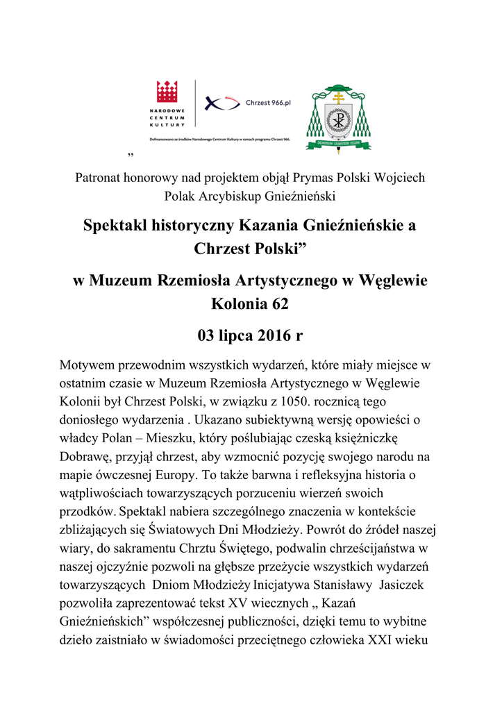 „ Patronat honorowy nad projektem objął Prymas Polski Wojciech Polak Arcybiskup Gnieźnieński Spektakl historyczny Kazania Gnieźnieńskie a Chrzest Polski” w Muzeum Rzemiosła Artystycznego w Węglewie Kolonia 62 03 lipca 2016 r Motywem przewodnim wszystkich wydarzeń, które miały miejsce w ostatnim czasie w Muzeum Rzemiosła Artystycznego w Węglewie Kolonii był Chrzest Polski, w związku z 1050. rocznicą tego doniosłego wydarzenia . Ukazano subiektywną wersję opowieści o władcy Polan – Mieszku, który poślubiając czeską księżniczkę Dobrawę, przyjął chrzest, aby wzmocnić pozycję swojego narodu na mapie ówczesnej Europy. To także barwna i refleksyjna historia o wątpliwościach towarzyszących porzuceniu wierzeń swoich przodków. Spektakl nabiera szczególnego znaczenia w kontekście zbliżających się Światowych Dni Młodzieży. Powrót do źródeł naszej wiary, do sakramentu Chrztu Świętego, podwalin chrześcijaństwa w naszej ojczyźnie pozwoli na głębsze przeżycie wszystkich wydarzeń towarzyszących Dniom Młodzieży Inicjatywa Stanisławy Jasiczek pozwoliła zaprezentować tekst XV wiecznych „ Kazań Gnieźnieńskich” współczesnej publiczności, dzięki temu to wybitne dzieło zaistniało w świadomości przeciętnego człowieka XXI wieku zamiast pokrywać się „pyłem zapomnienia” na muzealnej półce. Po Kazaniach świętokrzyskich stanowią najstarszy zabytek polskiej prozy kaznodziejskiej i jeden z najważniejszych zabytków języka polskiego. Rękopis kazań zachował się w bibliotece kapituły katedralnej w Gnieźnie. W tym miejscu należy zaznaczyć, że zarówno muzykę do Kazań Gnieźnieńskich jak i Świętokrzyskich napisał Józef Skrzek. Muzeum Rzemiosła Artystycznego w Węglewie Kolonii zorganizowało: - Warsztaty artystyczne Chrzest Polski dla uczniów szkół z powiatu konińskiego ukazany w rzeźbie i hafcie dla około 500 uczestników - Międzynarodowy plener malarsko rzeźbiarski podczas którego 8 artystów wykonywało scenografię od spektaklu. - Spektakl historyczny „ Kazania Gnieźnieńskie a Chrzest Polski”- finałowy koncert Józefa Skrzeka wieńczący niezwykłe wydarzenie . Podczas gali finałowej widownię zapełniła 500 osobowa publiczność. Wraz z nim wystąpiła Beata Mańkowska. Jest to wynik rewelacyjny. Mogliśmy w ten sposób powiązać ze sobą patriotyzm , historię, edukację, sztukę, muzykę oraz sport i turystykę. Nie zabrakło również akcji charytatywnej i promowania idei wolontariatu. Okazuje się ,że w małej miejscowości, jaką jest Węglew można zdziałać dużo. Zaciekawieni mieszkańcy z dużą ochotą korzystają z takiej plenerowej formy kultury- kultury przez duże „K”. Na spektakl oprócz mieszkańców przybyli : Burmistrz Miasta Goliny Mirosław Durczyński, Przewodnicząca Rady Miejskiej w Golinie Urszula Furmaniak, radni, sołtysi, politycy- poseł Tomasz Nowak, przedstawiciele Urzędu Miasta Konin, Dyrektor Domu Kultury w Golinie, Dyrektor Muzeum Etnograficznego z Poznania, i turyści z wielu bliższych i dalszych okolic. Był to efekt 5 letniej działalności Stowarzyszenia Kulturalnego Tradycja i 25 letniej pracy artystycznej Stanisławy Jasiczek W dniu 03 lipca 2016 roku w Parku Ginących Zawodów i Tradycji przy Muzeum Rzemiosła Artystycznego w Węglewie Kolonii odbył się „Spektakl historyczny Kazania Gnieźnieńskie a Chrzest Polski”. Program był bardzo bogaty i przyciągnął zaciekawioną widownię: 1.Powitanie gości przez Orkiestrę dętą OSP z Kawnic pod kierownictwem pana Zbigniewa Żarczyńskiego 2.Wykład dr nauk humanistycznych w zakresie historii Krzysztofa Witkowskiego na temat rozwoju chrześcijaństwa 3. Widowisko artystyczne obrazujące Chrzest Polski przygotowane przez uczniów SP w Golinie pod kierunkiem sióstr zakonnych z Goliny 4. Koncert skrzypcowy znakomicie uzupełniony wokalem Viry Bilyachat ze Lwowa na Ukrainie. 5. Recytacja fragmentów Kazań Gnieźnieńskich przez nauczycieli Szkoły Podstawowej w Kawnicach 6.Koncert Chóru męskiego Fratres z Koła pod kierownictwem Arkadiusza Słysza 7.Wykład „ Kazania Gnieźnieńskie” wygłoszony przez Stanisławę Jasiczek pasjonatkę tradycji i właścicielkę Muzeum Rzemiosła Artystycznego w Węglewie Kolonii 8.Koncert chóru „ Consolare” z Kawnic pod kierownictwem Izabeli Goździkowskiej 9.Podziękowanie za udział w spektaklu. Godz. 18;00 Koncert Galowy- premiera muzyki do XV w Kazań Gnieźnieńskich muzyka : Józef Skrzek wykonanie : Józef Skrzek, Beata Mańkowska Scenariusz i pomysłodawca projektu Stanisława Jasiczek Reżyseria i prowadzenie Sławomir Papiera Produkcja filmu : TV Wielkopolska- Telewizja Informacyjna Wsparli nas: Nadleśnictwo Konin Starostwo Powiatowe Konin Burmistrz Goliny Dom Kultury w Golinie Imprezy towarzyszące: Podczas spektaklu odbyła się zbiórka publiczna pod hasłem „Wózek dla Tereski”, Tereska Żuk, która urodziła się w Węglewie, ma stwardnienie rozsiane i jaskrę obuoczną. Wszystkim ofiarodawcom serdecznie dziękujemy. - Odsłonięcie pomnika „Kazania Gnieźnieńskie a Chrzest Polski, „ Pomnik odsłonią: Burmistrz Goliny Mirosław Durczyński, Przewodnicząca Rady Miejskiej Urszula Furmaniak i Prezes Stowarzyszenia Kulturalnego Tradycja Stanisława Jasiczek oraz ksiądz Paweł Śmigiel miłośnik i kolekcjoner sztuki Pomnik wykonali artyści rzeźbiarze : Mariusz Opoka, Marcin Różycki , Юрась Камандзірчык, Wojciech Grzędowski. Scenografię do spektaklu przygotowali Stanisława Jasiczek, Janina Kloc, Helena Perkowska, Zofia Wawrzyniak Wystawa plakatu wykonanego przez uczniów SP w Kawnicach - Wystawa prac plastycznych wykonanych przez uczniów SP Gminy Golina, - Wystawa lokalnej malarki Marii Leśniewskiej, Sylwestra Rutkowskiego oraz Gabrieli Kozłowskiej - Wystawa malarska członków Stowarzyszenia Kulturalnego Tradycja- Stanisławy Jasiczek, Marzeny Cierzniak, Janiny Kloc, Zofii Wawrzyniak - Wy